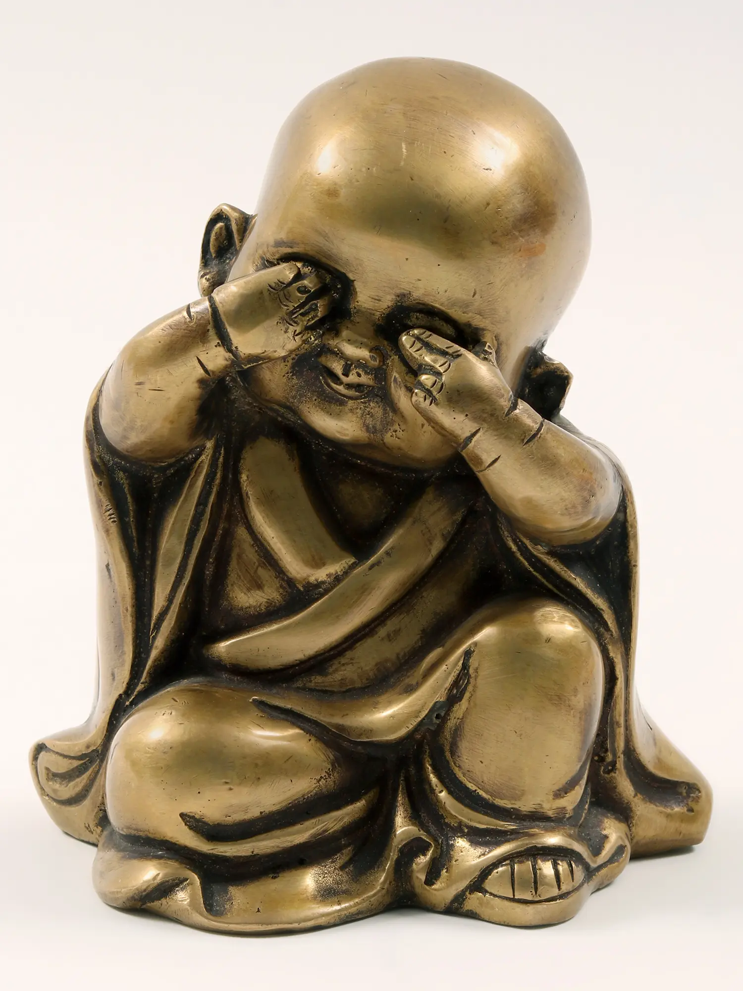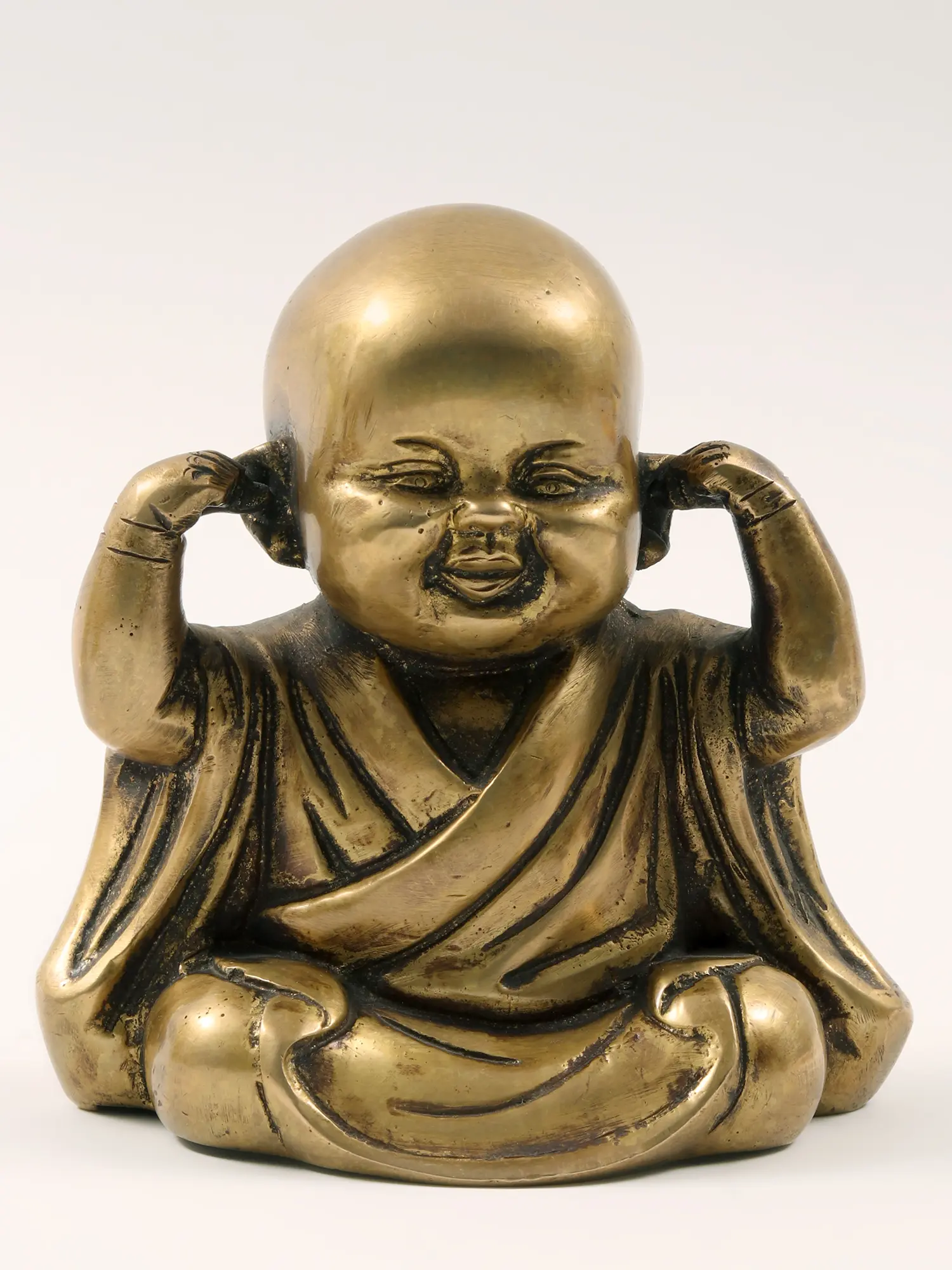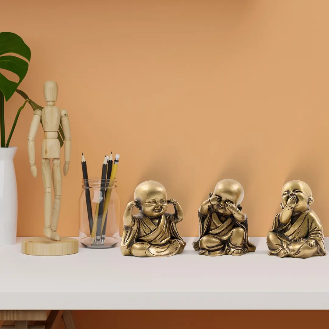 Cute Buddha or monk statues, like this Small Set of Three Wise Monks Baby Buddha Statues in Brass, serve as poignant symbols conveying profound wisdom and ethical teachings. Adorned in a playful rendition of "Hear No Evil, See No Evil, Speak No Evil," these statues use adorable aesthetics to propagate meaningful philosophies.