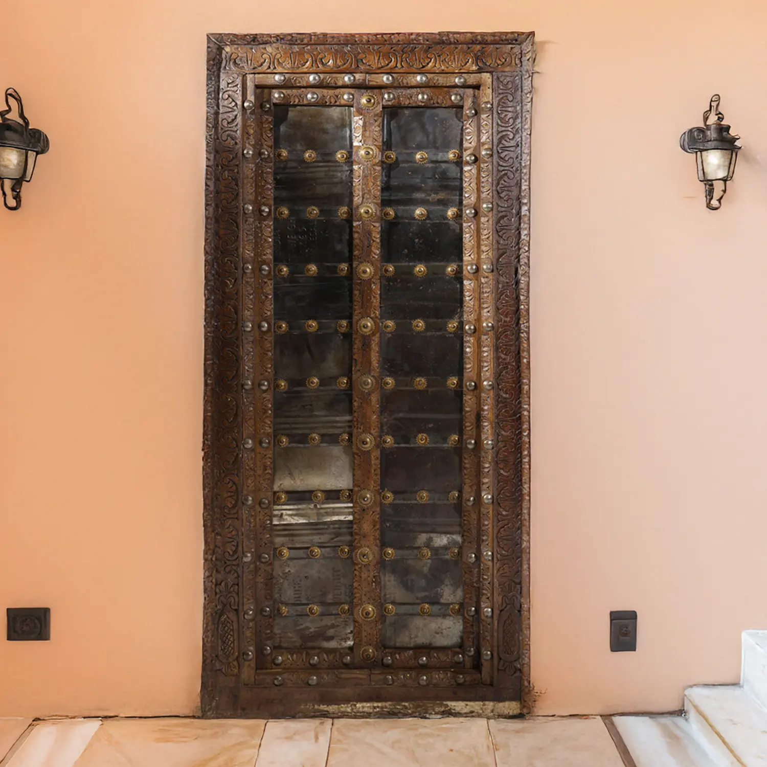 The sturdy wooden frame, weathered by time, showcases ironwork and brass embellishments that exude an eternal charm. Each detail tells a story of skilled artisans who meticulously carved patterns and motifs, creating a door that stands as an emblem of grandeur and rich tradition.