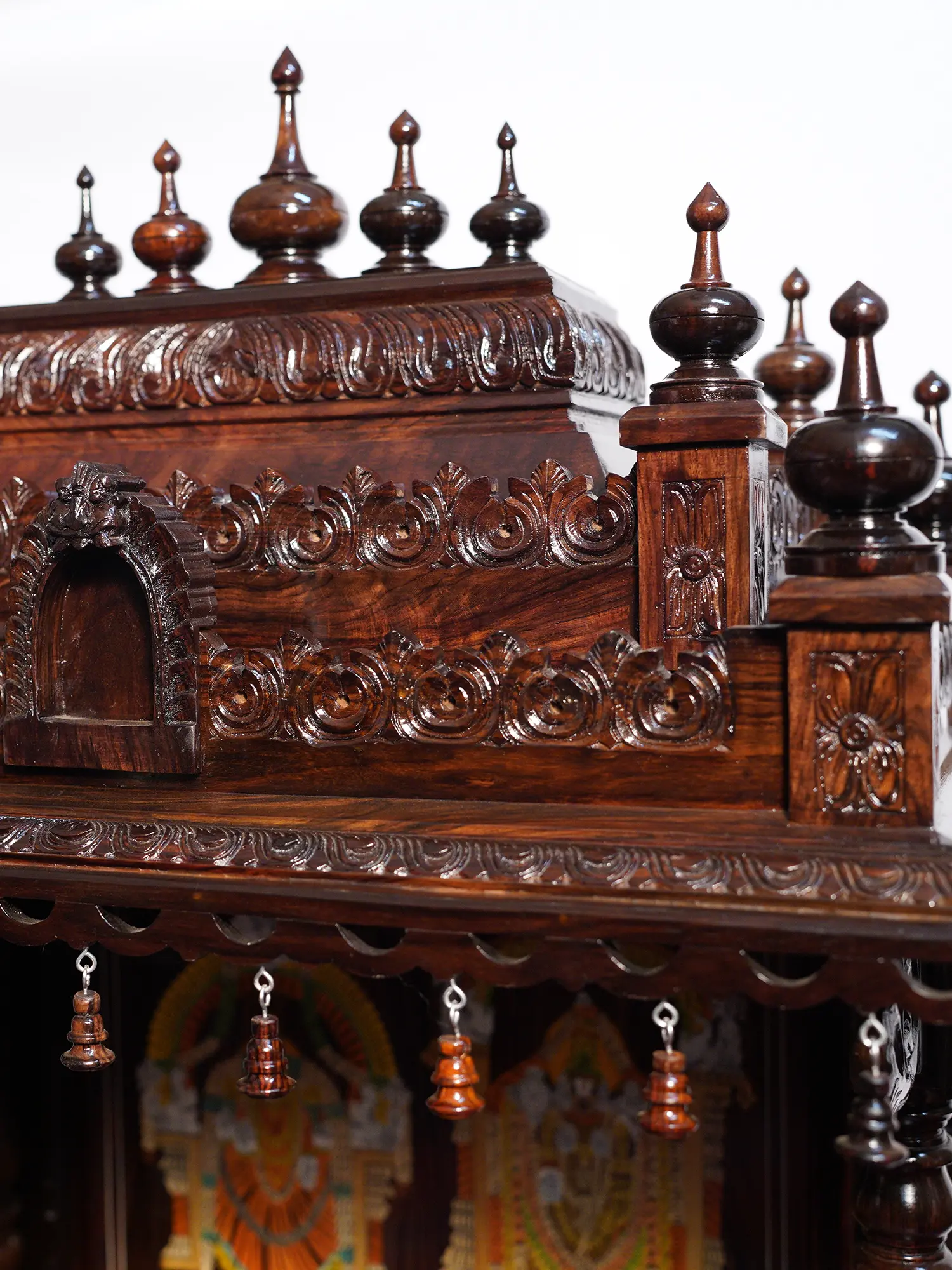 Elevate your sacred space with this exquisite puja temple, a testament to fine craftsmanship and devotion. More than just a piece of furniture, it's a meticulously designed sanctuary, intended to foster a sense of tranquility and connection with the divine. The rich, deep tones of the rosewood create an ambiance of warmth and reverence, inviting you to pause and reflect. Every detail, from the carved embellishments to the delicate bells, speaks of dedication and artistry, making this temple a centerpiece of spiritual practice and aesthetic beauty.