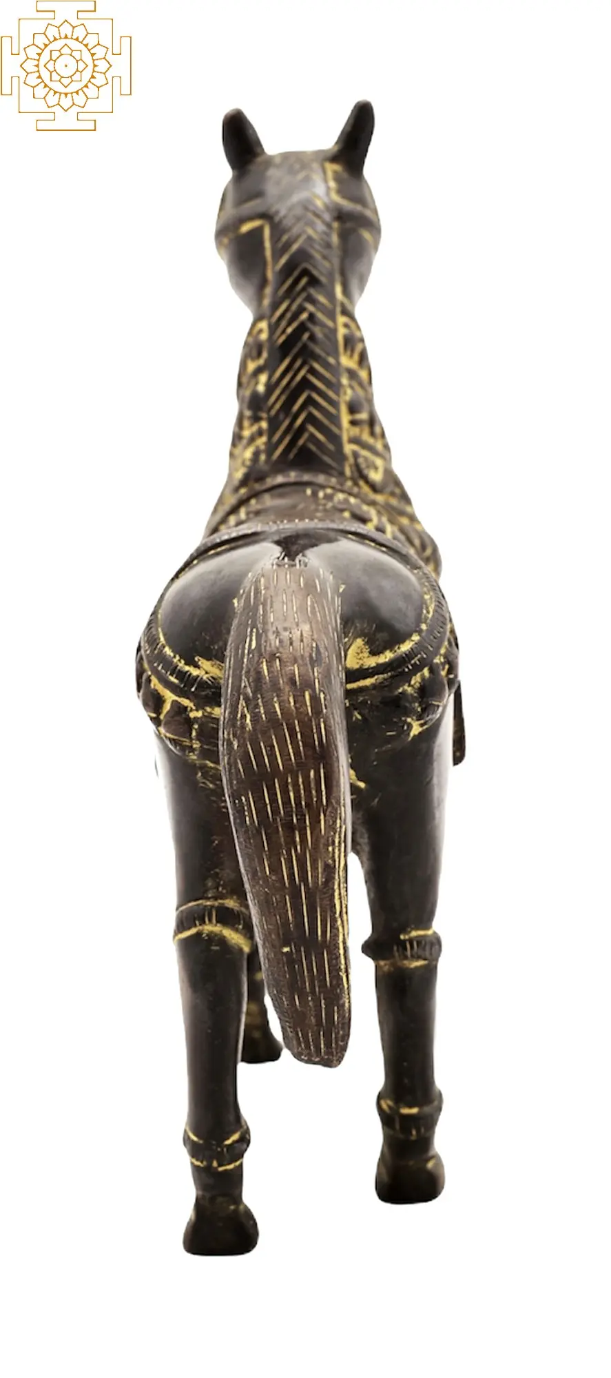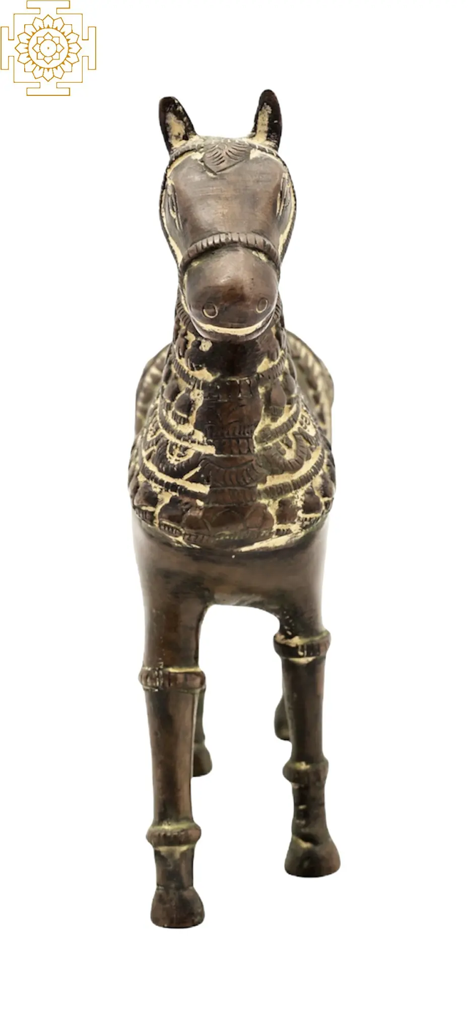 Since immemorial, horses, or ashwa, have been a symbol of regality and grandeur. The Asahwamedha Yagya is mentioned in several ancient scriptures, including the Ramayana and Mahabharata. Horses have been suggested as prominent people's transportation. They have a place in the most magnificent Indian art because of their role. Horse statues can be considered guardians of temples and vital structures. This brass monument honors the bravery and grace of the Ashwa or horse. It has a green patina hue, indicating the piece's ancient status. The horse is adorned with lovely engravings depicting the horse as a royal messenger of powerful people. This statue symbolizes regality and wealth, and placing it might bring the exact attributes.