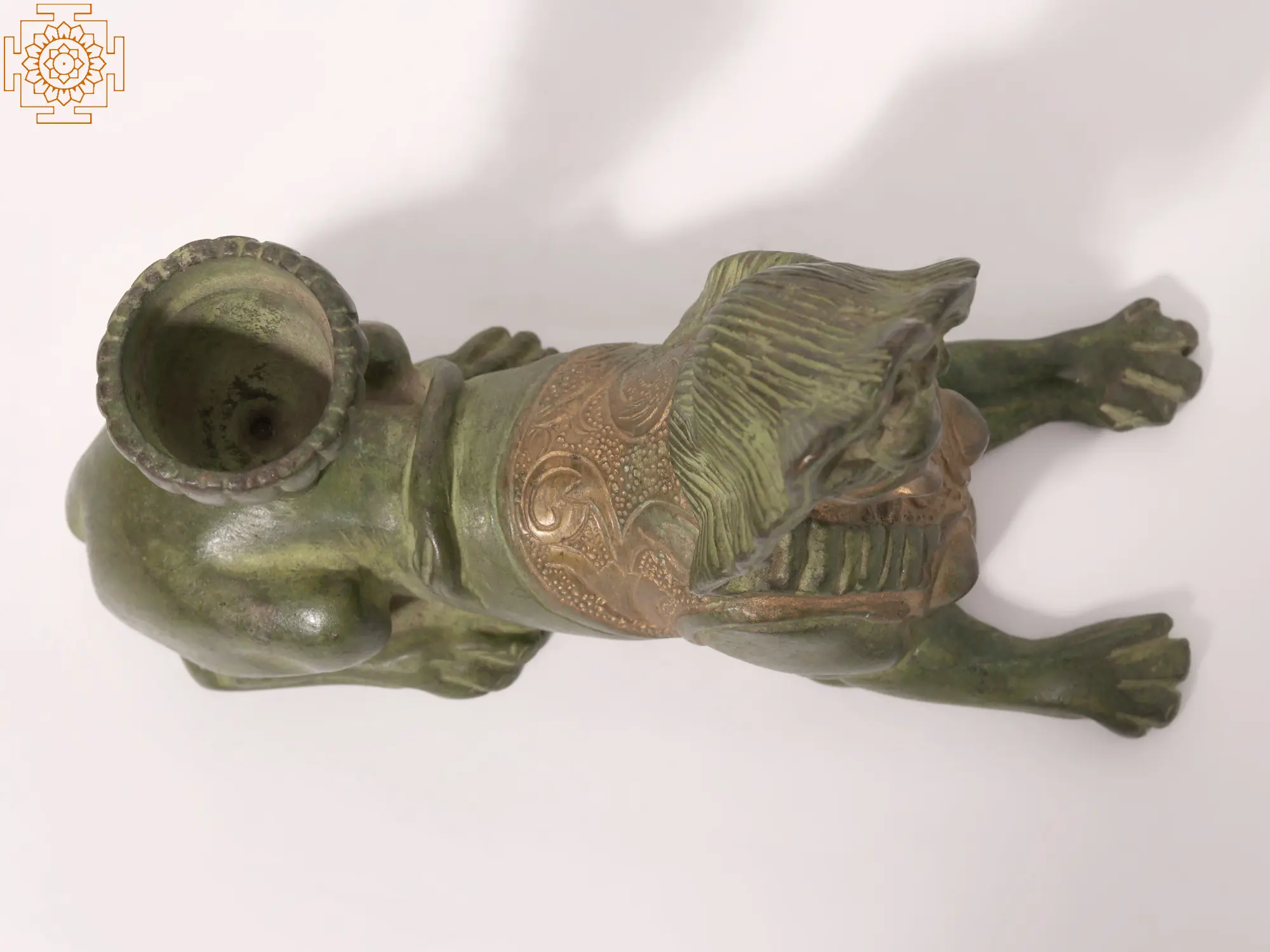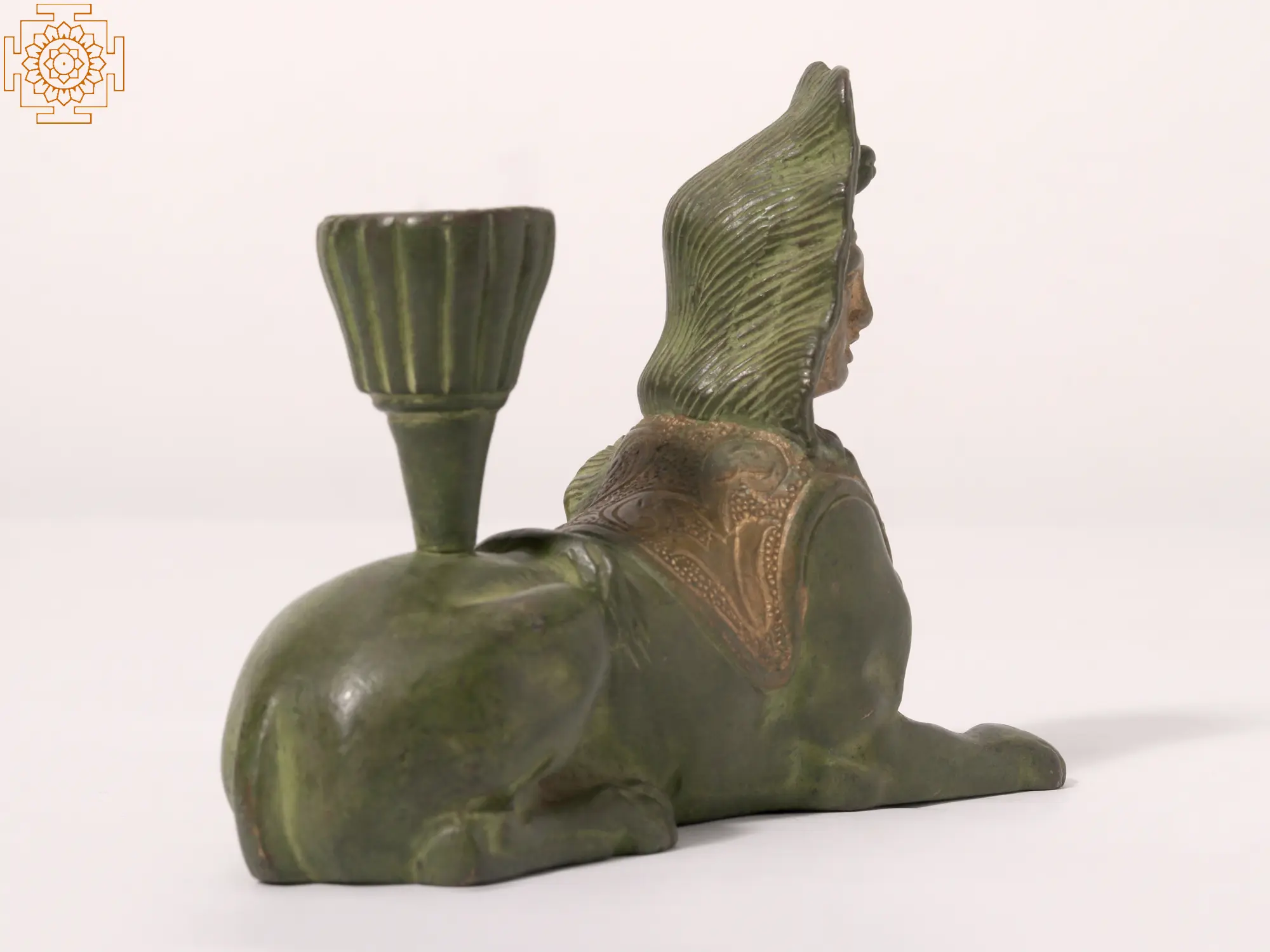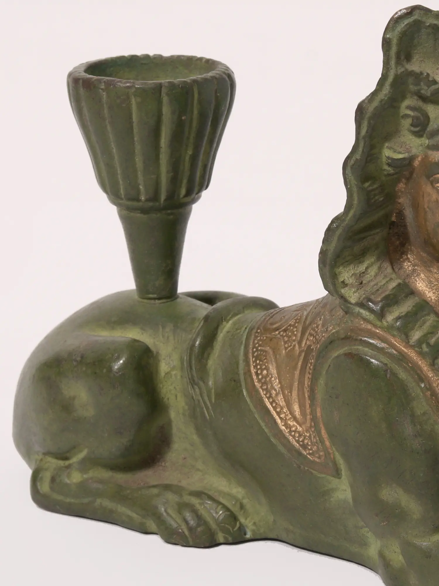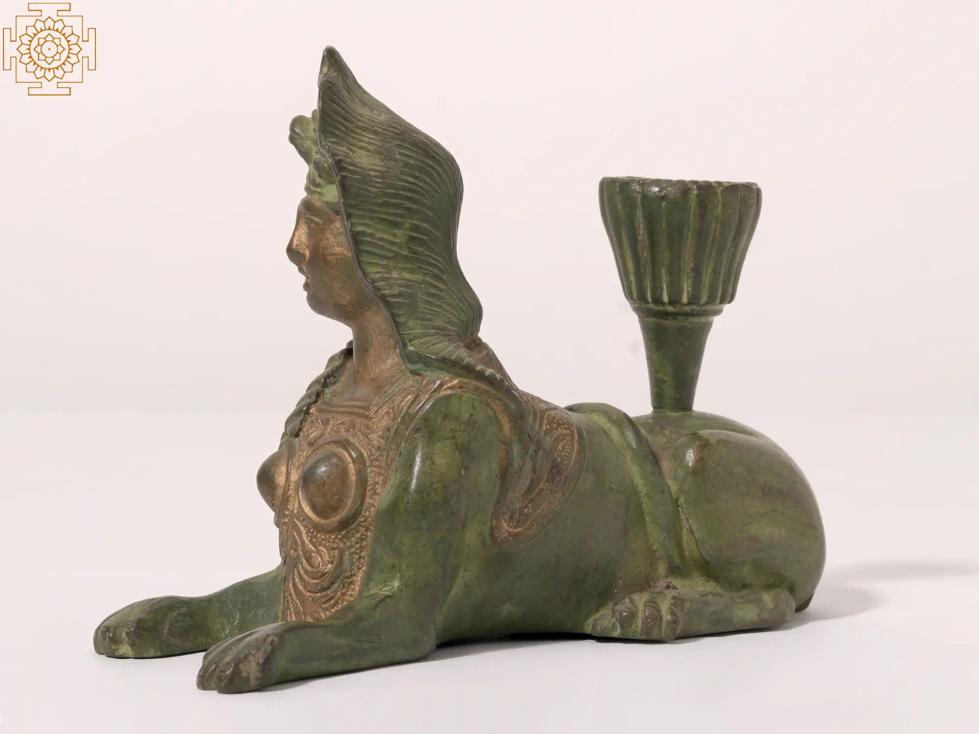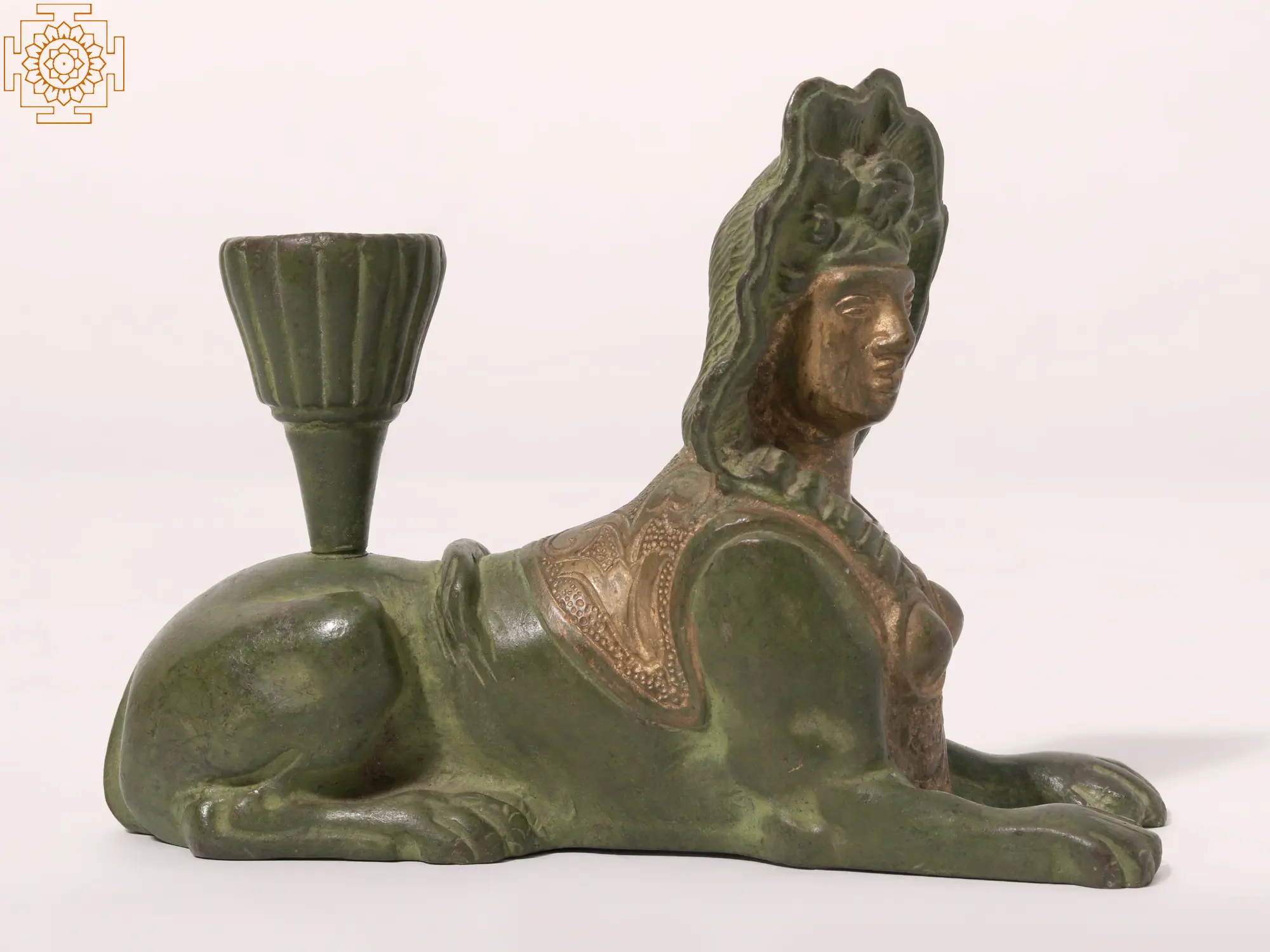 The attention to detail in this brass Sphinx is truly remarkable. The headdress, adorned with delicate floral motifs, adds an air of sophistication. The Sphinx’s facial features are subtly expressive, conveying a sense of serene majesty. The body, sculpted with anatomical accuracy, blends seamlessly with the feline form, demonstrating a profound understanding of both artistic expression and the subject matter itself. The gold highlights on the chest and shoulders beautifully complement the verdant green of the statue, creating a visually striking contrast. This harmonious blend of colors and textures makes this piece a true masterpiece of artistry and design.