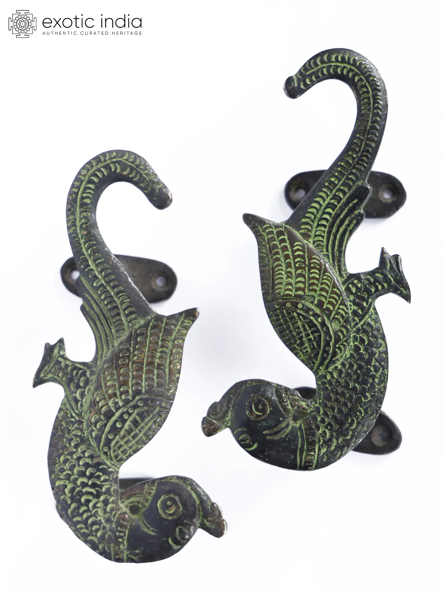 Parrots or Shuka in Indian culture are symbols of love, beauty, and youth. Feathered companions of the romantic heroines, these birds are associated with epic tales of love. Capturing the charm of the parrots in metal, these brass designer door handles present the bird pair. In a stylized form, the figures of parrots look appealing, with a vintage finish of the metal adding to their beauty.