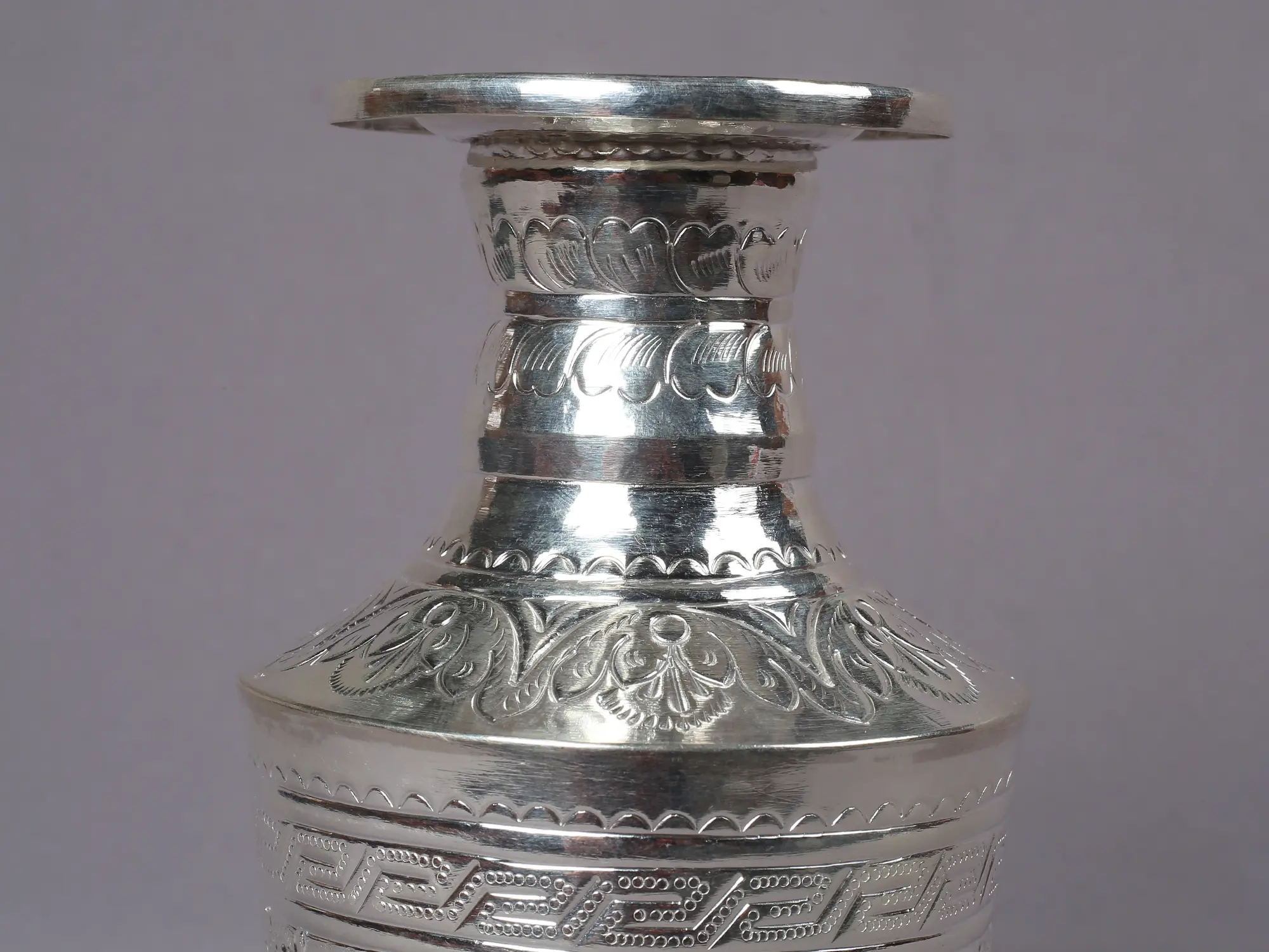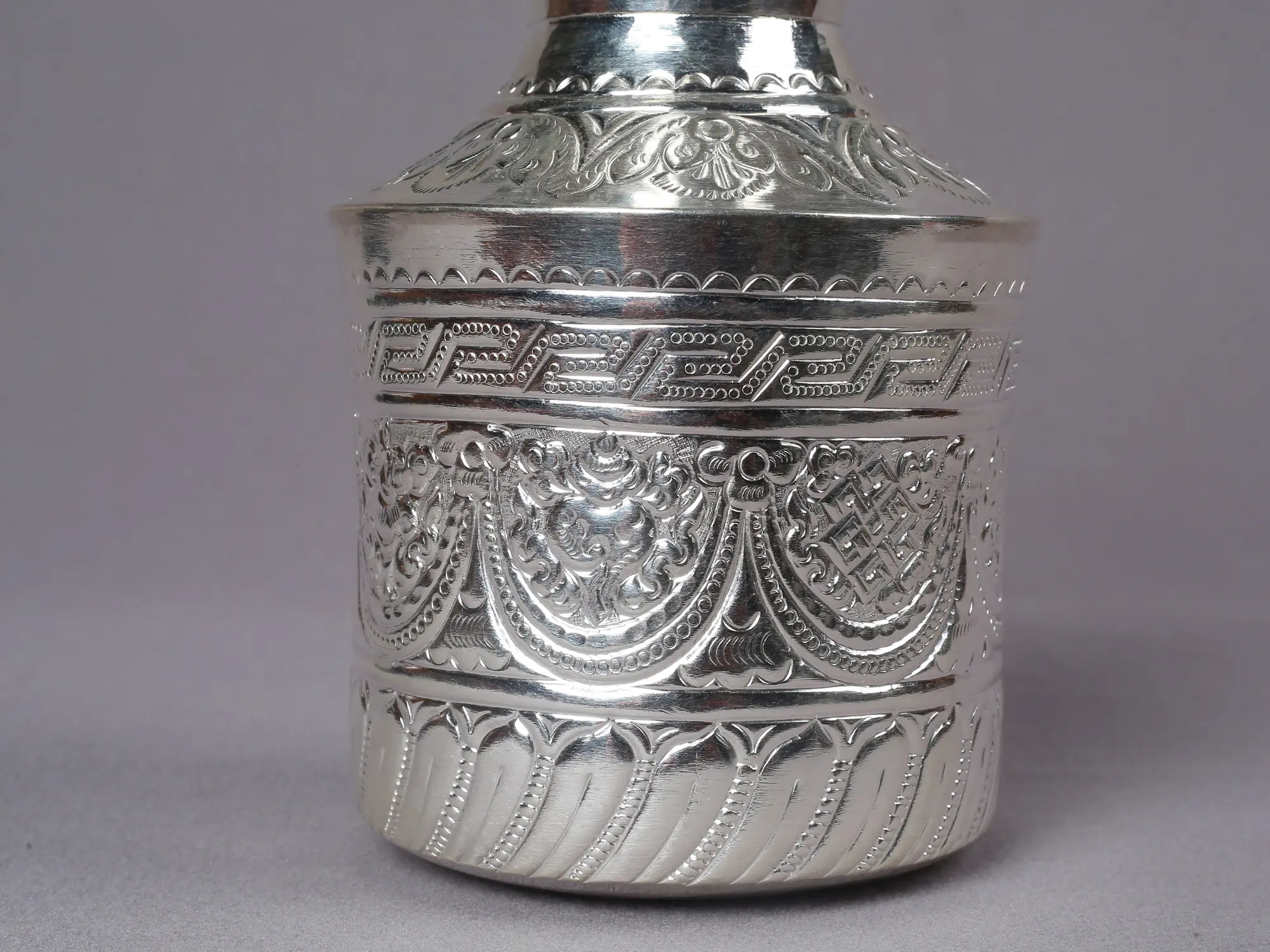 A masterpiece of craftsmanship and cultural value, I present to you the silver flower container featuring Ashtamangala engravings from Nepal. This flower container, which has been painstakingly crafted and decorated with elaborate ashtamangala designs, is a representation of wealth, spirituality, and tradition. This silver pot's intricate design showcases the talent and artistry of Nepalese artisans, who have refined their trade over many centuries. The pot is imbued with holy meaning and positive energy by the ashtamangala carving, which in Hindu and Buddhist traditions represents eight fortunate emblems.
