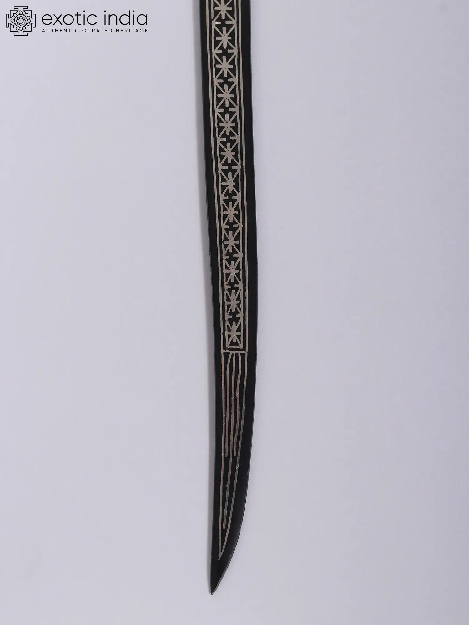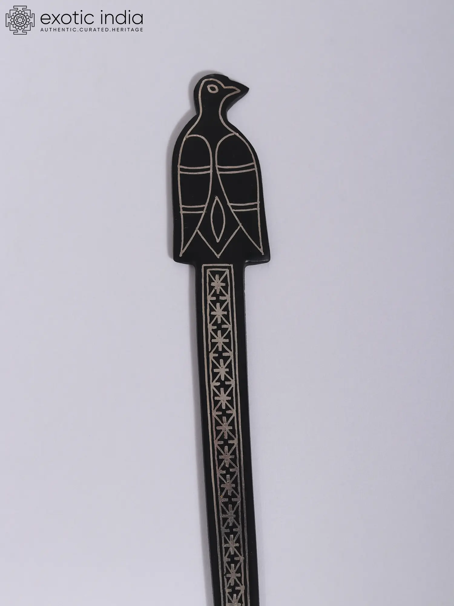 In the times when opulence was rare, people forged ways to beautify daily-use objects with the use of expensive materials. This Small Attractive Knife with a Beautiful Handle is made of Bidri Artwork and is a paper knife. It is made of Gunmetal with Real Silver and has a parrot motif on the tip of the handle. The body of the knife is beautifully ornamented with silver metal in the form of the small cross-like design and the knife bends at the bottom. This knife is a beautiful yet significant piece of art that doubles as an object of utility.