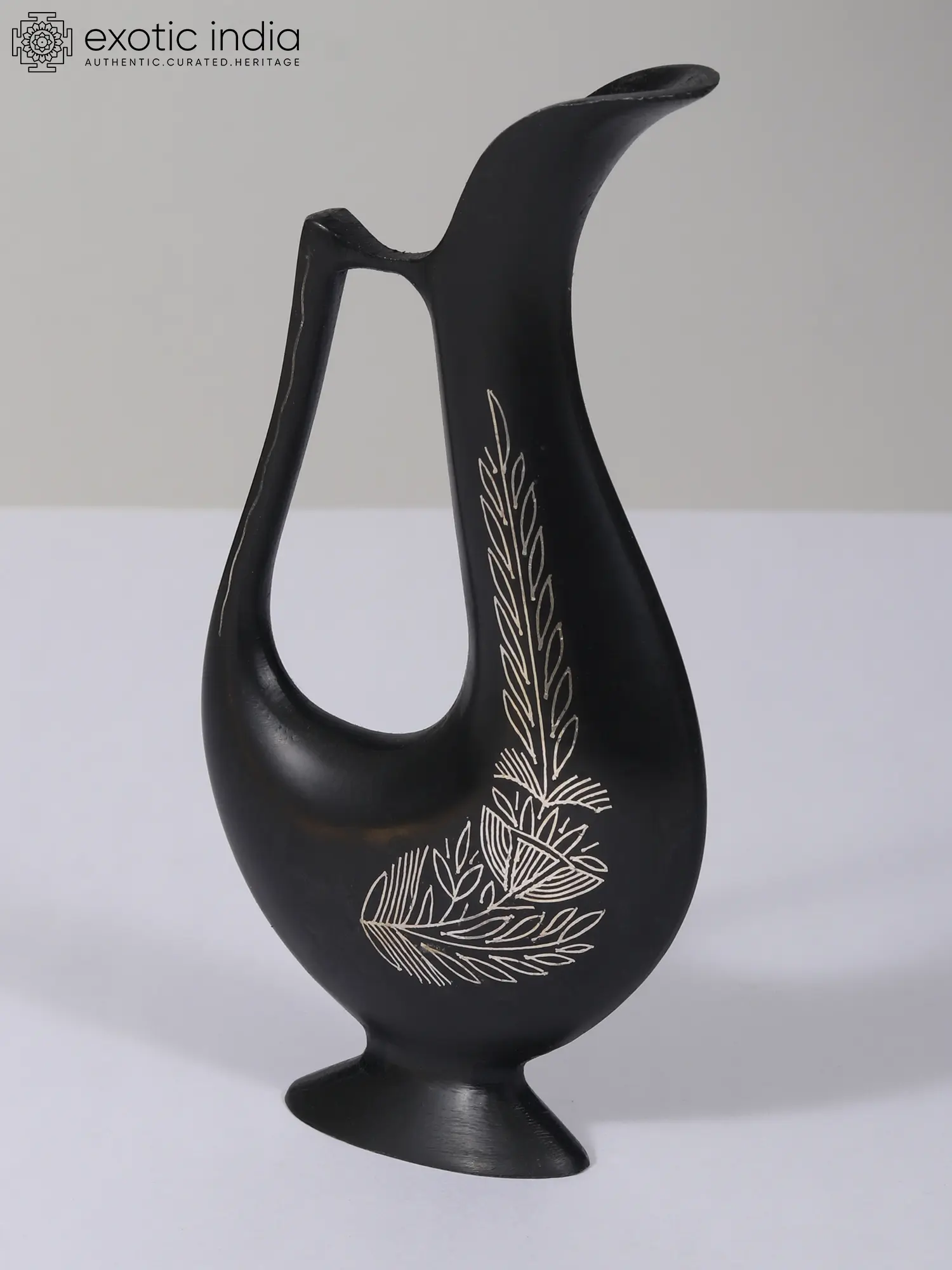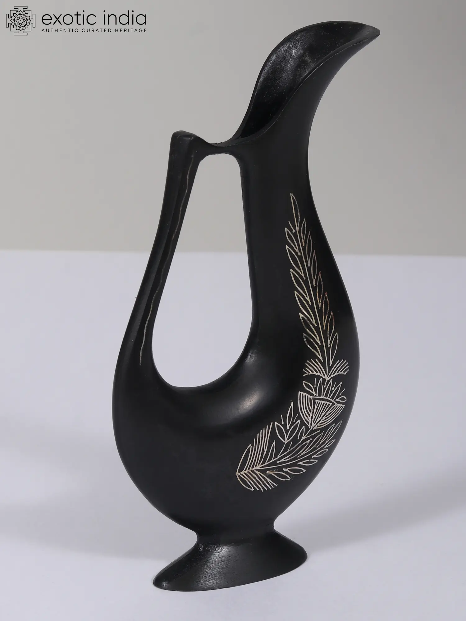 This Small Floral Jug Vase with Bidri artwork in gunmetal and real silver embodies the essence of Nawabi elegance, seamlessly blending tradition with regal aesthetics. Its curved and stylized shape, reminiscent of a swan, adds a touch of grace and sophistication to any table setting. The simple yet elegant floral motif on the body of the vase enhances its regal charm.