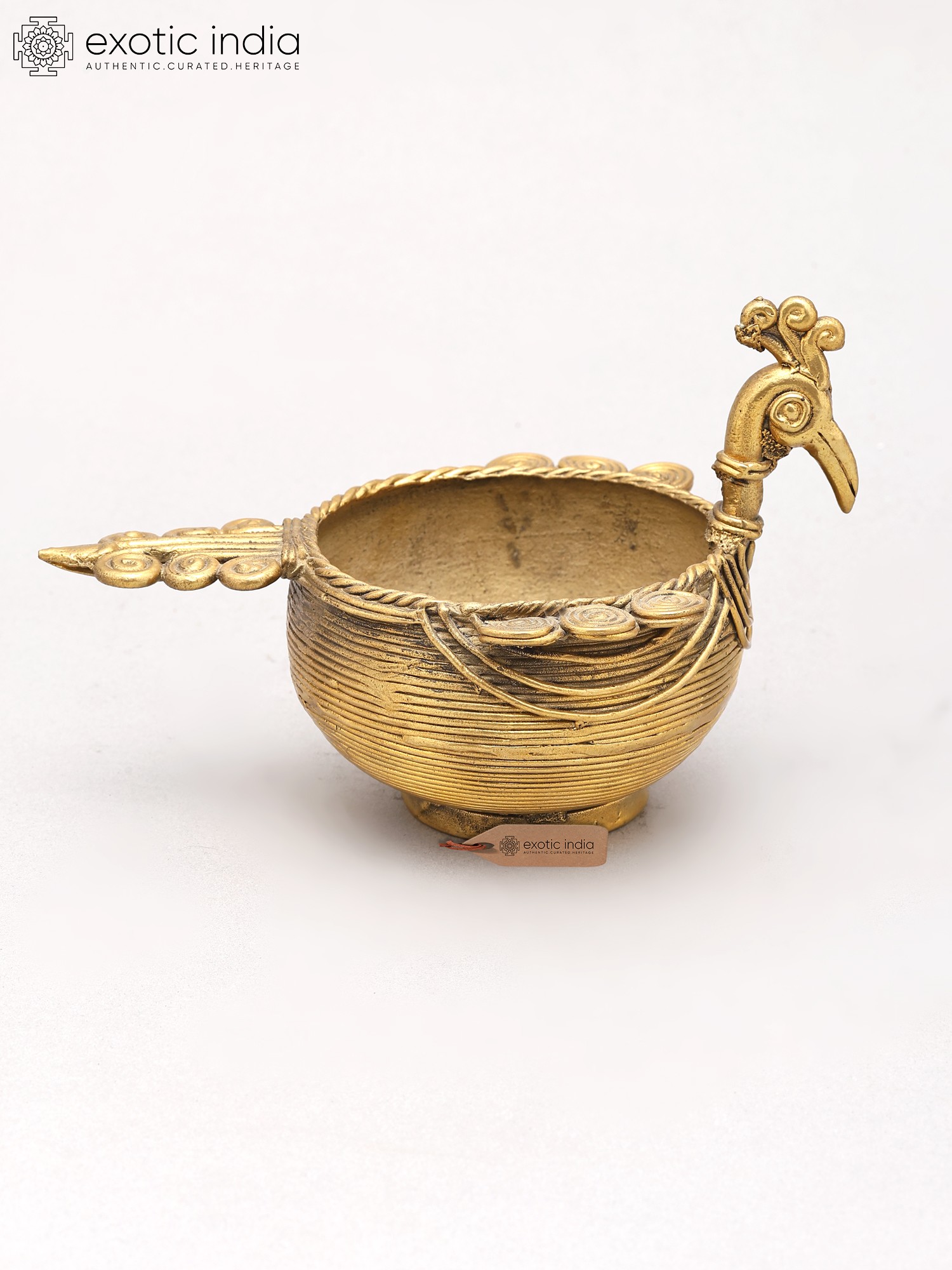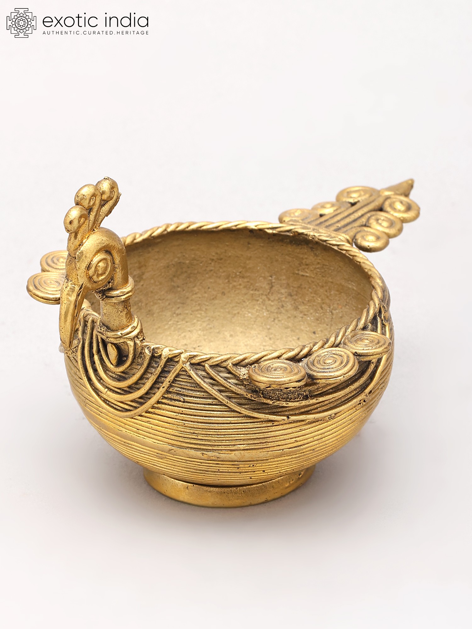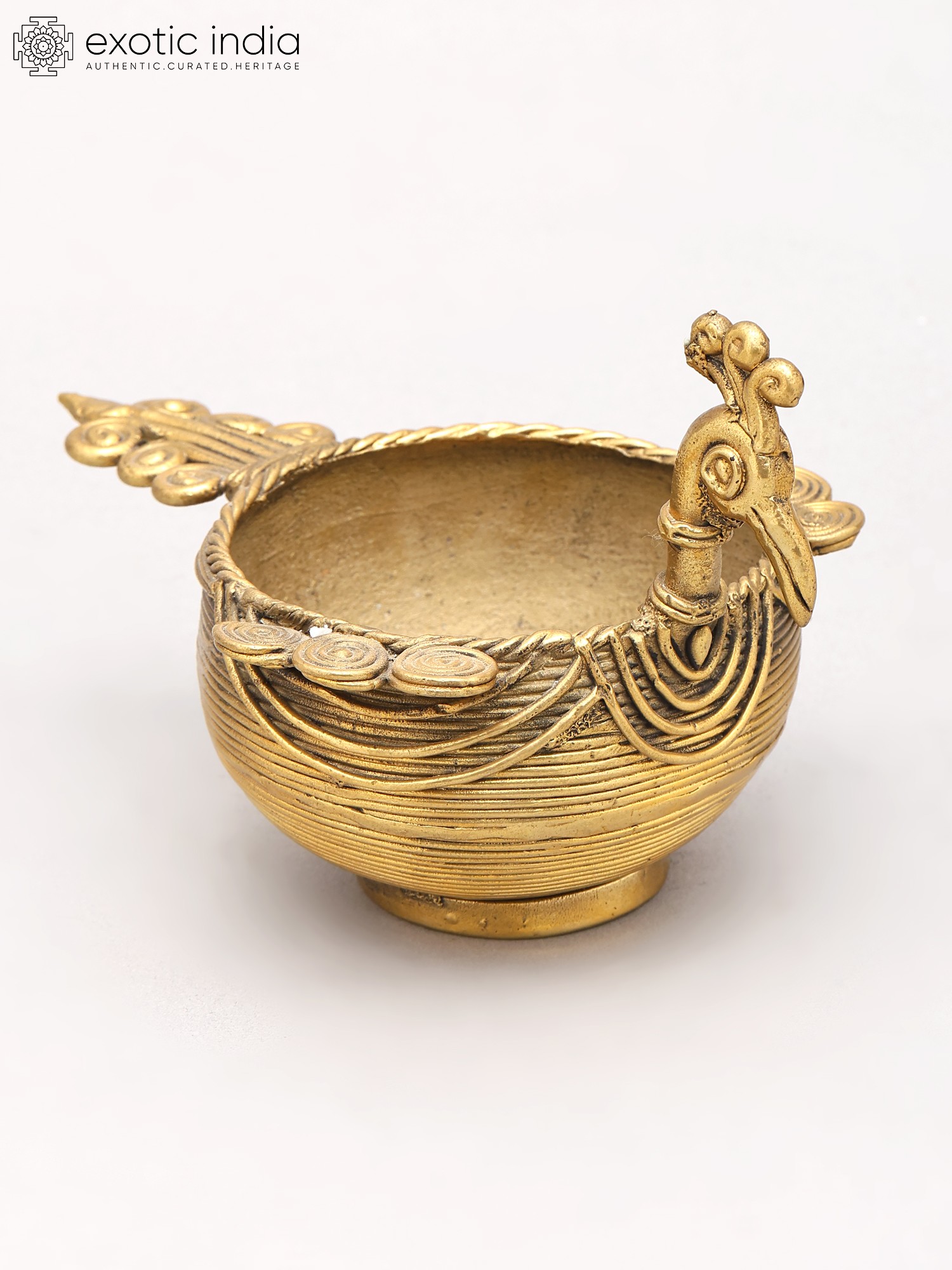 Large Brass Urli with Peacock Sculpture, Lamp, and Bells