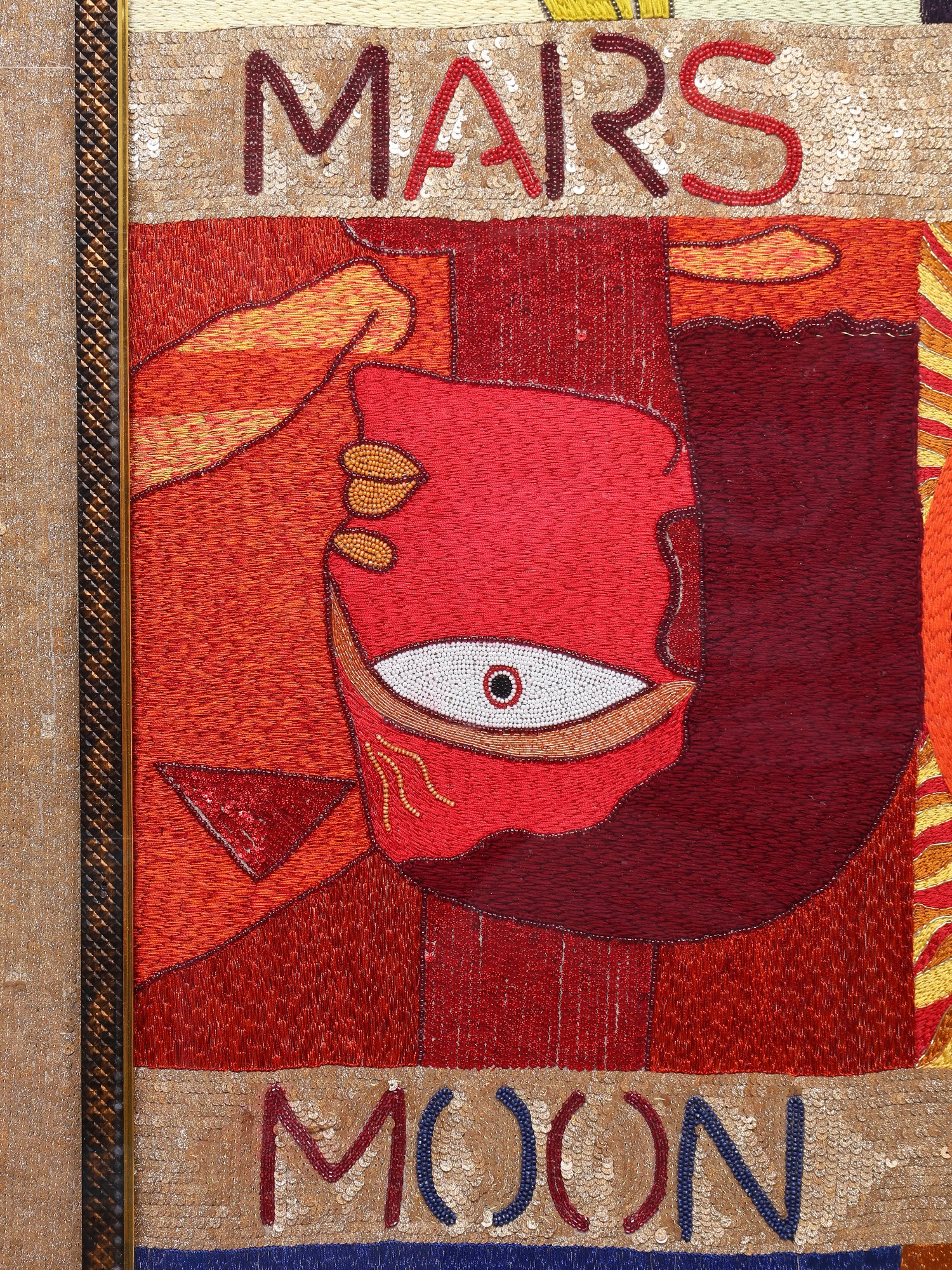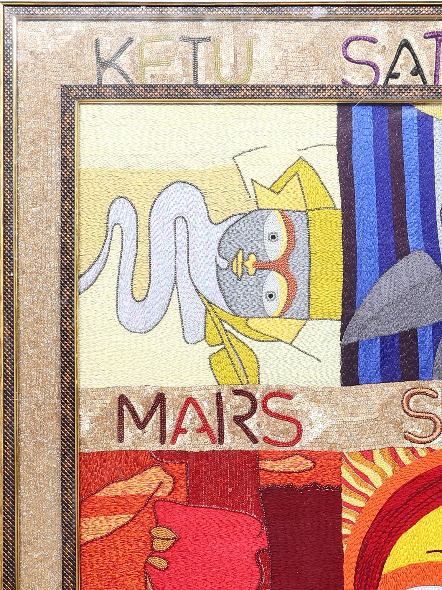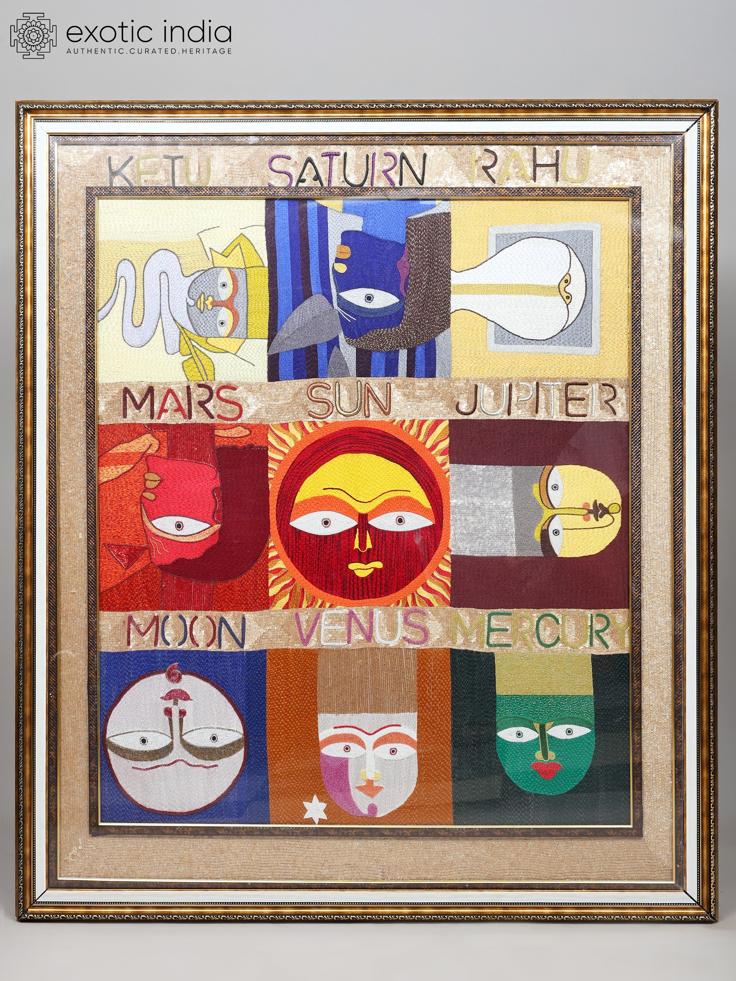 The artist has masterfully translated the symbolic essence of each Graha into a unique and captivating visual narrative. Bold colors and distinct artistic interpretations for each planetary representation create a dynamic and engaging composition. From the enigmatic forms associated with Rahu and Ketu to the vibrant intensity of the Sun, and the serene presence of the Moon, every panel within the larger artwork tells a story. The texture and depth achieved through skilled embroidery invite a closer look, revealing the dedication and artistry involved in its creation. The entire composition is framed within an elegant, ornate border, adding a touch of classic sophistication to this celestial masterpiece.
