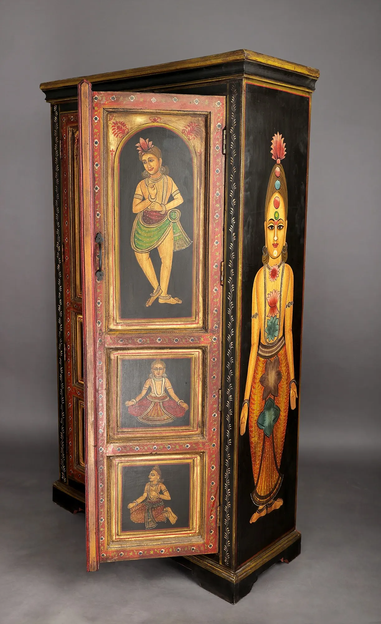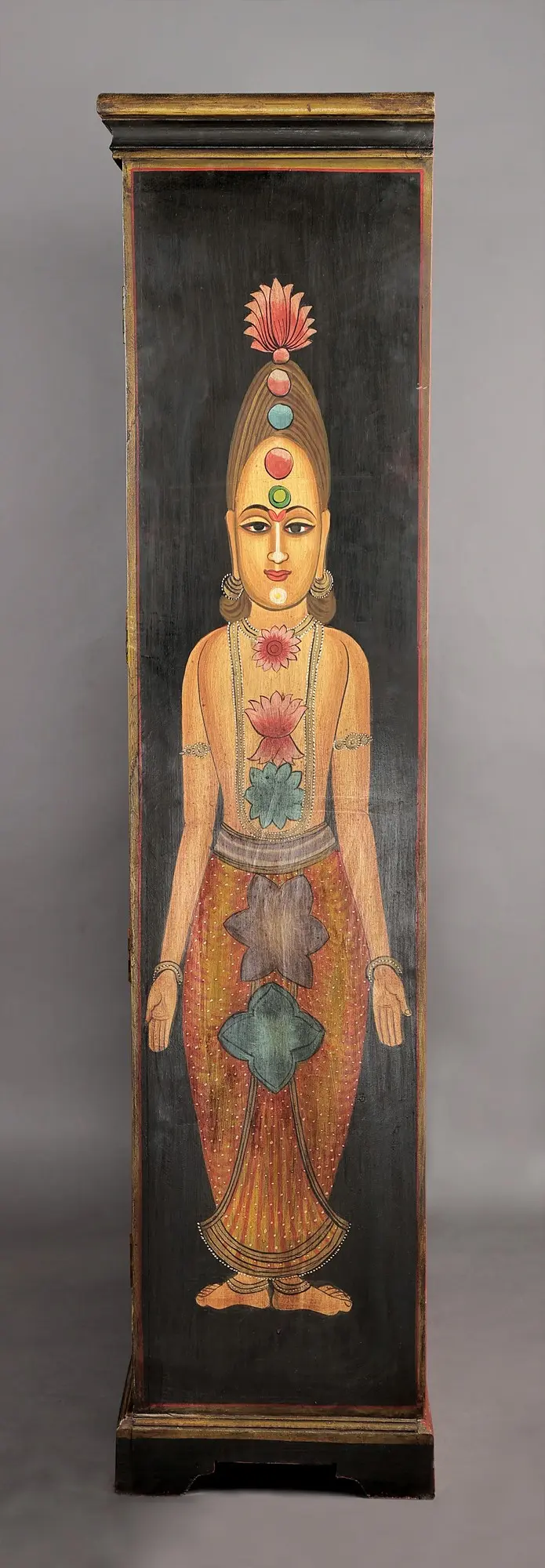 This intricate work delves into the esoteric understanding of the chakras within the subtle body. Bulaki's depiction captures the essence of formless, timeless, and luminous divinity, the foundation of the universe in Hindu traditions. This cabinet serves as a functional storage piece and as a portal to the spiritual and philosophical depths of Yoga, offering a glimpse into the mystical tapestry of Indian wisdom.