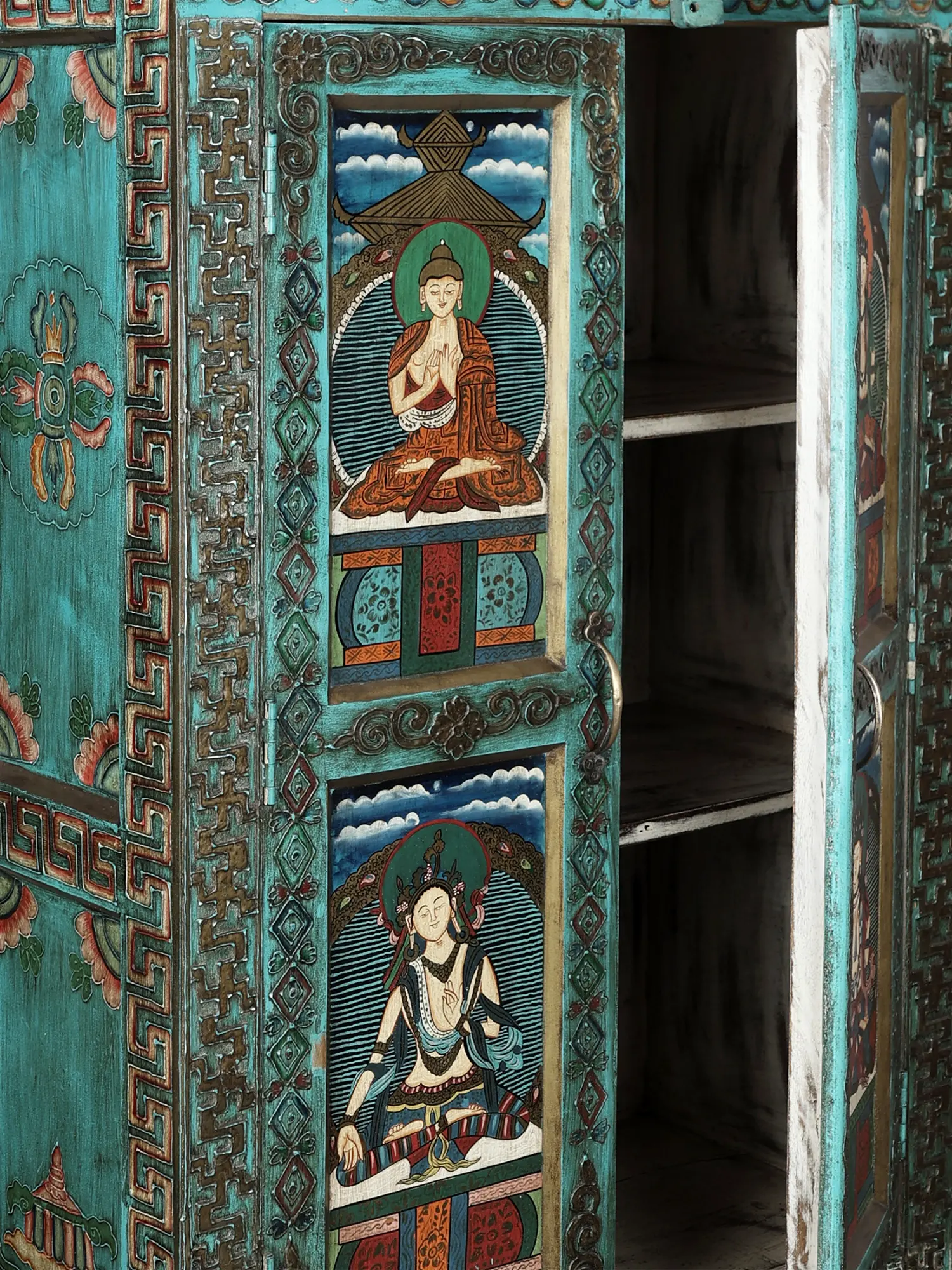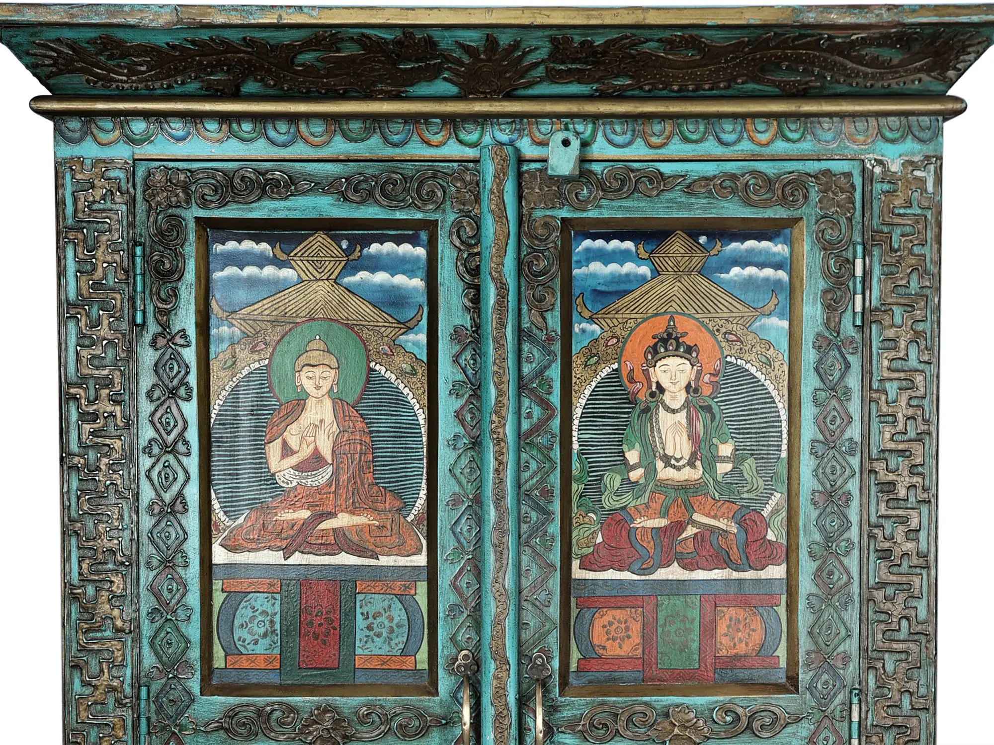 77" Vintage Hand Painted Tibetan Buddha Wooden Cabinet