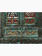 The true magic of this cabinet lies in its meticulously hand-painted doors. Each of the four panels depicts serene Buddha figures, rendered with vibrant colors and delicate brushstrokes. These sacred images are framed by elaborately carved borders, showcasing traditional Tibetan motifs and patterns. The aged, distressed finish on the turquoise-hued wood further enhances its vintage appeal, giving it the look and feel of an authentic antique piece discovered in a remote monastery. The detailed carvings along the sides and base, featuring dynamic dragon motifs and intricate geometric designs, add depth and texture, inviting closer inspection and appreciation of the craftsmanship.