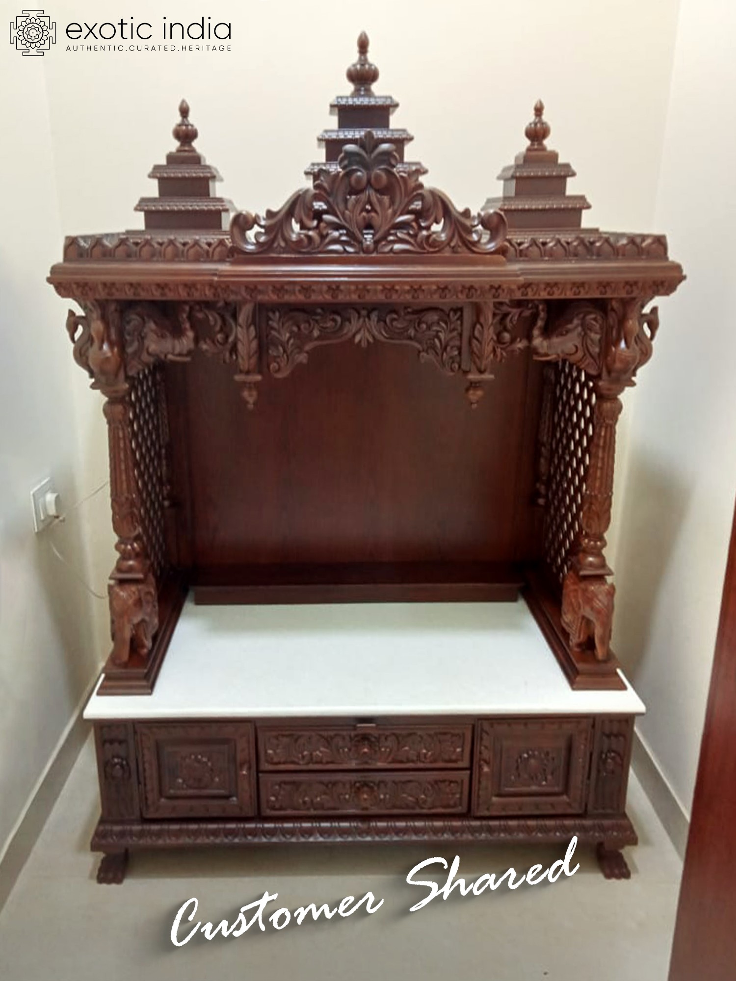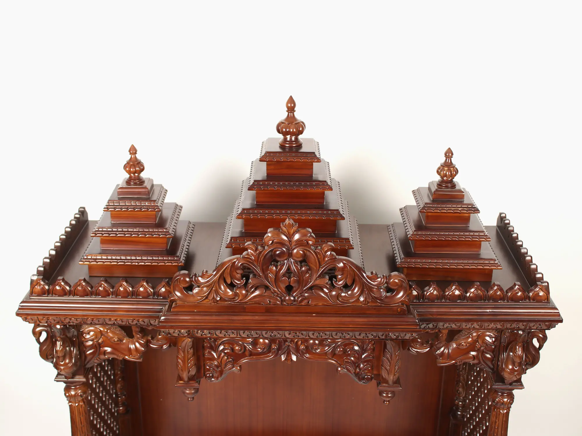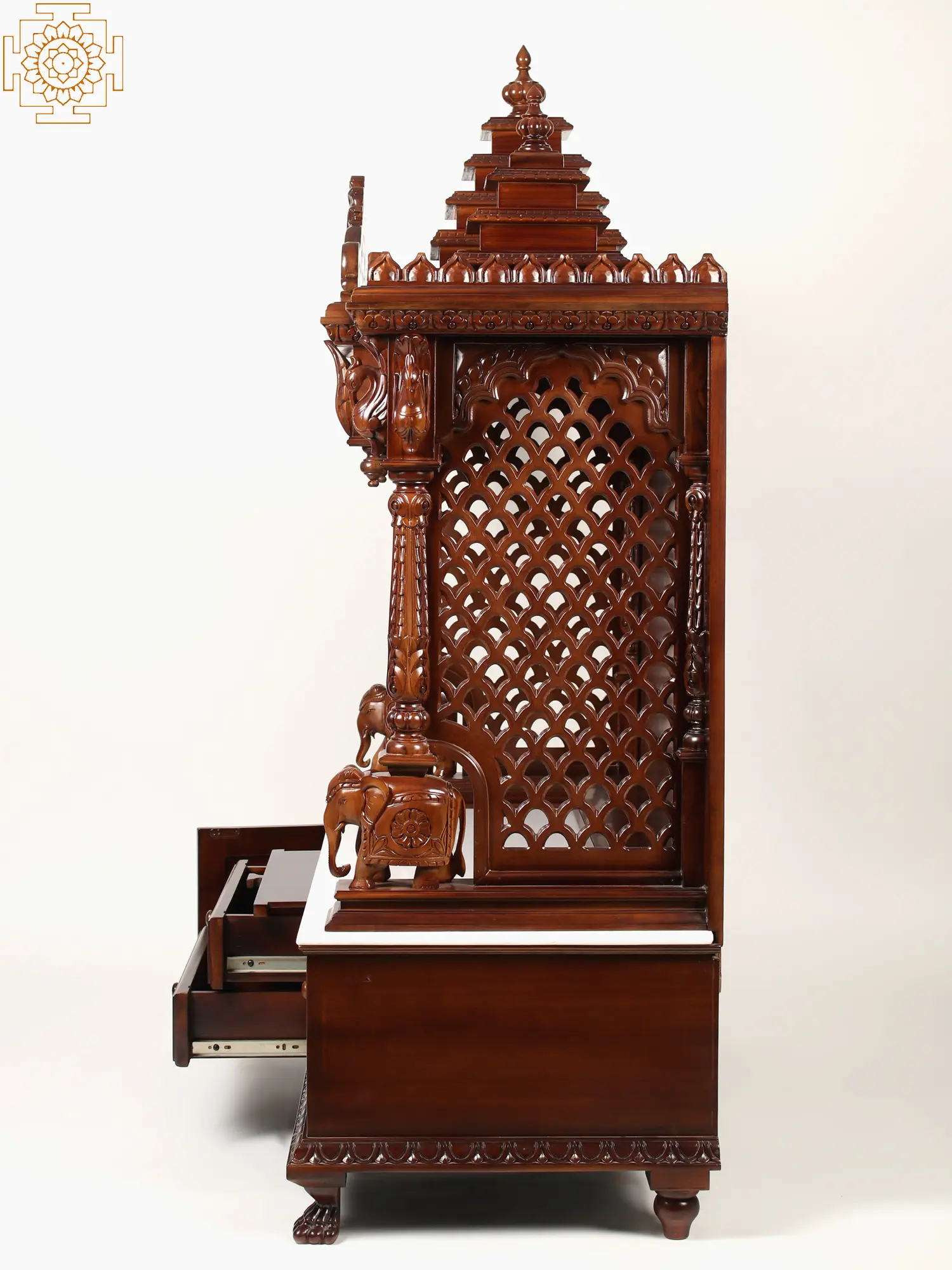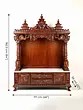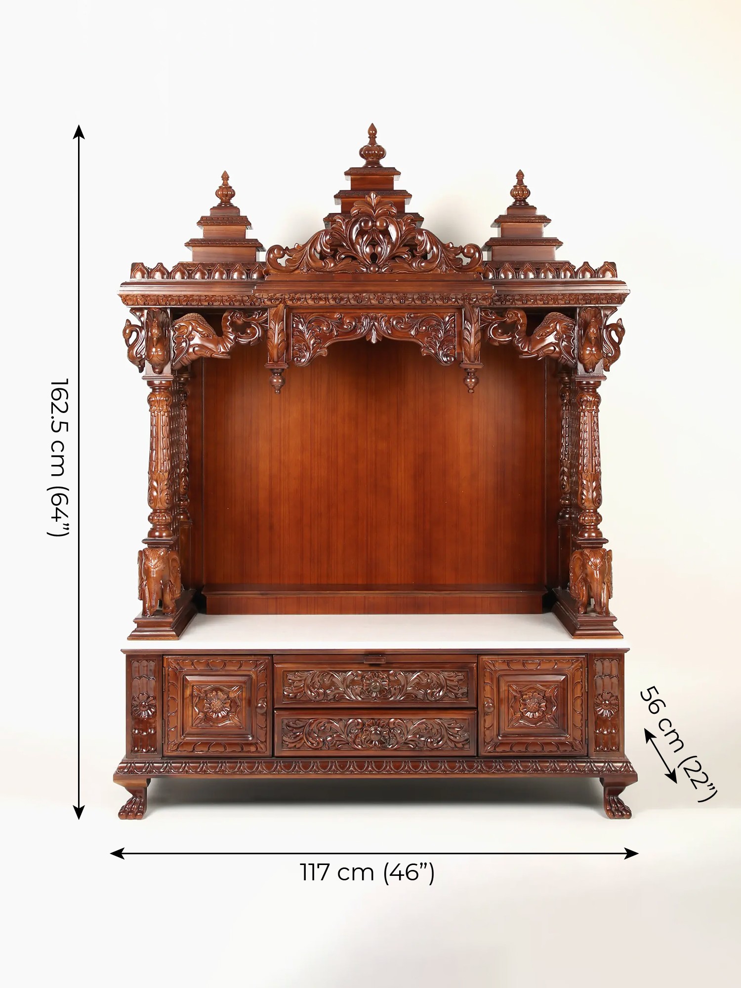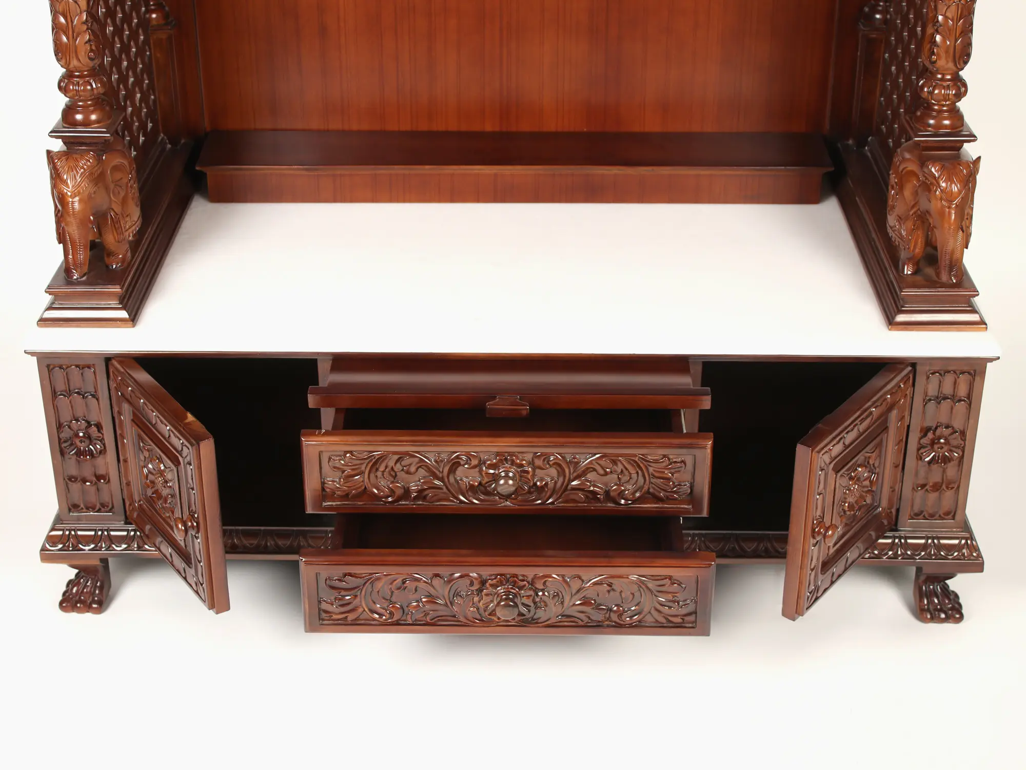 The Large Wooden Carved Designer Pooja Temple displays great craftsmanship and design. The dome of this temple is embellished with artistically carved elephants and peacocks, imparting a touch of grandeur. Two wonderfully carved elephants on their backs support the temple's pillars, symbolising strength, and stability. The temple also has two little drawers at the bottom for storage, making it easy to keep pooja items. Stupas at the top symbolise knowledge, auspiciousness, and well-being. This temple serves as a sacred venue for religious rites and shows commitment and reverence in worship art.