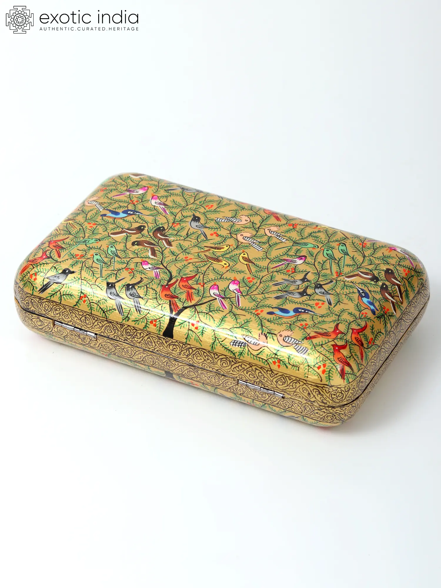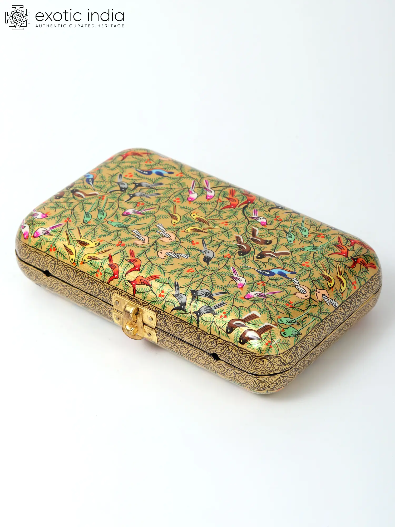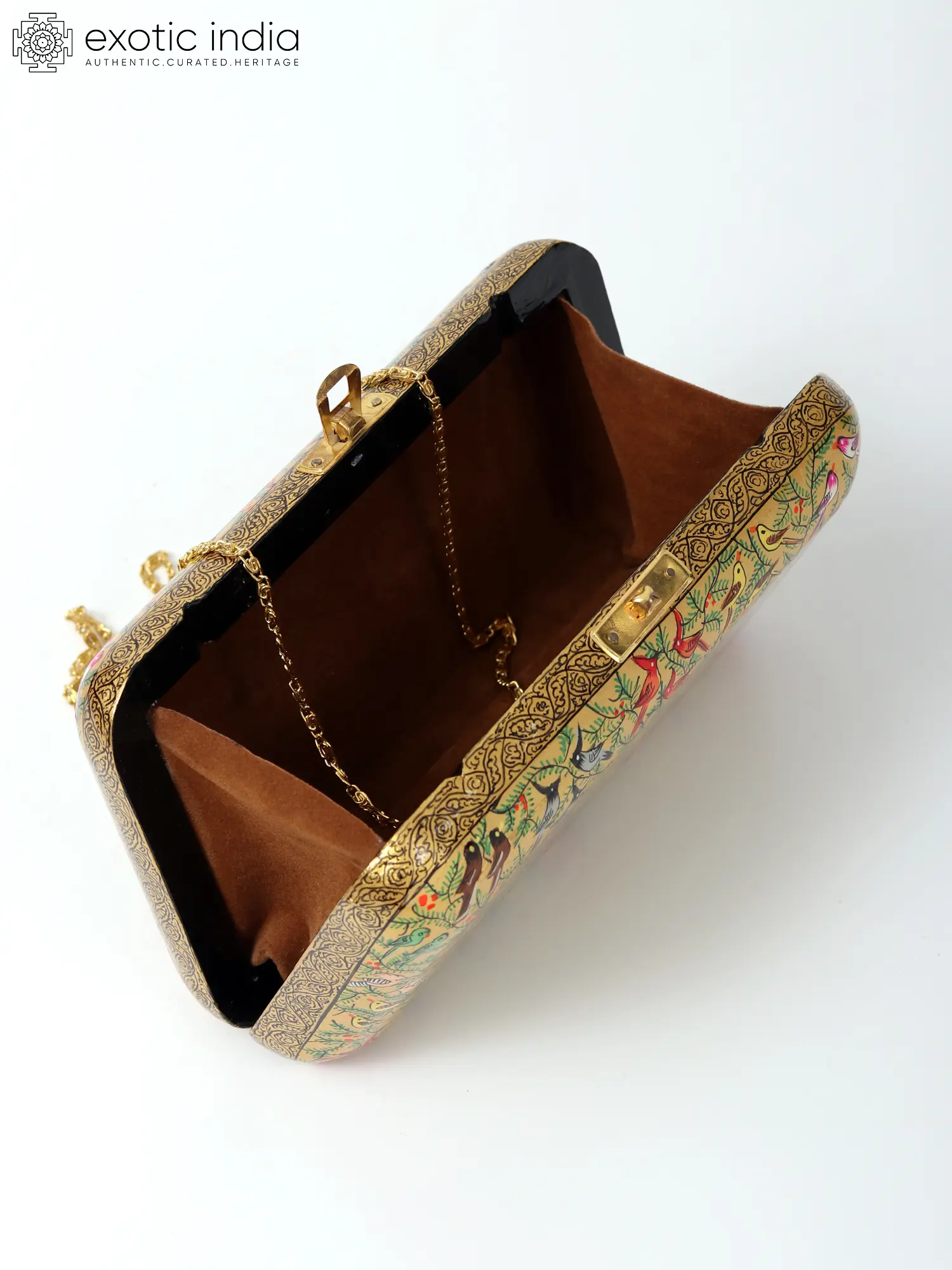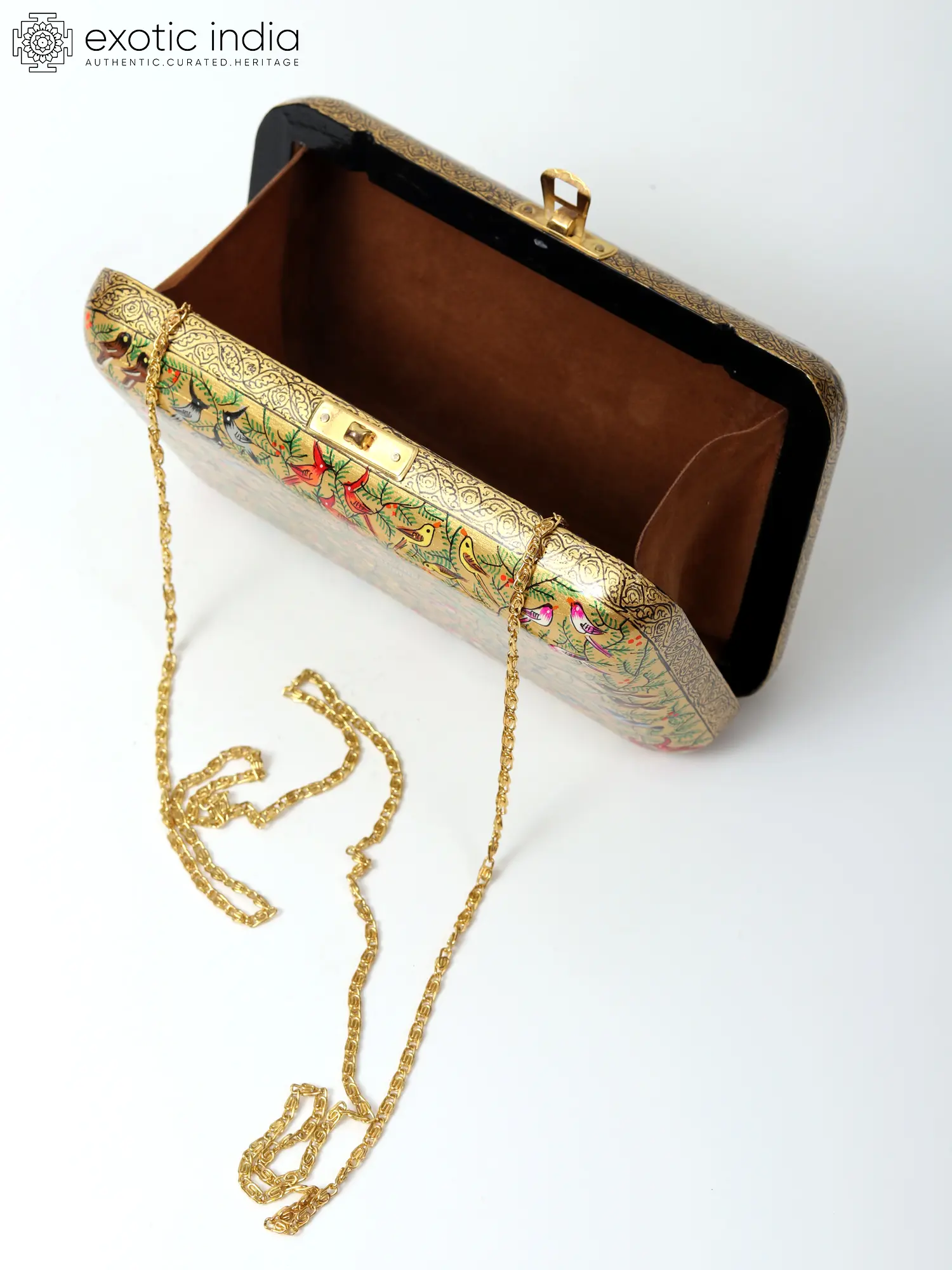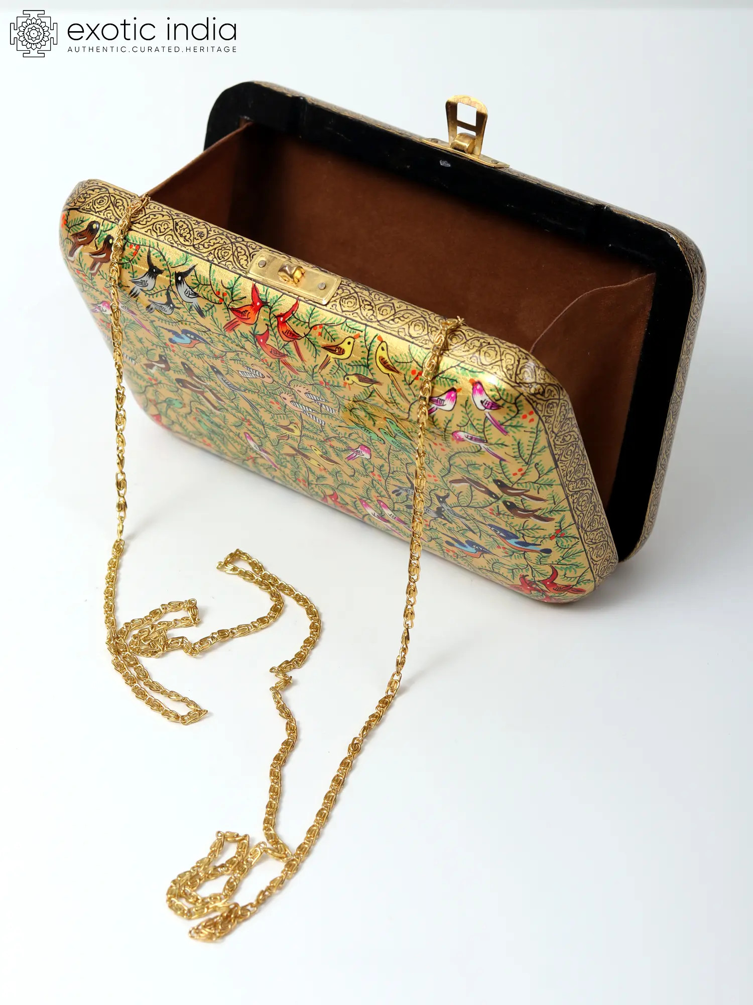 7" Beautiful Handpainted Birds Design Clutch with Chain | Wood Based Papier Mache | From Kashmir