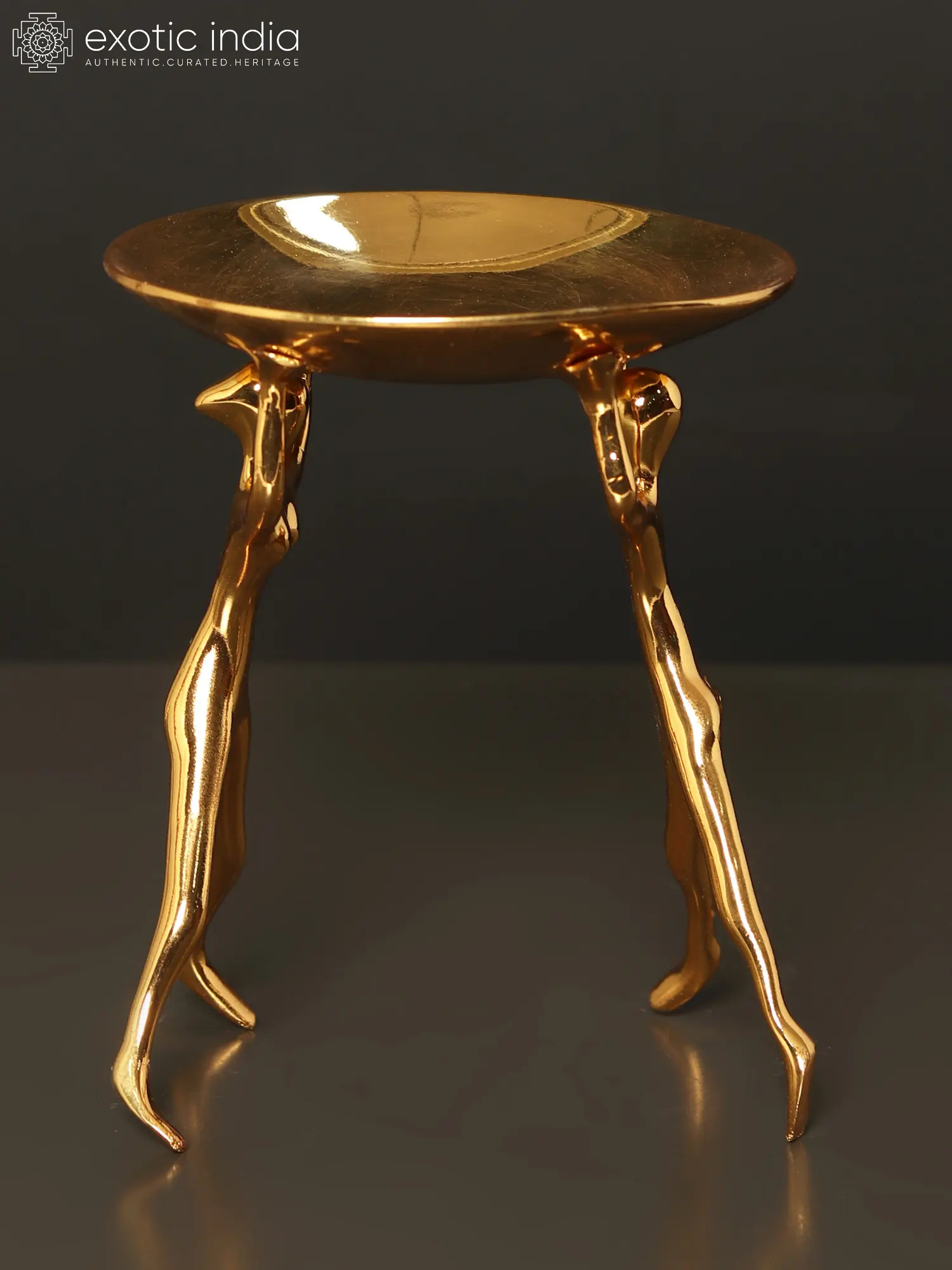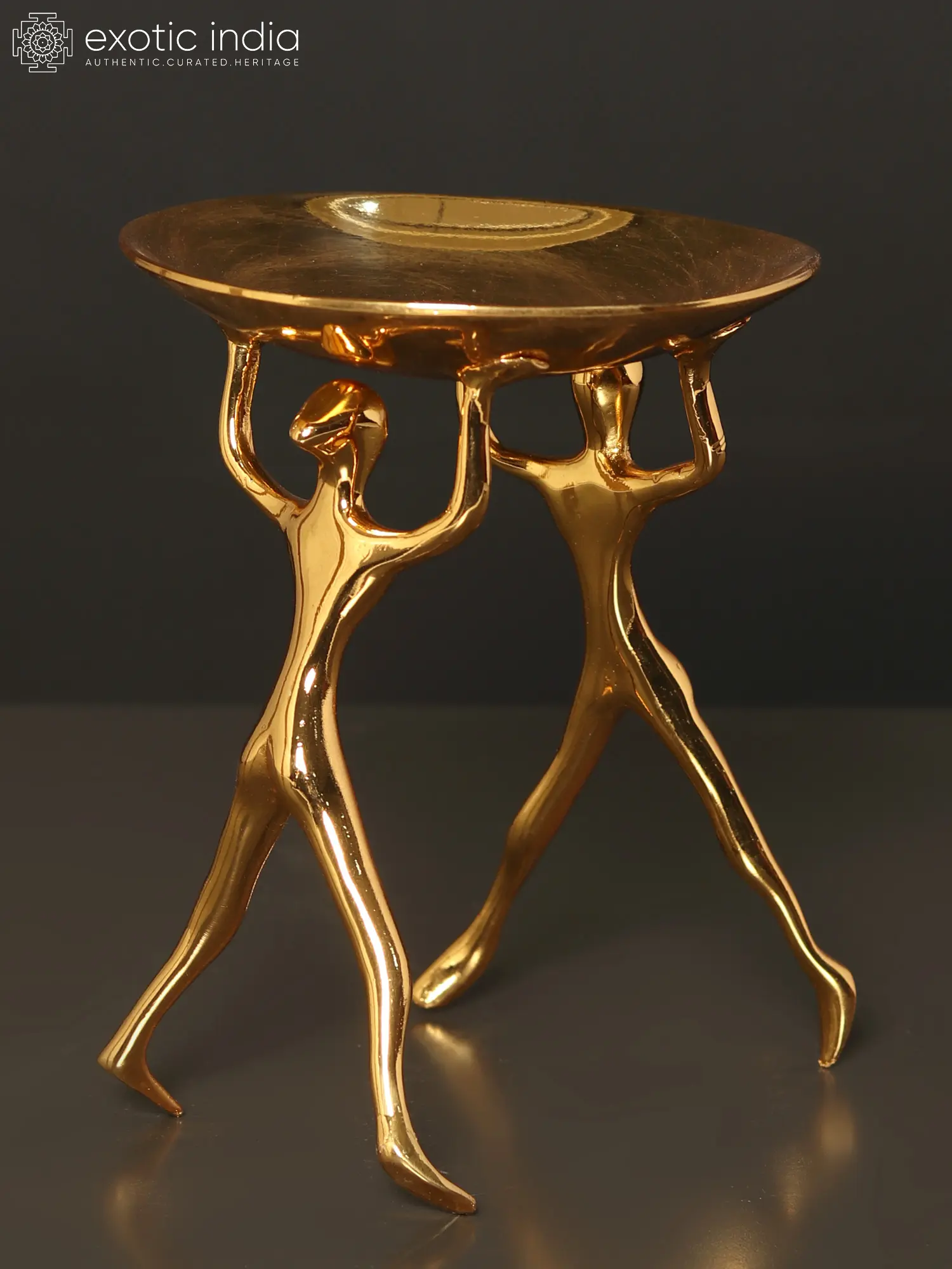 The Baroque style of architecture, art, and design thrived in Europe throughout the 17th and first part of the 18th centuries. It deals with using human figures or other flora and fauna in decorating daily use objects or just for the ornamentation of a piece. This Round Tray Supported by Human Figures made in Brass and with superfine 24 Karat Gold Plating is a fine example of Baroque art. Here two human figures are seen holding a tray above their head.