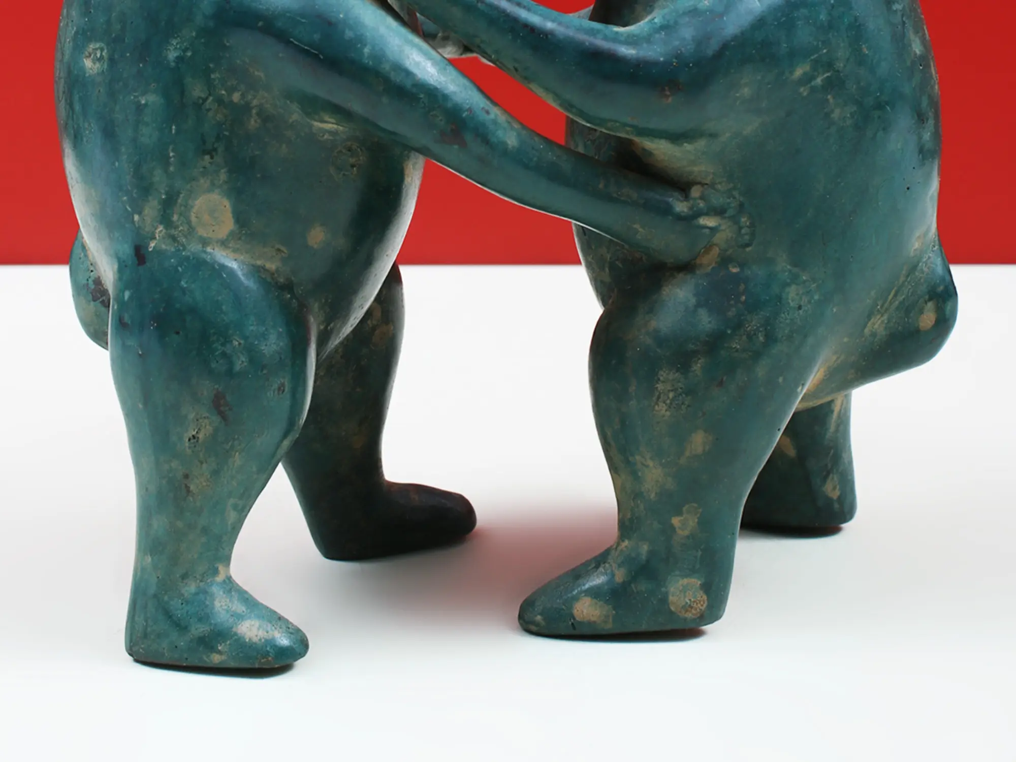 Bring a touch of whimsical charm and artistic elegance to your living space with this exquisite brass figurine. Crafted with meticulous detail, this piece captures a tender and dynamic moment between two anthropomorphic rabbits engaged in a graceful dance. Their forms are sculpted with a playful yet sophisticated artistry, showcasing the beauty of their entwined embrace. The rich patina, a testament to the aged brass, lends an antique allure and a sense of timelessness to the sculpture.