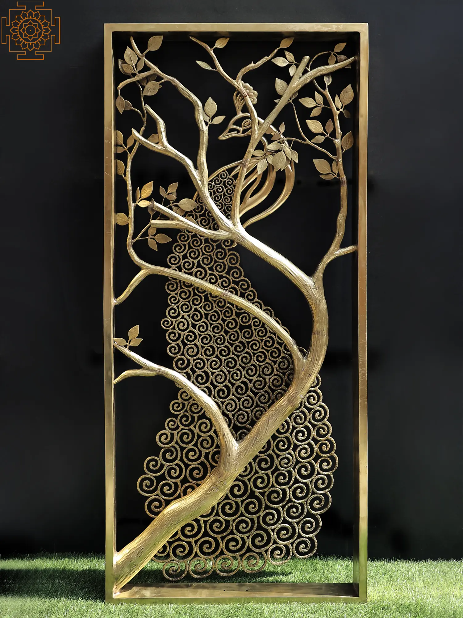 Exotic India is ecstatic to present this gorgeous brass grill board with a peacock pattern. This mesmerising work of art depicts a magnificent peacock perched elegantly on a blooming tree, giving a touch of class and beauty to any setting.