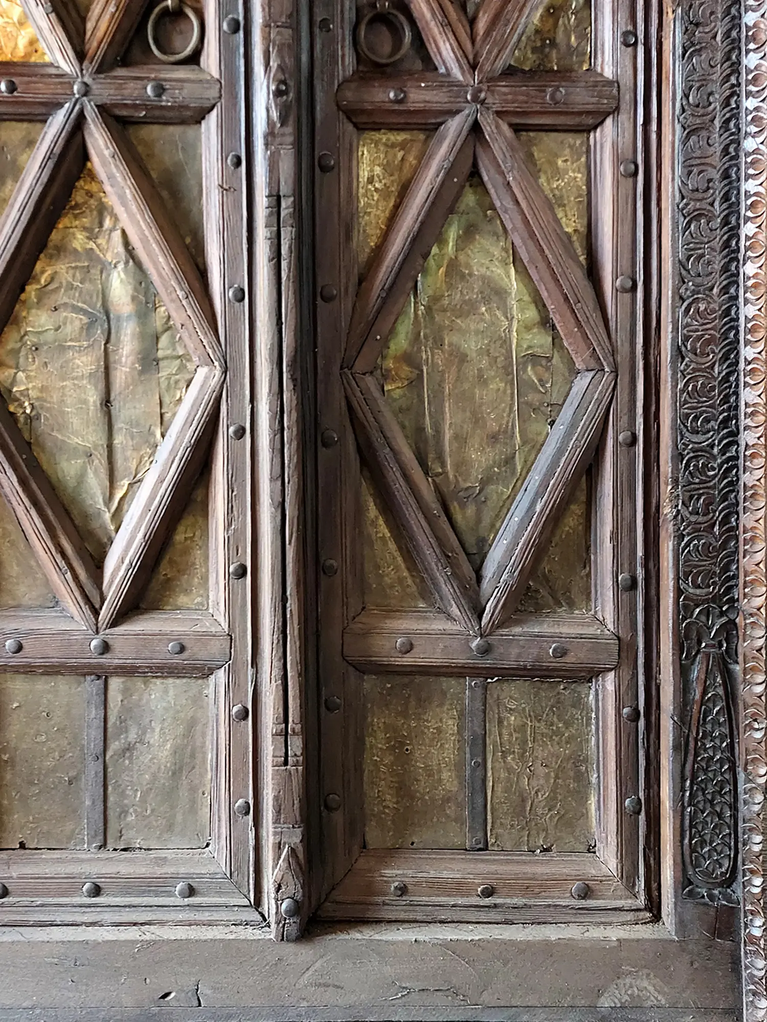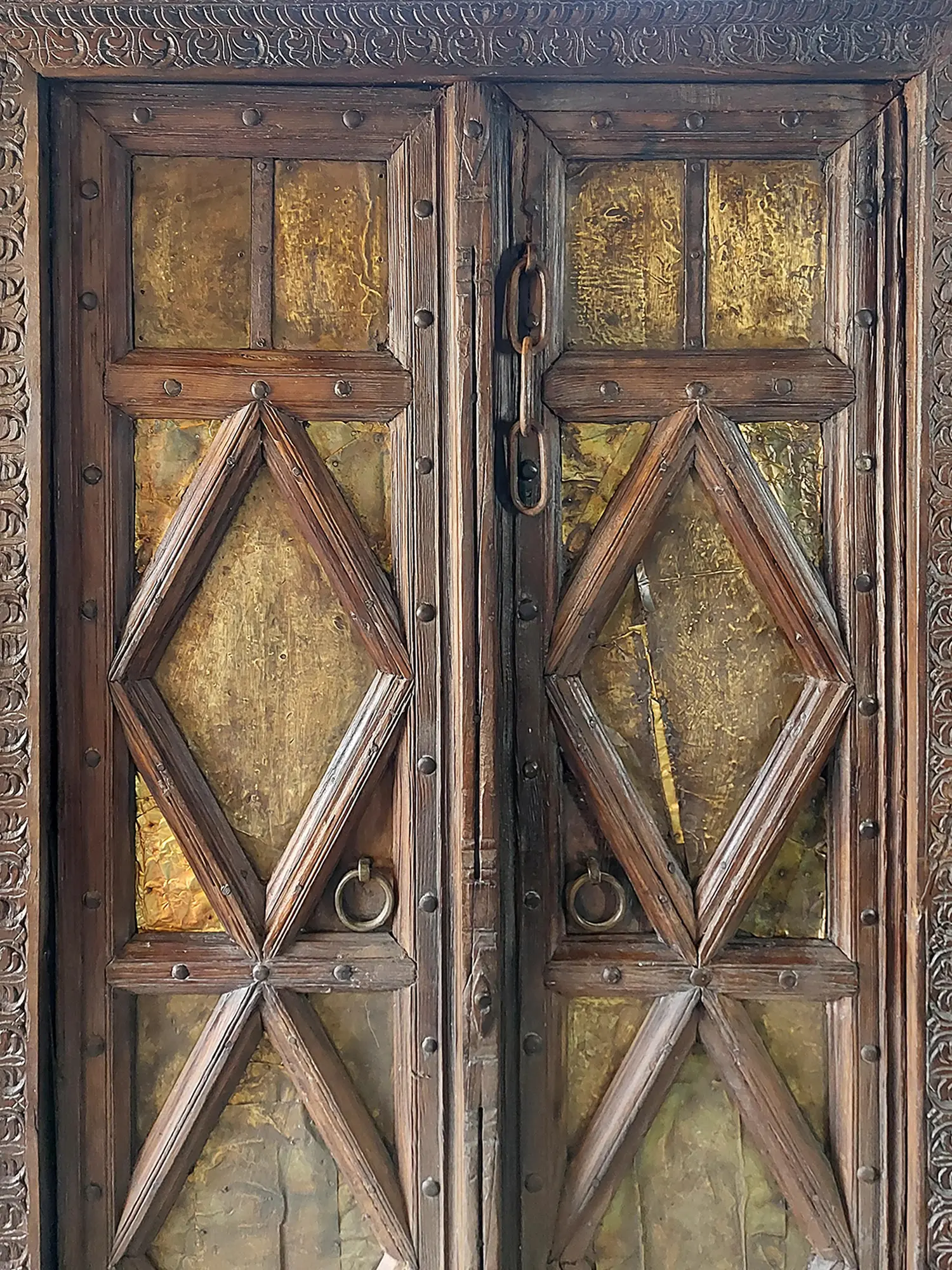 This door has been handcrafted using time-honored techniques passed down through generations. The wood, carefully selected for its strength and beauty, has been worked with precision and passion. The antique finish adds a layer of depth and character, emphasizing the door's unique history. No two pieces are ever identical, and this distinctive quality ensures that your door will be a truly one-of-a-kind statement piece. It is evident in the detailing that artisans of the past poured their heart and soul into every aspect of the door, from the ornate frames to the metal accents. The attention to detail is not just visually stunning, it’s a testament to the legacy of impeccable standards that are the hallmark of Rajasthani design.