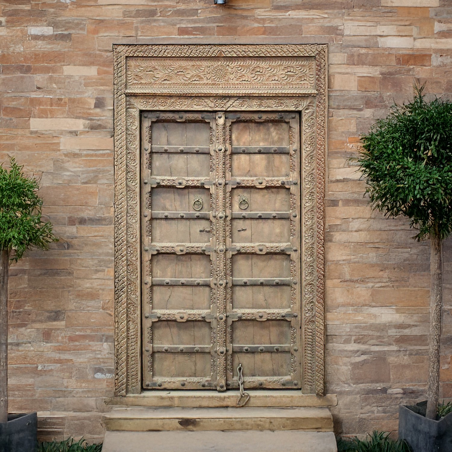 This antique double door is elaborately carved and detailed that demonstrate the traditional Indian patterns and motifs. It is made of solid wood that makes it last up to many years without getting damaged or decayed. The color of the door resembles that of desert sand and the rustic look gives it a raw vintage look. Two round metallic handles have also been added to the door which is another element of traditionality. If you have a big palatial home, you should install this large-sized door that will turn your home into a royal palace.