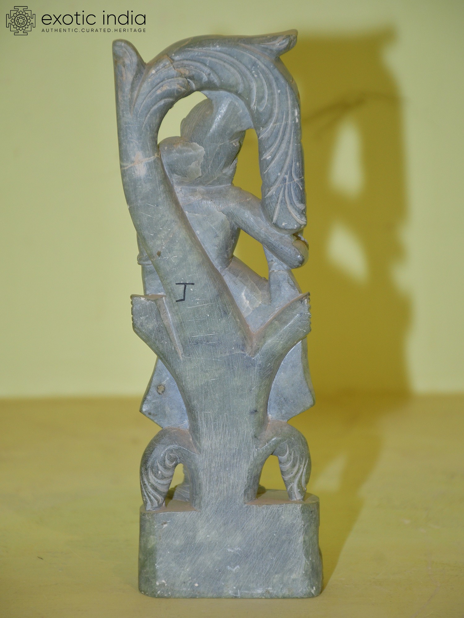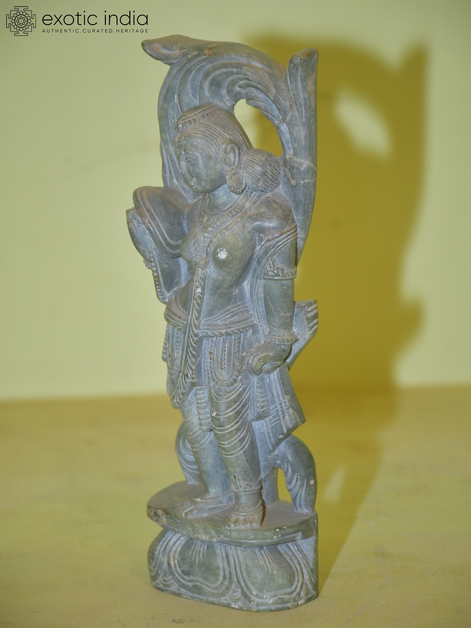 This exquisite hand-carved statue captures a moment of serene introspection, depicting a beautiful lady gazing at her reflection in a mirror. Crafted with meticulous detail from traditional Orissa stone, this piece is a testament to the rich heritage of Indian artistry. The cool, earthy tones of the stone lend a sense of natural elegance, while the sculptor's skillful hands have brought forth a figure imbued with grace and charm.
