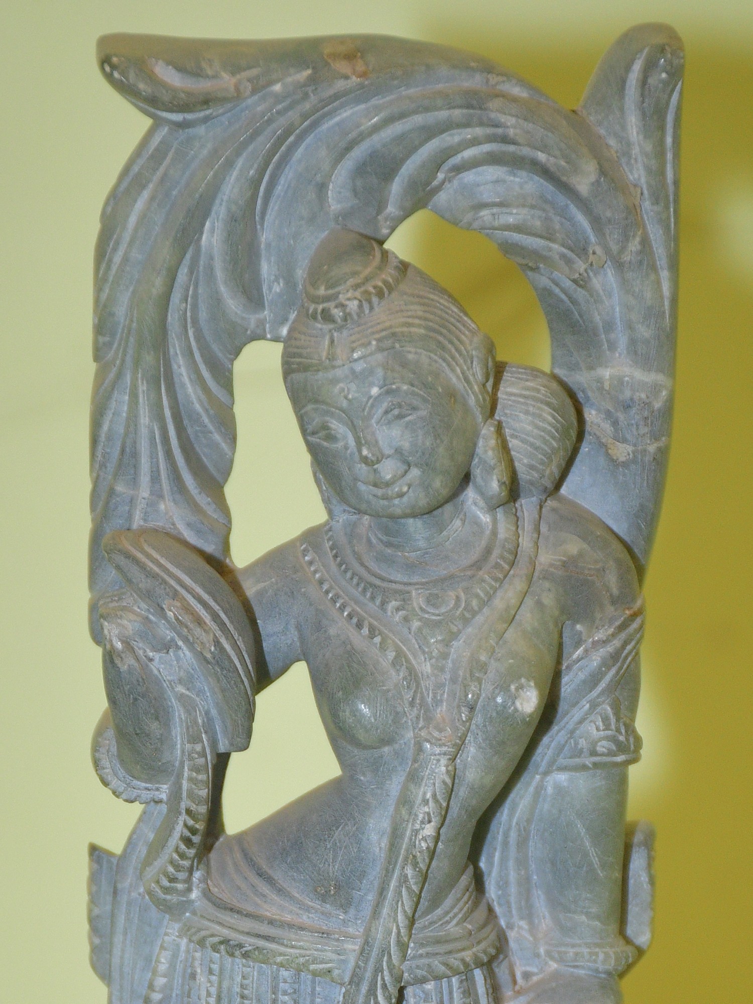 The statuette portrays a lady with flowing hair, adorned with intricate jewelry that speaks of refined taste. Her delicate features and posture convey a sense of quiet contemplation. The draped garments are rendered with such precision that they appear to softly cascade around her form. The inclusion of a decorative motif behind her, perhaps representing a stylized archway or natural element, adds depth and context to the composition. Each line and curve has been carefully chiseled, showcasing the artisan's mastery over their medium and their deep understanding of form and aesthetic.