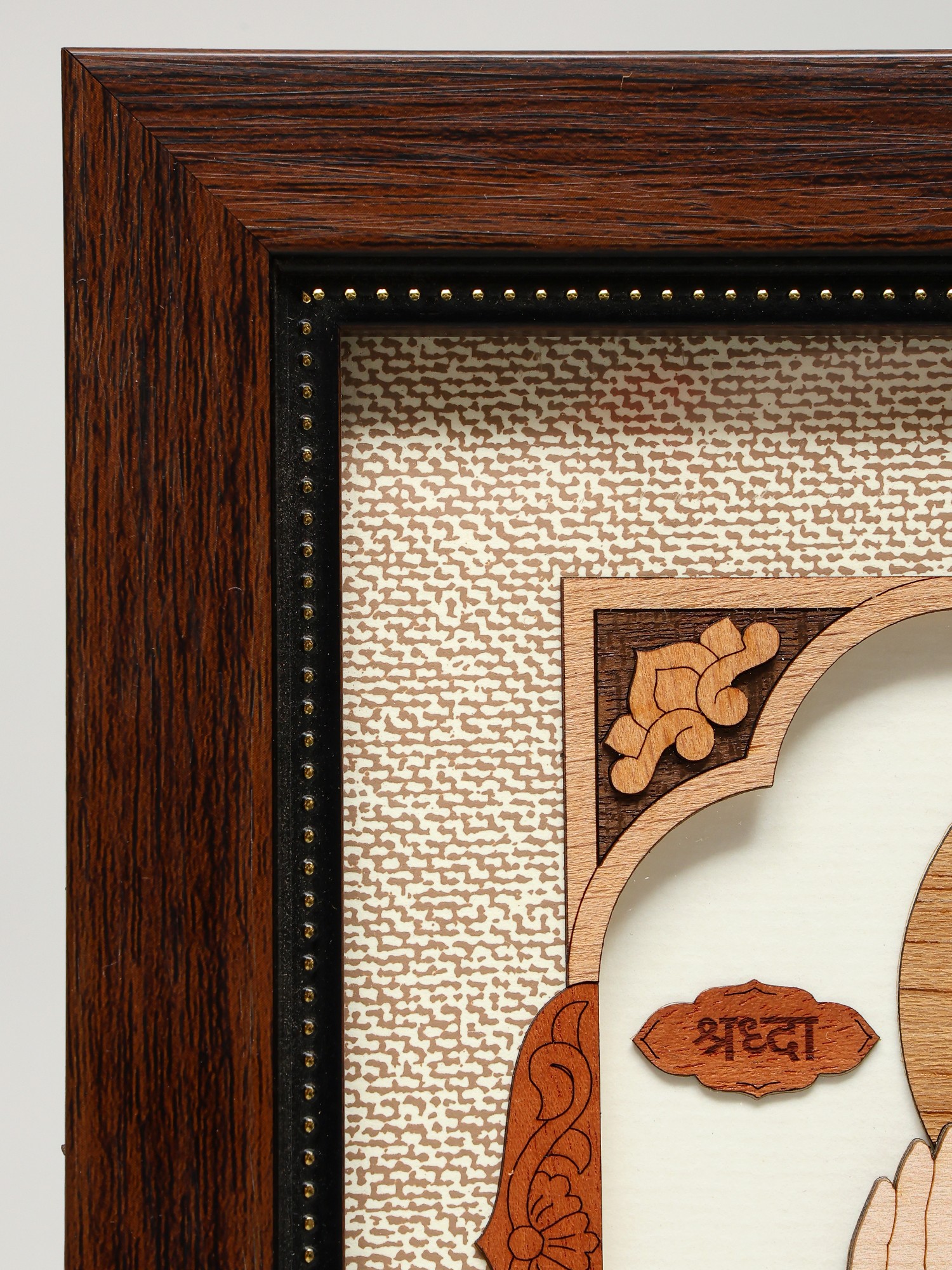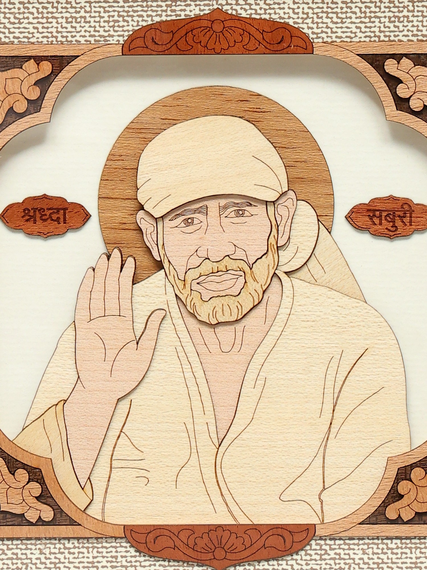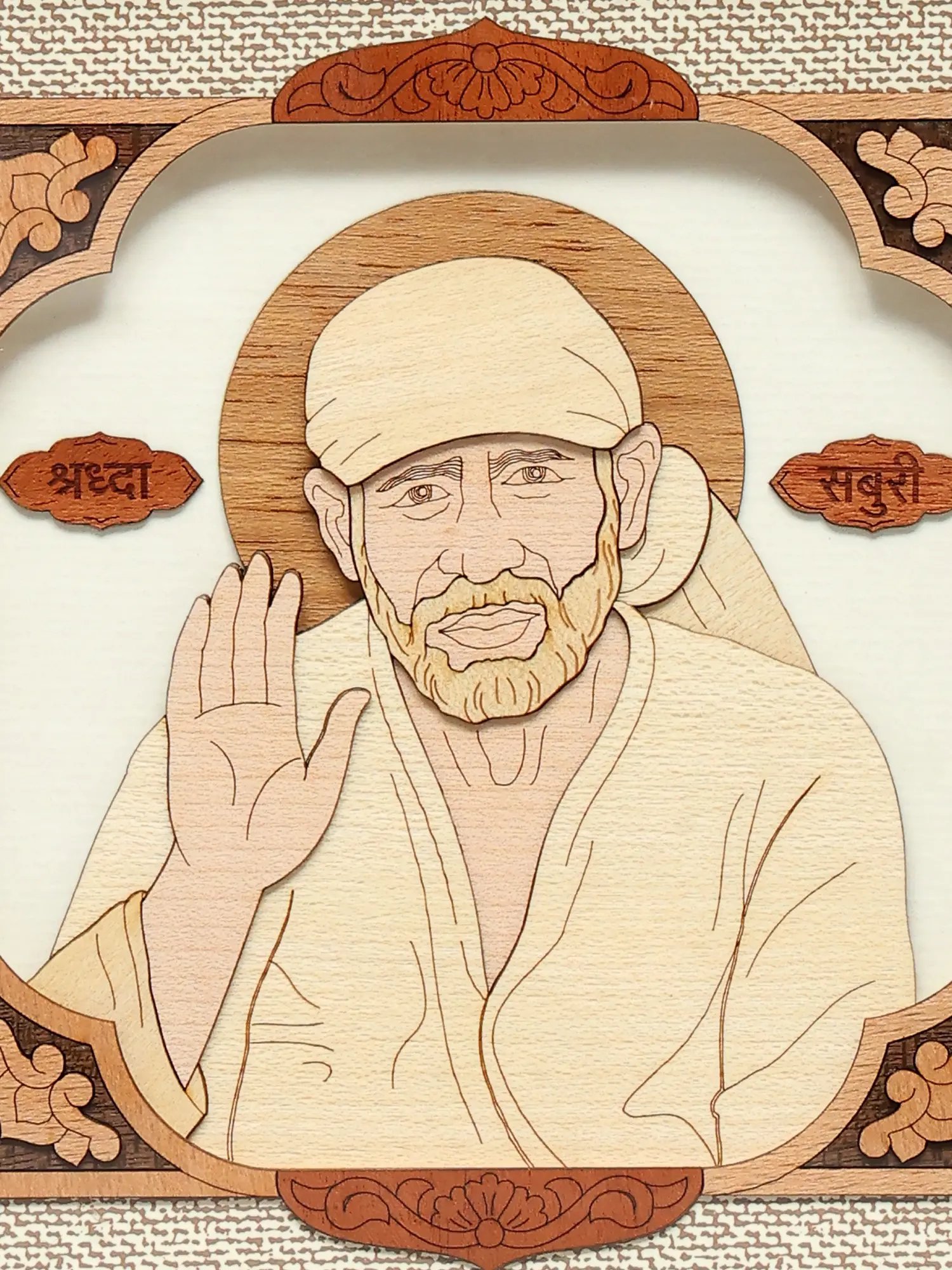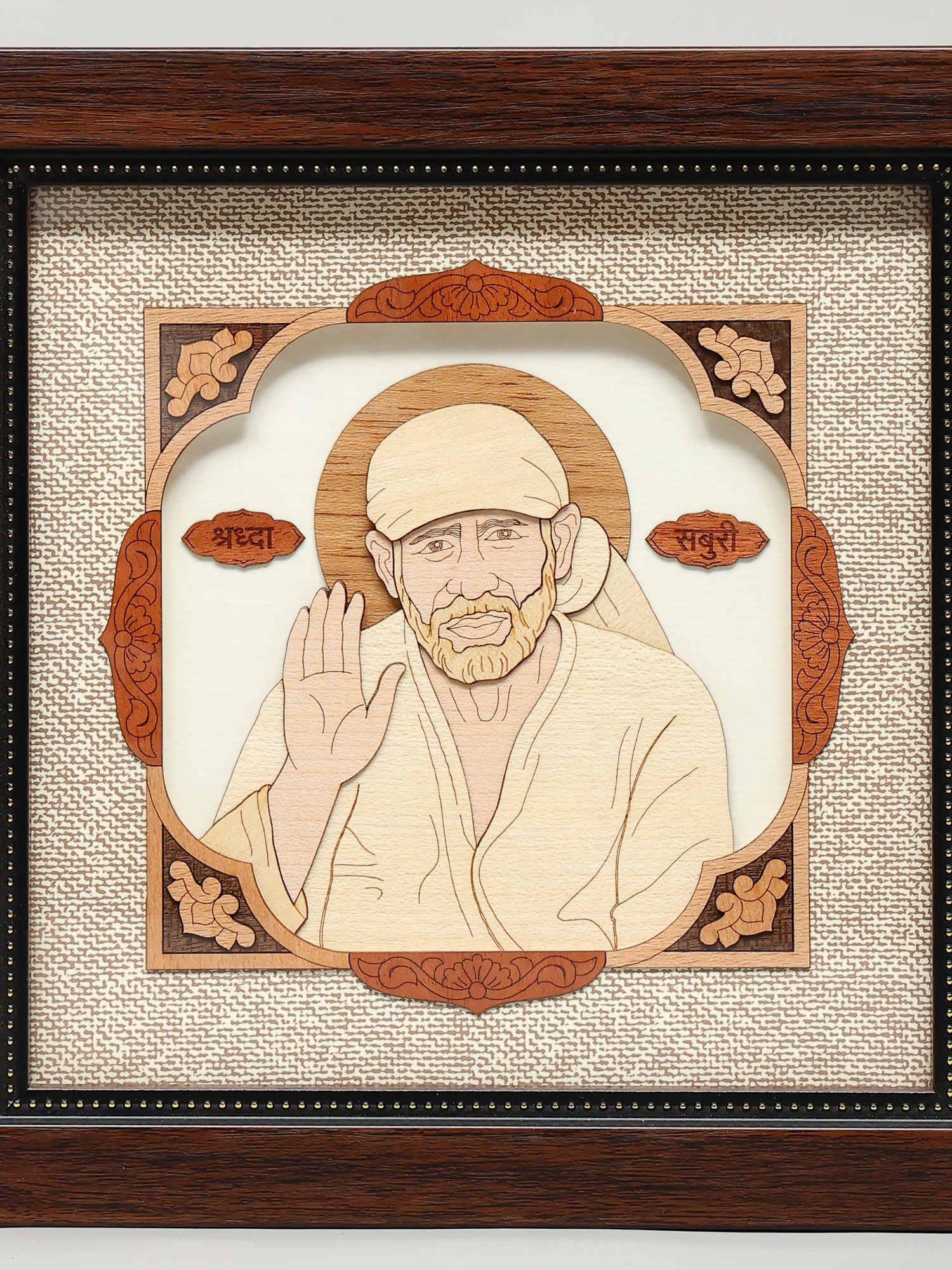 Each element of this wall hanging speaks of skillful artistry. The detailed depiction of Sai Baba, with his benevolent expression and gesture of blessing, is carefully etched into the wood. Notice the fine lines that define his facial features and the flowing drapery of his robe. The artwork benefits from the textural contrast between the light wooden figure and the slightly darker background, adding depth and visual interest.