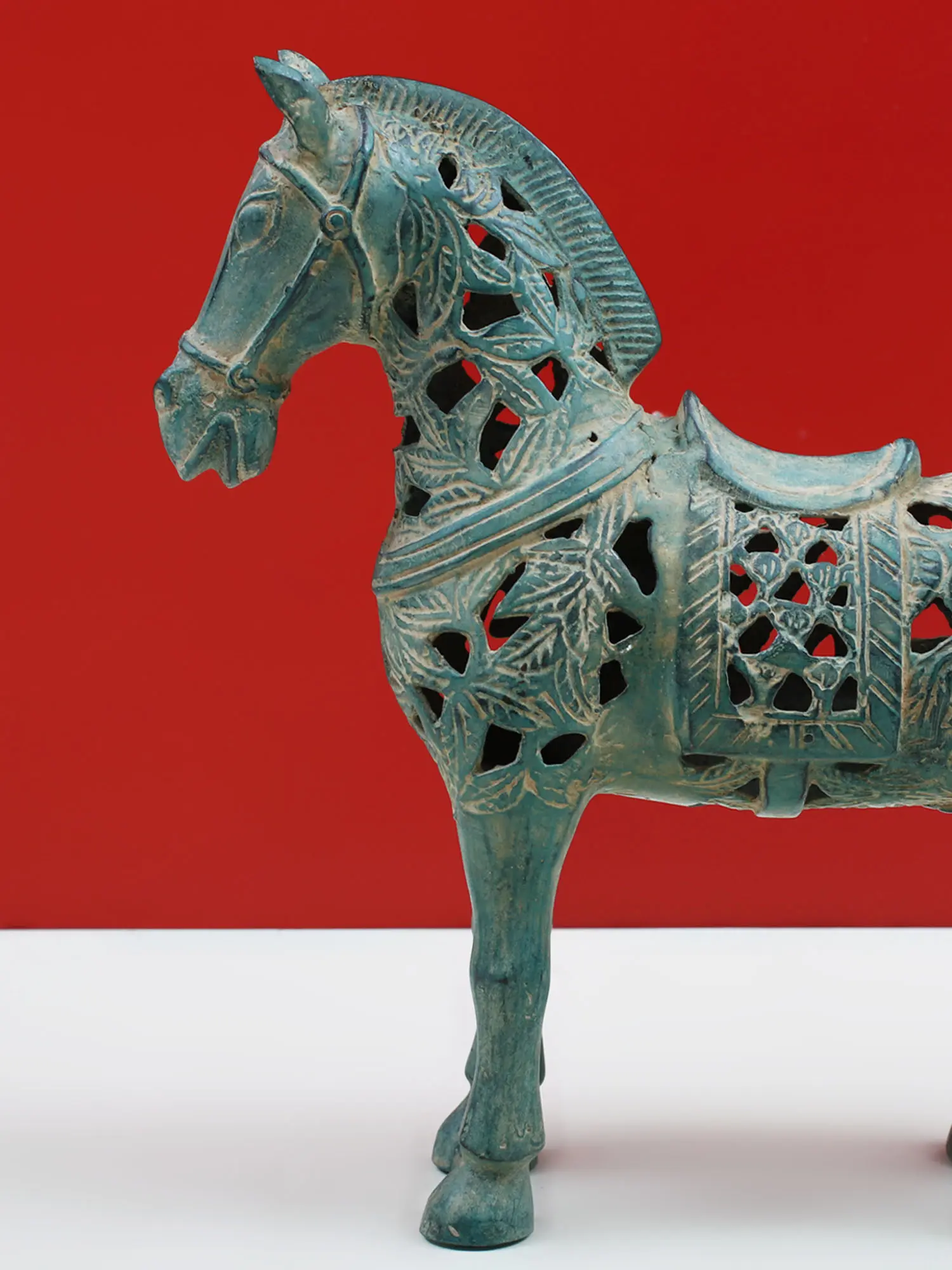 In the Vedas, the horse holds a deeper significance. "It depicts life's immense dynamic power, vital and nervous energy. It is a force, a figure of prāṇa, the universal life energy. This Brass Decorative Horse with a Jaal pattern as the decoration on the abdomen is a curious case of art that mixes traditional motifs with the deep symbolism of the animal kingdom in Indian culture. This statue depicts a standing horse with leaves linked as adornment. The statue is coated in a blue patina to resemble an ancient object. Placing this statue at home will remind the beholder to be patient and determined while chasing a dream.
