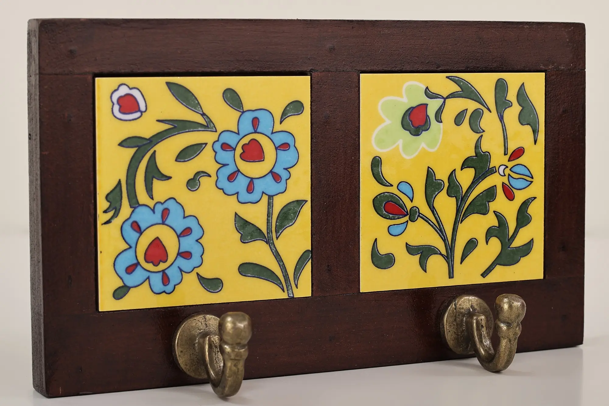 Hard work is the key to success, and this keyholder is a key to elevated home decor style. Crafted in rich brown wood, it features two sturdy hooks for easily organizing keys. Adding a delightful touch, the holder is adorned with vibrant, bright-colored ceramic tiles, enhancing functionality and aesthetics. This fusion of practicality and artistic flair makes it a perfect accent for any space. It offers a stylish solution to keep keys in check while infusing a pop of color into your daily routine.