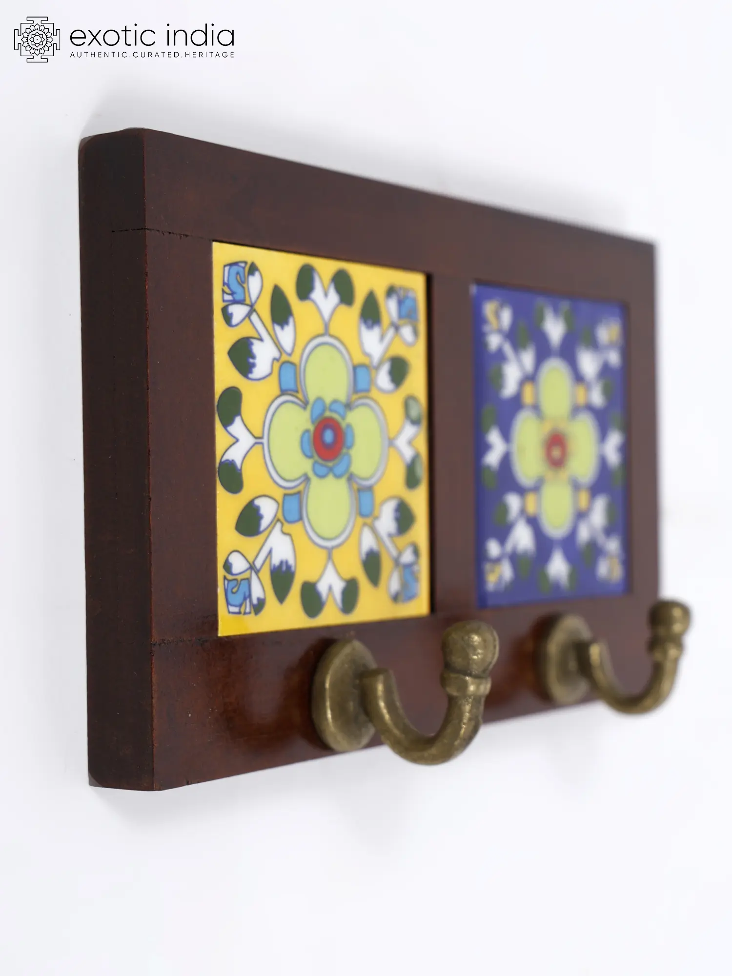 The stunning colorful ceramic tiles with floral motifs are set on a wooden frame, which is also fastened to two brass hooks. When mounted on a wall, this piece offers an excellent solution for hanging clothes and bags while also improving the aesthetics of the walls.