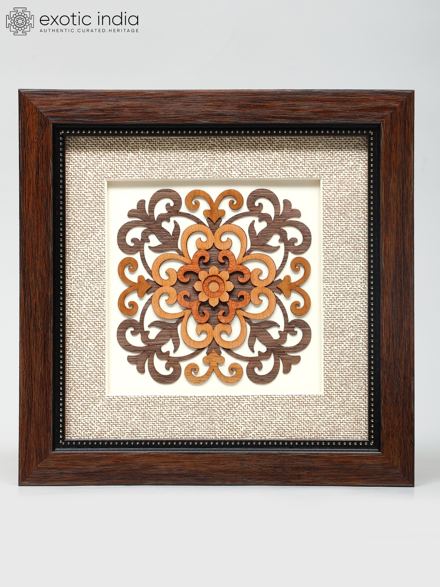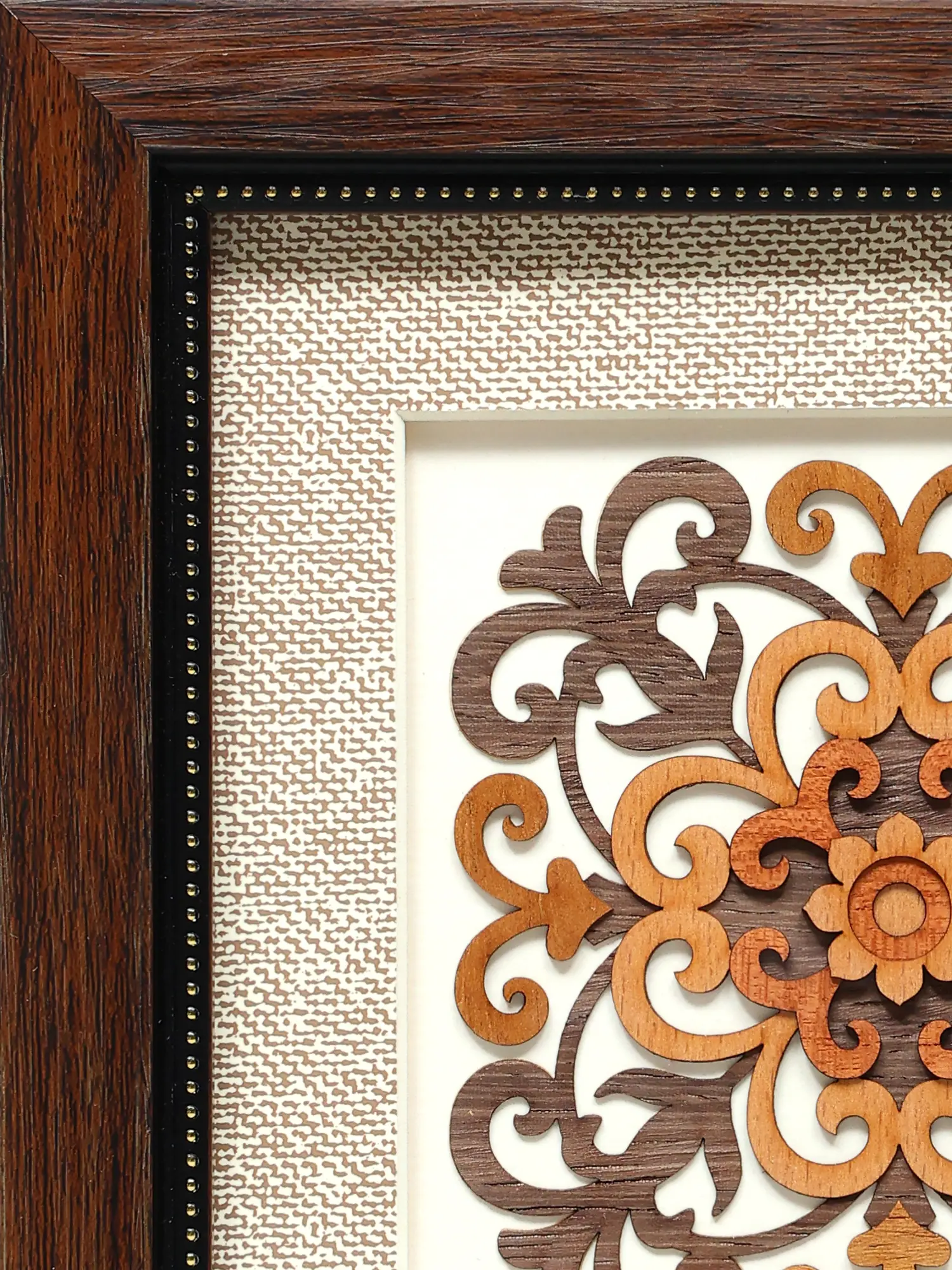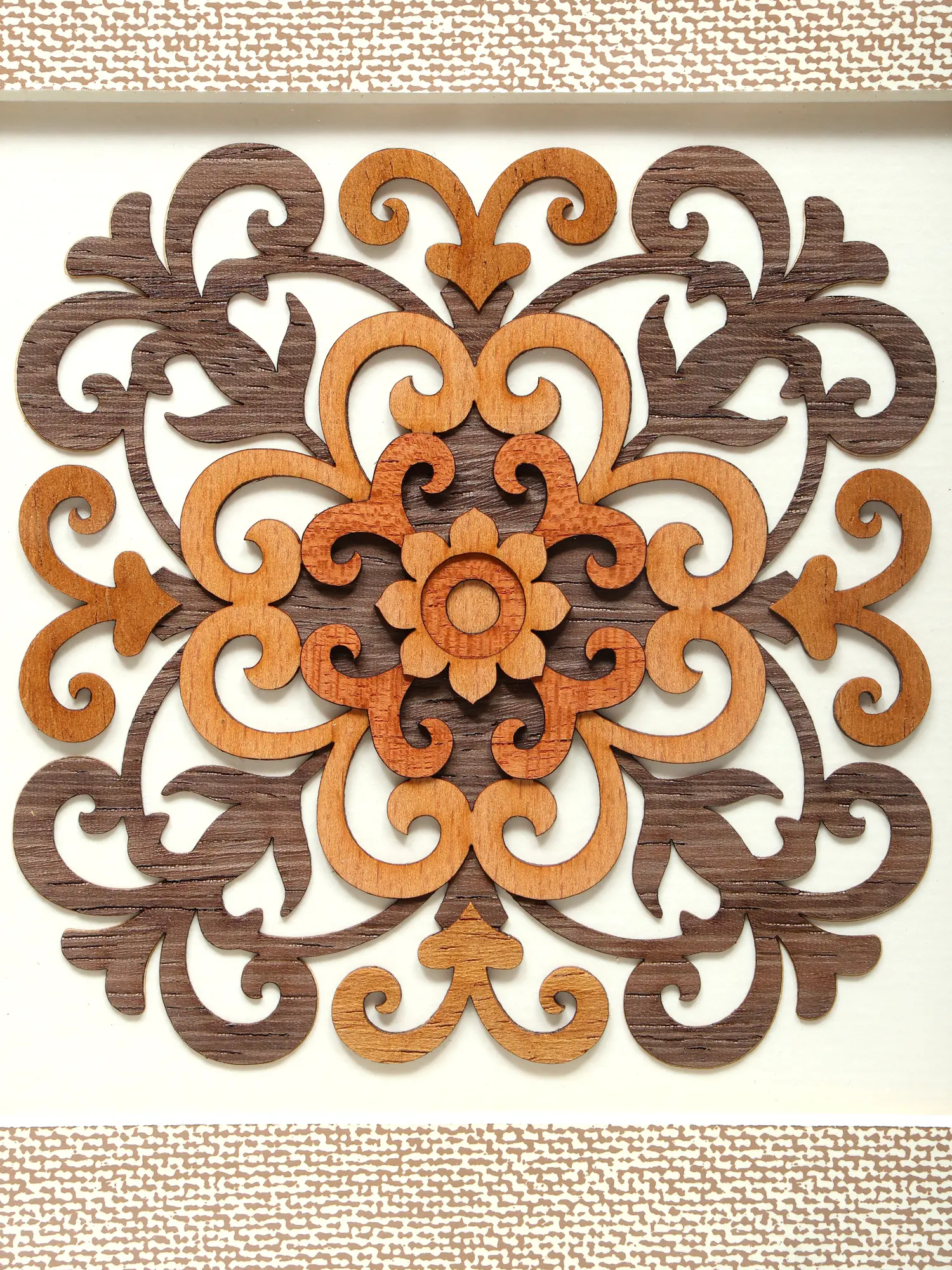 The true heart of this piece lies in the central wood carving. Masterfully rendered, the carving features a symmetrical, floral-inspired design with swirling motifs that create a mesmerizing visual effect. The contrast between the light and dark wood adds dimensionality, making the design appear to come alive. The carving is meticulously layered, giving the piece a unique depth and tactile appeal. The carving is set against a textured background, adding another layer of visual interest. This neutral-toned backdrop allows the detail of the wood carving to truly stand out, ensuring that it becomes the focal point. The framed design offers a complete and polished look, ready to be displayed and admired.