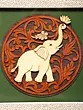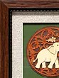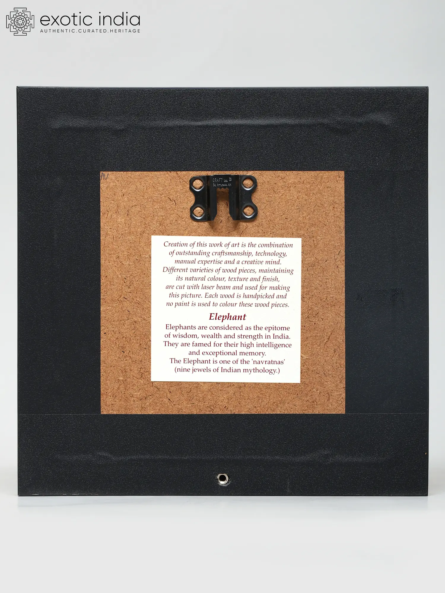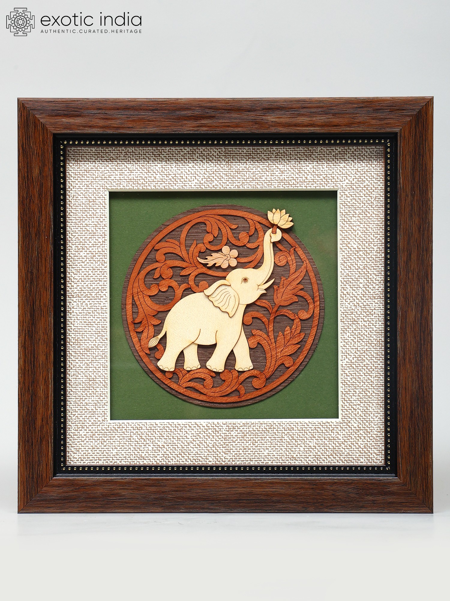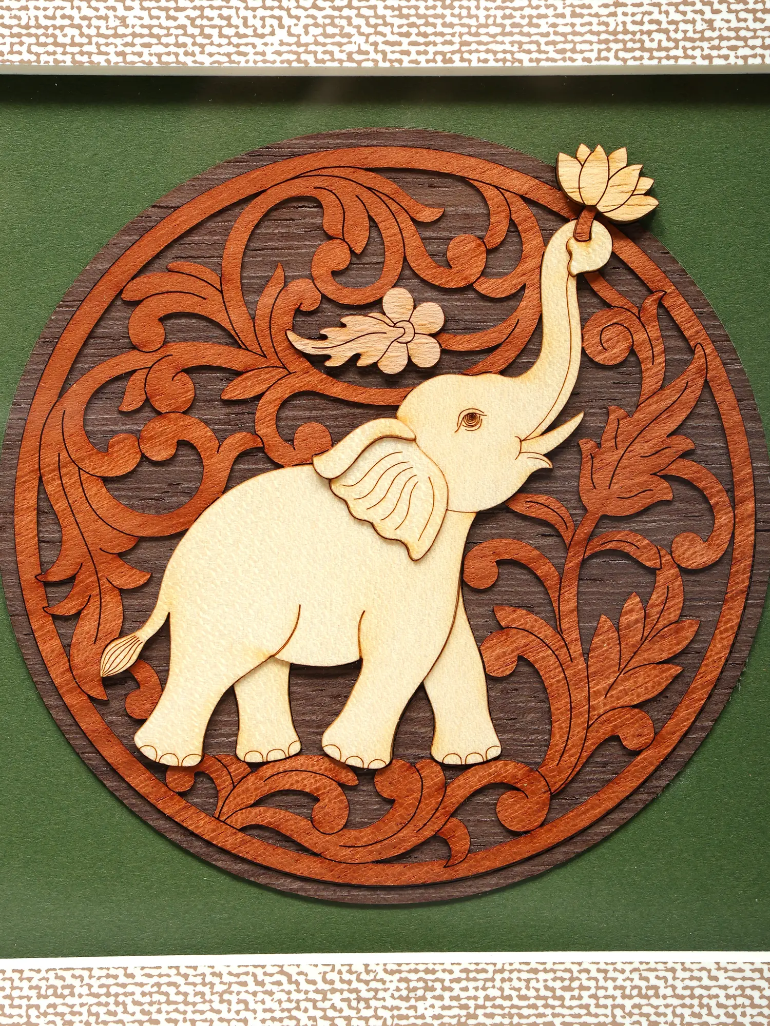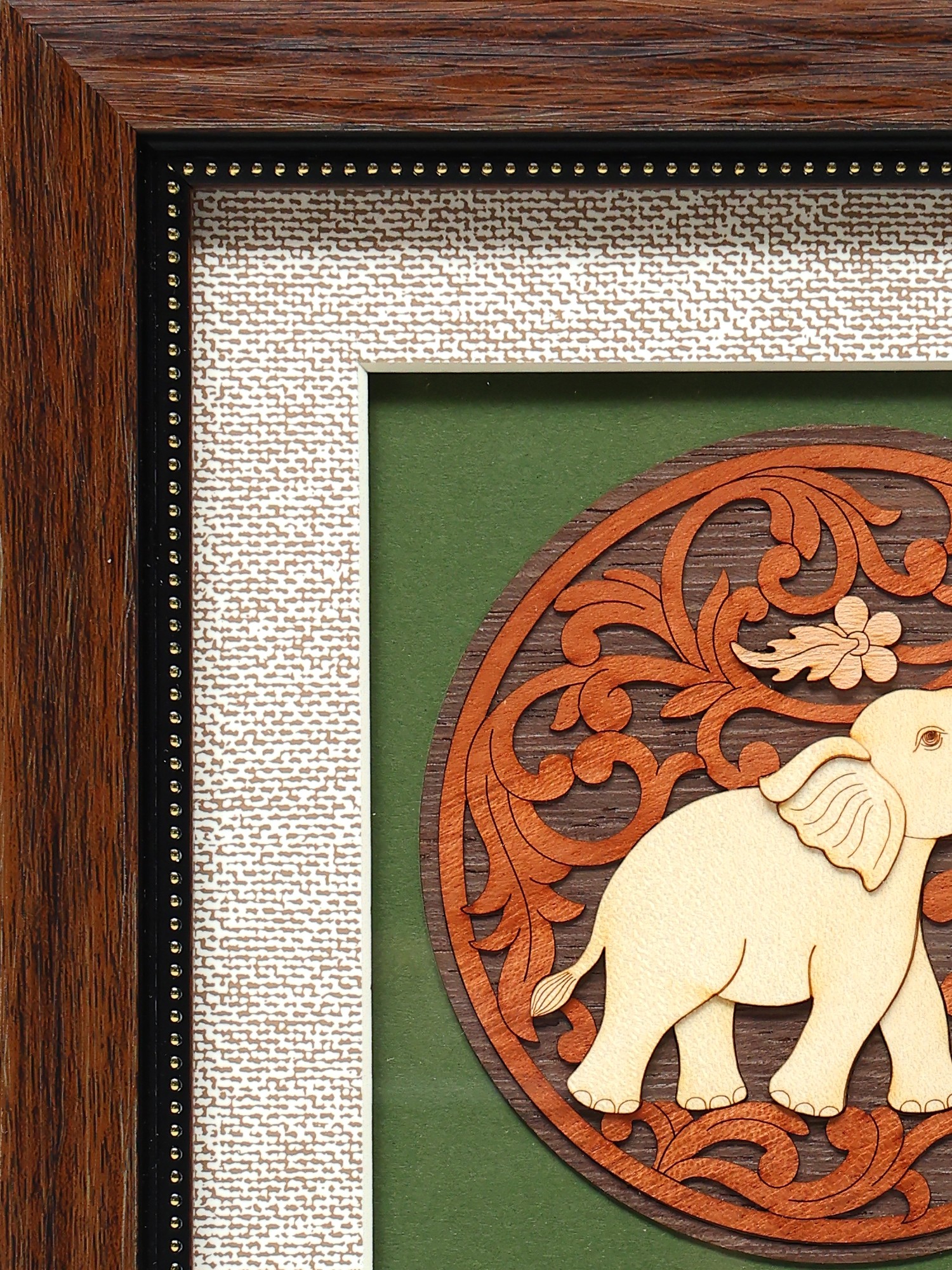 Transform your living space with this captivating piece of wall art. This framed wood carving presents a charming scene of an elephant, trunk raised high, gently holding a delicate flower. It's a delightful tableau that embodies serenity and grace, bringing a touch of nature and tranquility to any room. The detailed carving showcases the skill and artistry of the craftsman, making it more than just a decoration, but a unique piece of art. The image itself is a beautiful arrangement of form and detail. The elephant, rendered in a light, natural wood tone, stands out against a circular backdrop. This backdrop features elegantly swirling vines and foliage cut from a darker wood. The contrast between the light and dark wood tones creates depth and visual interest, drawing the eye to the intricate details of the carving.