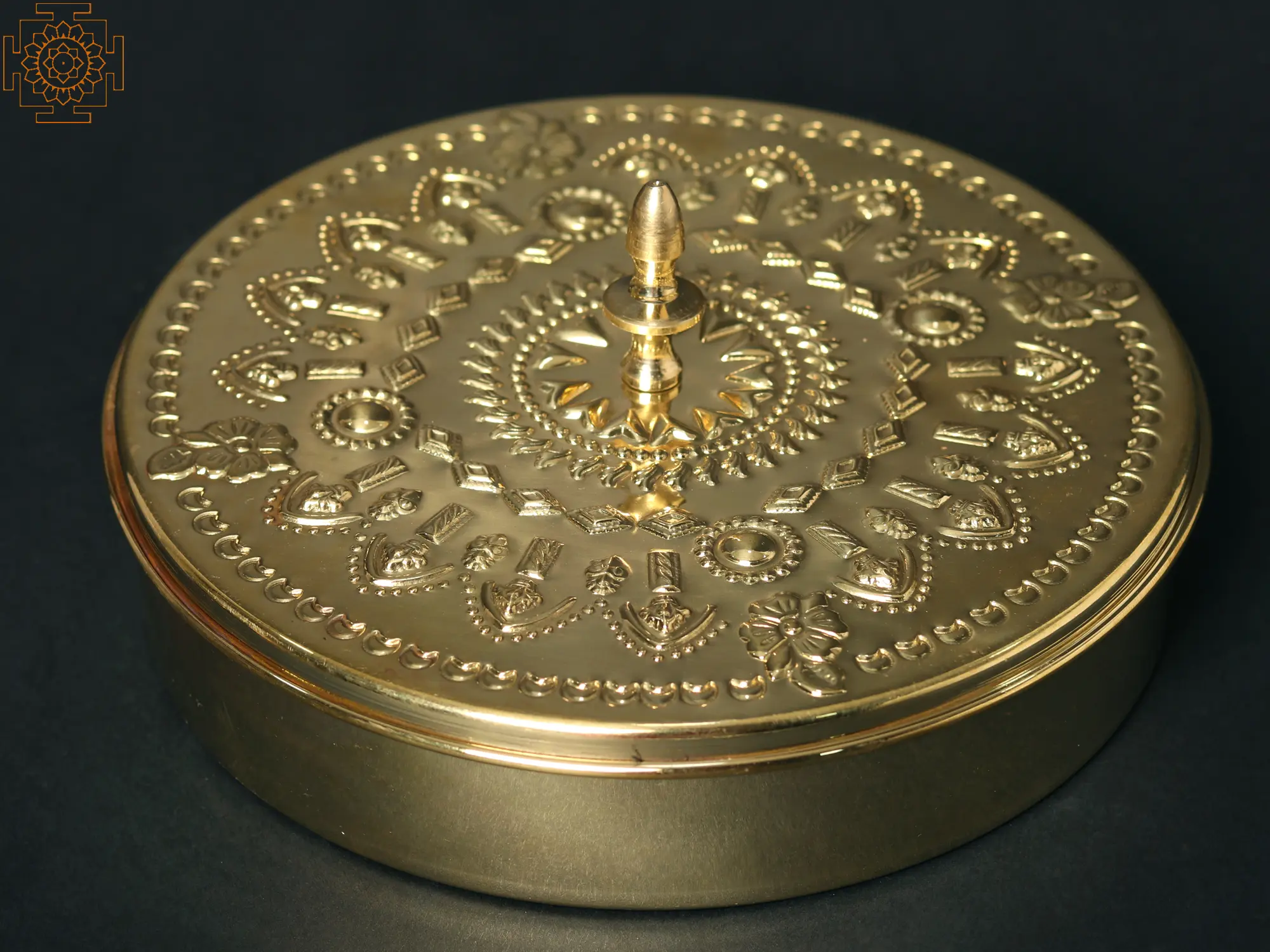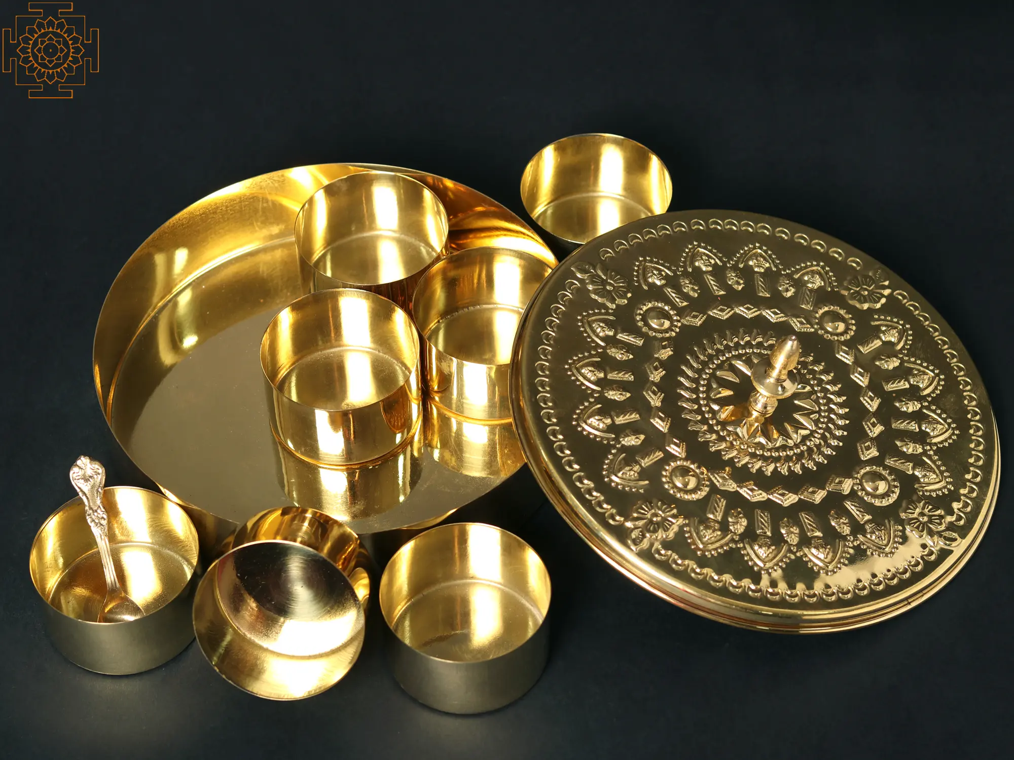 In Indian cooking, spices hold a special significance. They are maintained and kept in storage for a longer time. modest containers are maintained in kitchens to keep a modest quantity of spices for convenience. A classic culinary gem that improves the art of spice organization is this circular brass masala box. It has seven gorgeous little masala jars within, each with a luxurious golden luster. The spice box comes with a tiny spoon to ensure smooth spice distribution. The spice box's lid has a pretty handle and charming images of Alpana delicately engraved on it. This masala box is embellished with beautiful carvings, transcending practicality to become a lavish heritage that future generations will treasure.