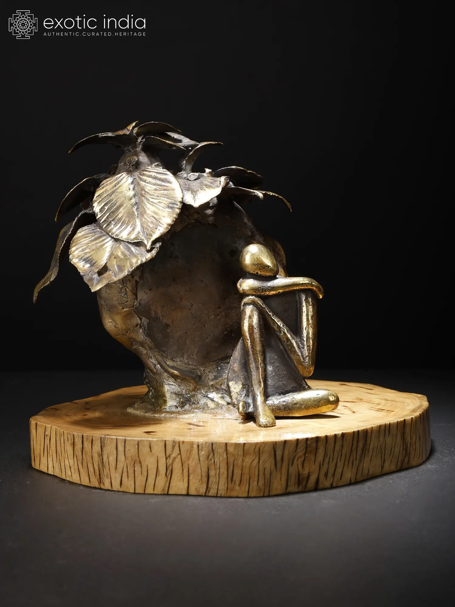 This Brass, Wood, and Stone sculpture portrays a profound moment of introspection, depicting a man seated under a tree, deeply engrossed in contemplation. The man's body, crafted from stone, seamlessly merges with the trunk of the tree, symbolizing a deep connection with nature and inner harmony. With his posture suggesting deep thought and reflection, the sculpture captures the essence of existential pondering and life's mysteries.