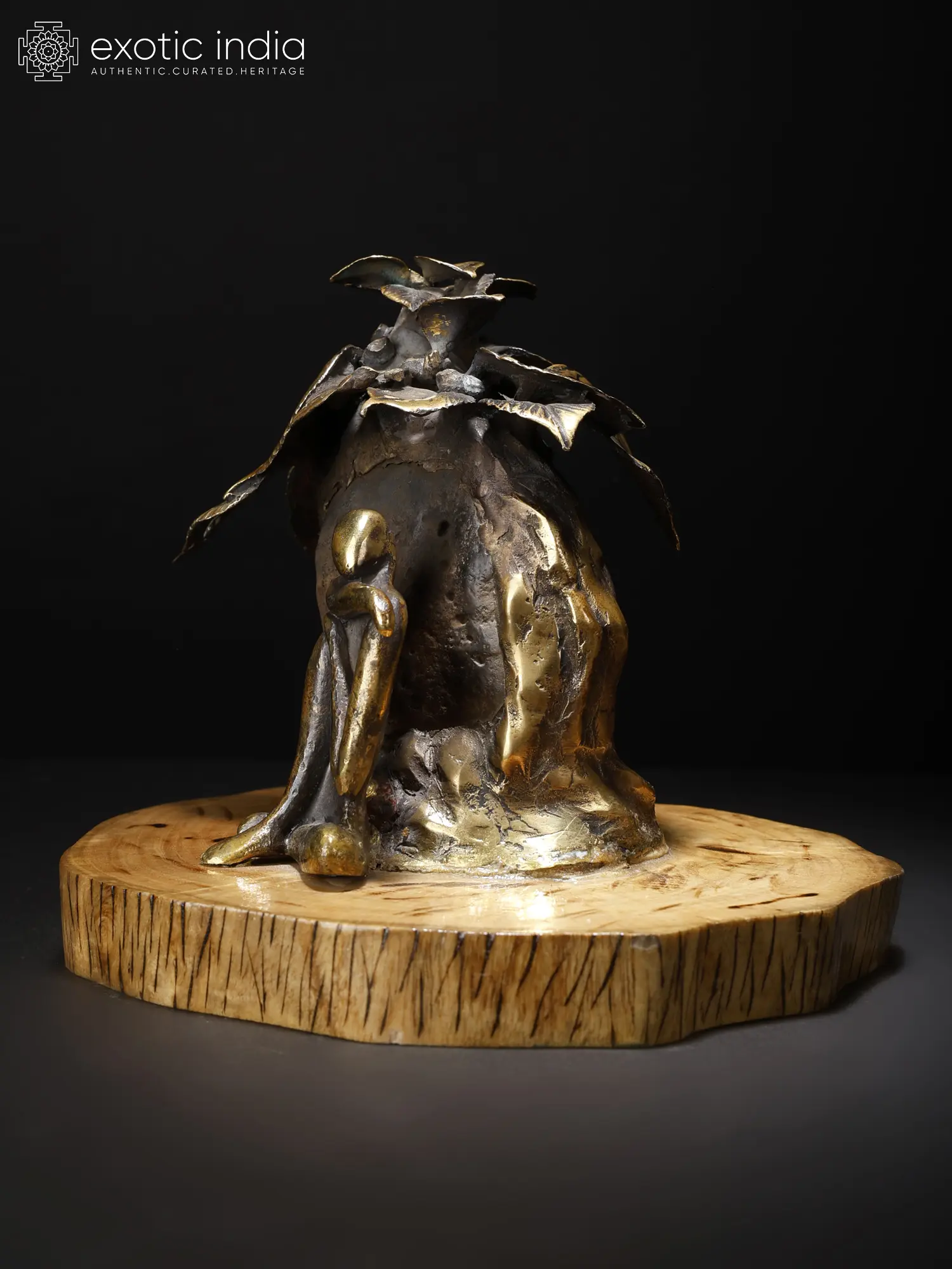 The statue is placed above a wooden base. The combination of brass, wood, and stone materials adds depth and texture to the piece, enhancing its evocative beauty. This sculpture invites viewers to reflect on their own journeys and find solace in the tranquility of introspection.