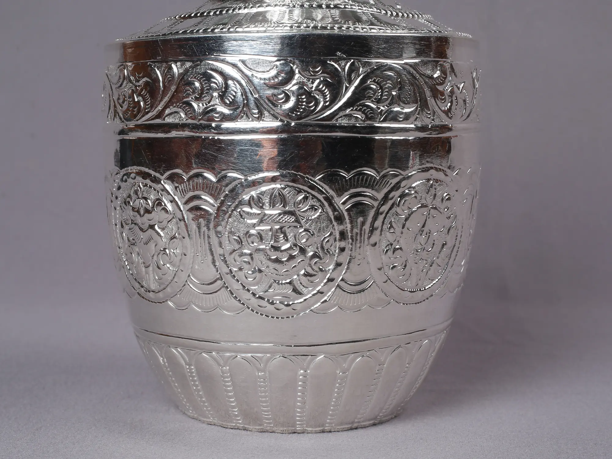 Showcasing you the exquisitely crafted silver flower container featuring Ashtamangala engravings from Nepal, a work of cultural value and masterful craftsmanship. This flower pot is a representation of wealth, spirituality, and tradition since it was painstakingly made and decorated with elaborate ashtamangala designs. The artistry and expertise of Nepalese craftsmen, who have refined their trade over generations, are evident in every detail of this silver pot. The pot is imbued with holy symbolism and positive energy by the ashtamangala etching, which represents eight fortunate symbols in Hindu and Buddhist traditions.