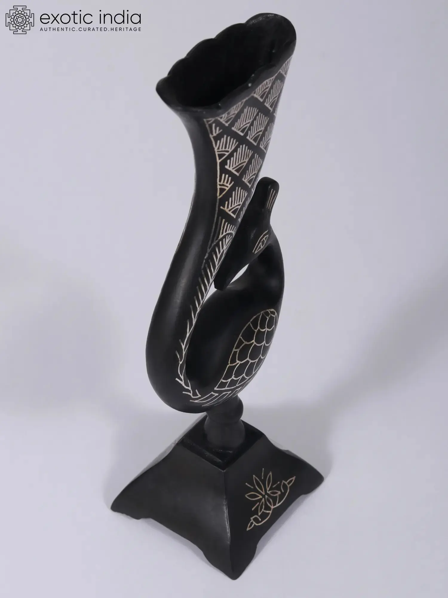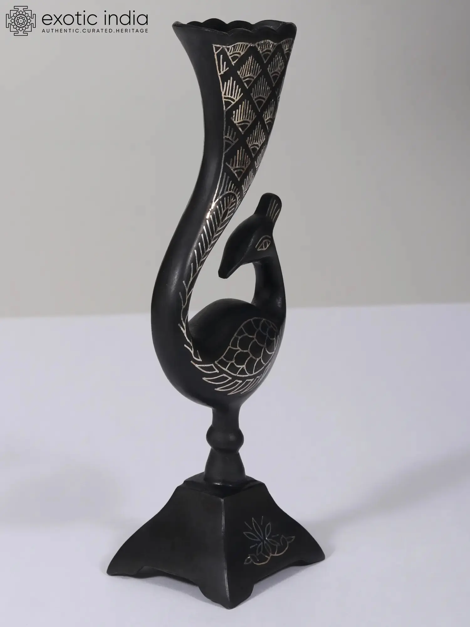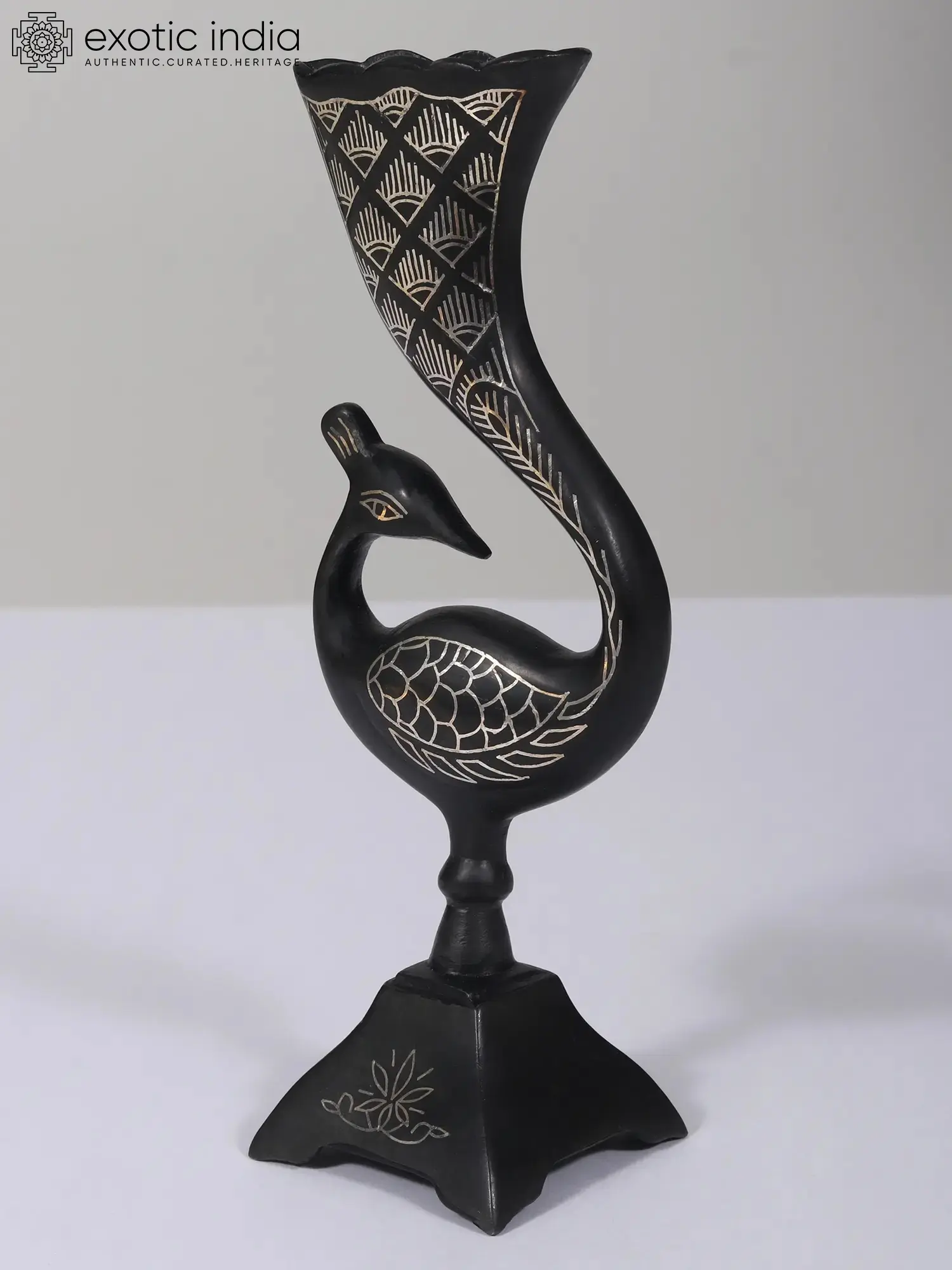 This Small Attractive Peacock Flower Vase, crafted with Bidri Artwork from Gunmetal adorned with Real Silver, exudes elegance and charm. The intricate detailing of peacock motifs and floral patterns showcases the finesse of Bidri craftsmanship, renowned for its artistic precision. The use of real silver adds a touch of opulence, enhancing the vase's beauty with a shimmering allure.