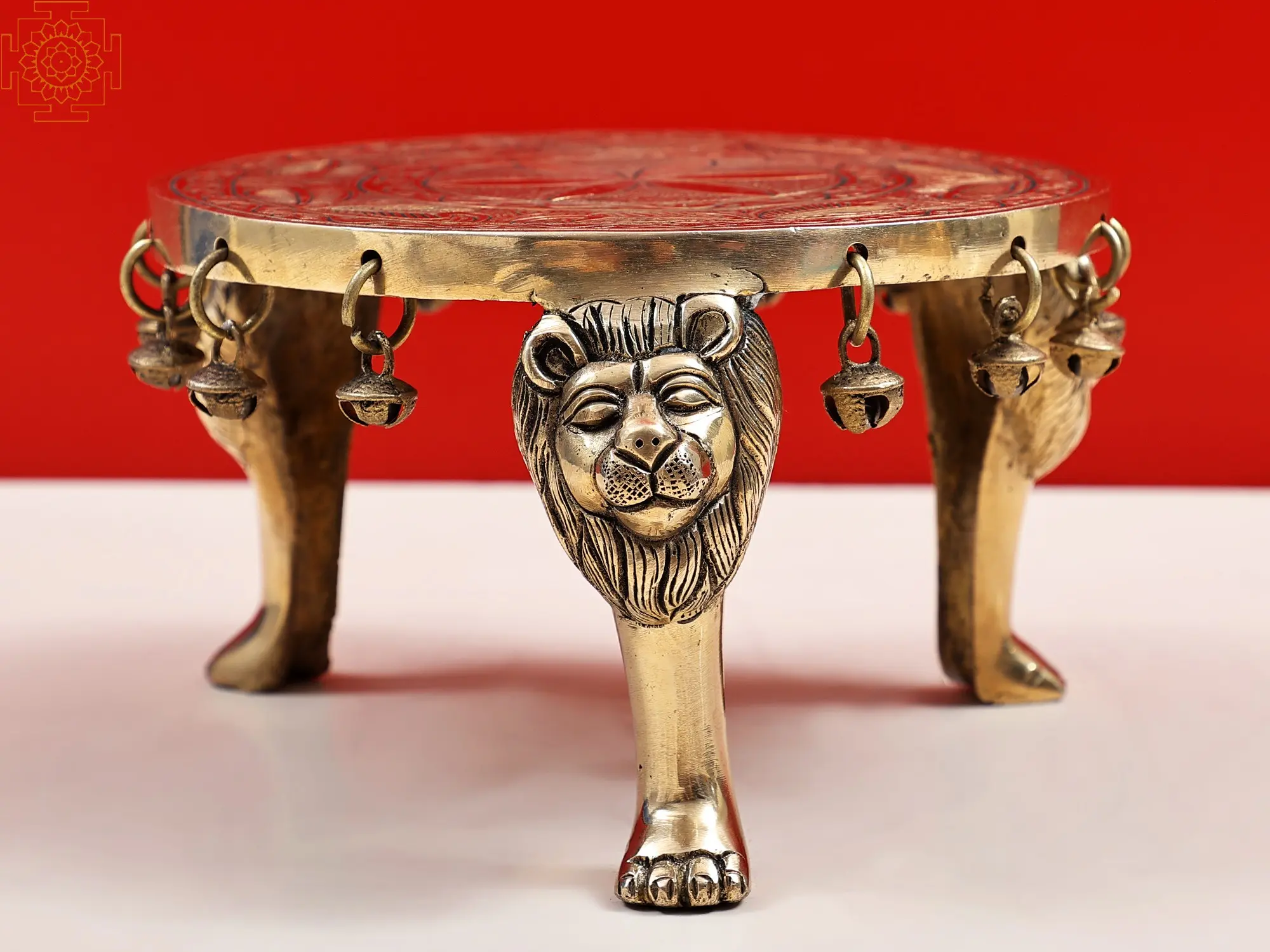 This Small Brass Lion Leg Chowki with Ghungroo is a captivating blend of elegance and tradition. Its intricate lion leg design exudes regal charm and strength. Adorned with ghungroos, the traditional Indian ankle bells, add a musical element to its aesthetic appeal. This chowki serves as a versatile platform for various purposes, from displaying sacred idols to performing rituals.