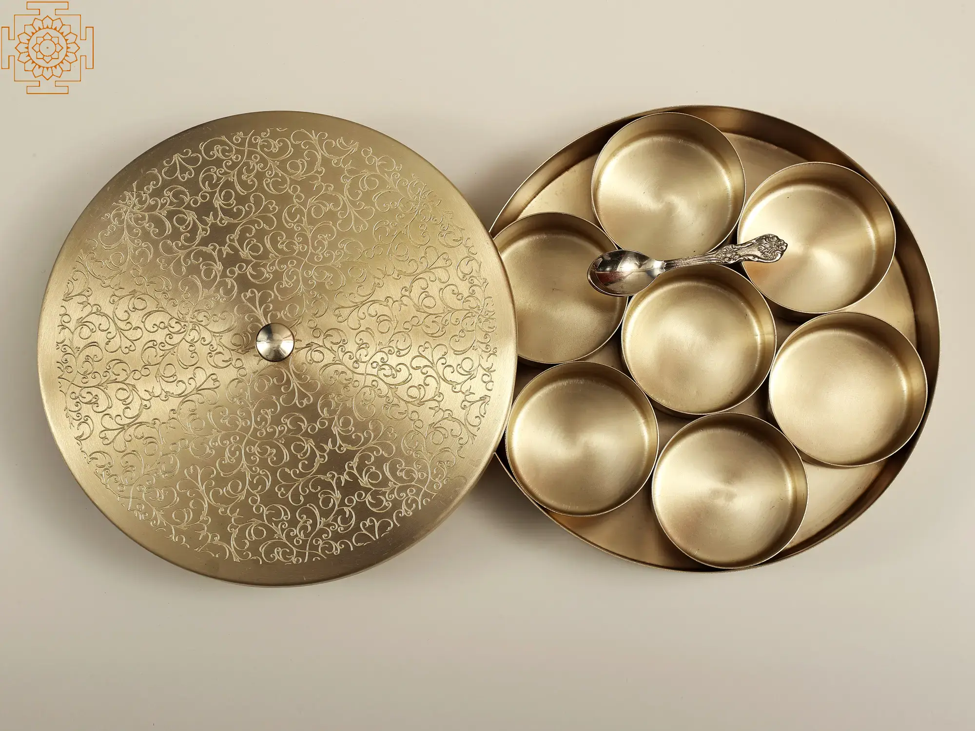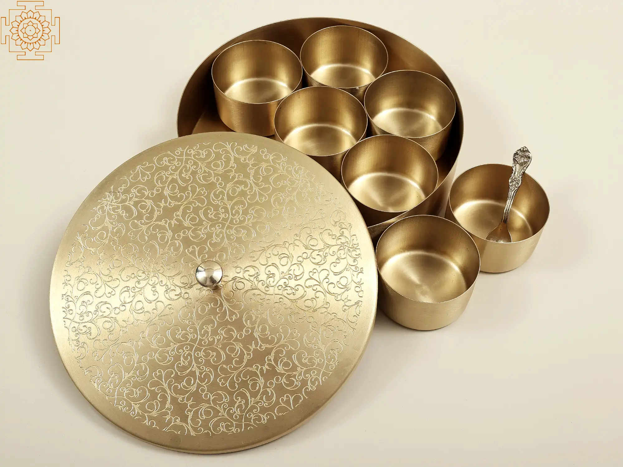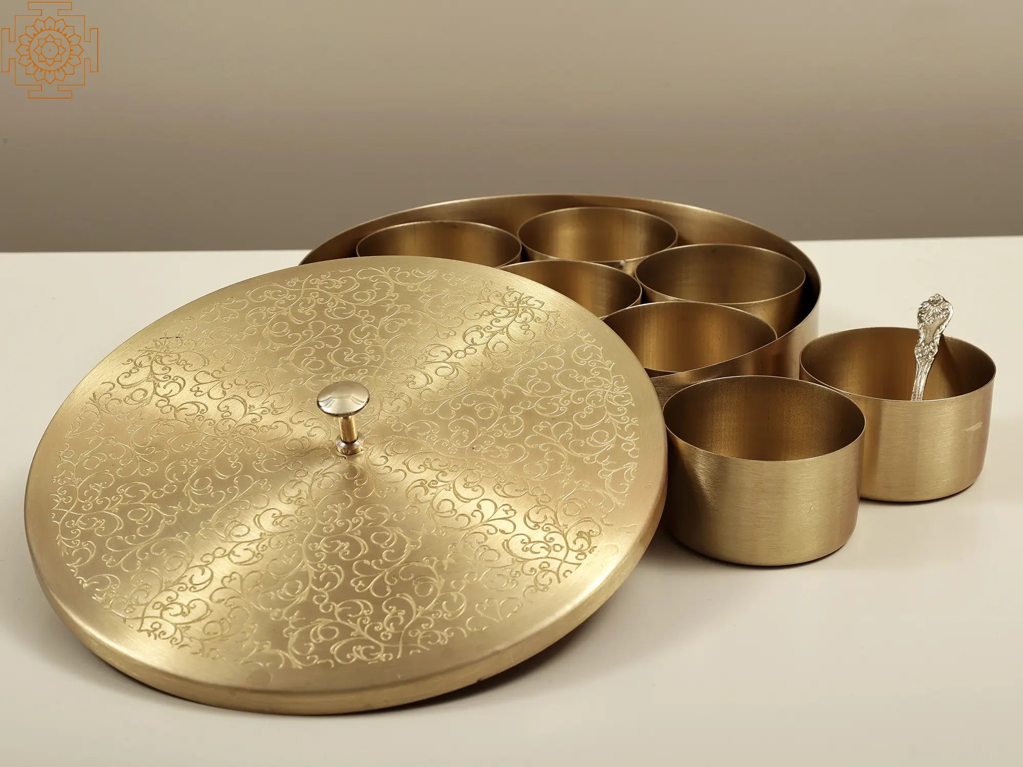 This handcrafted brass masala box is a quintessential kitchen accessory for any culinary enthusiast. A harmonious blend of utility and traditional design, it features a beautifully etched lid that adds an element of sophistication to your spice storage. The individual compartments within are perfect for organizing a variety of spices, keeping them fresh and within easy reach. This spice box is not just about functionality; the warm glow of brass also infuses your kitchen with a hint of rustic charm. It’s a thoughtful gift for a home chef or a splendid addition to your own kitchen, bringing the art of Indian spice blending into your home cooking experience.