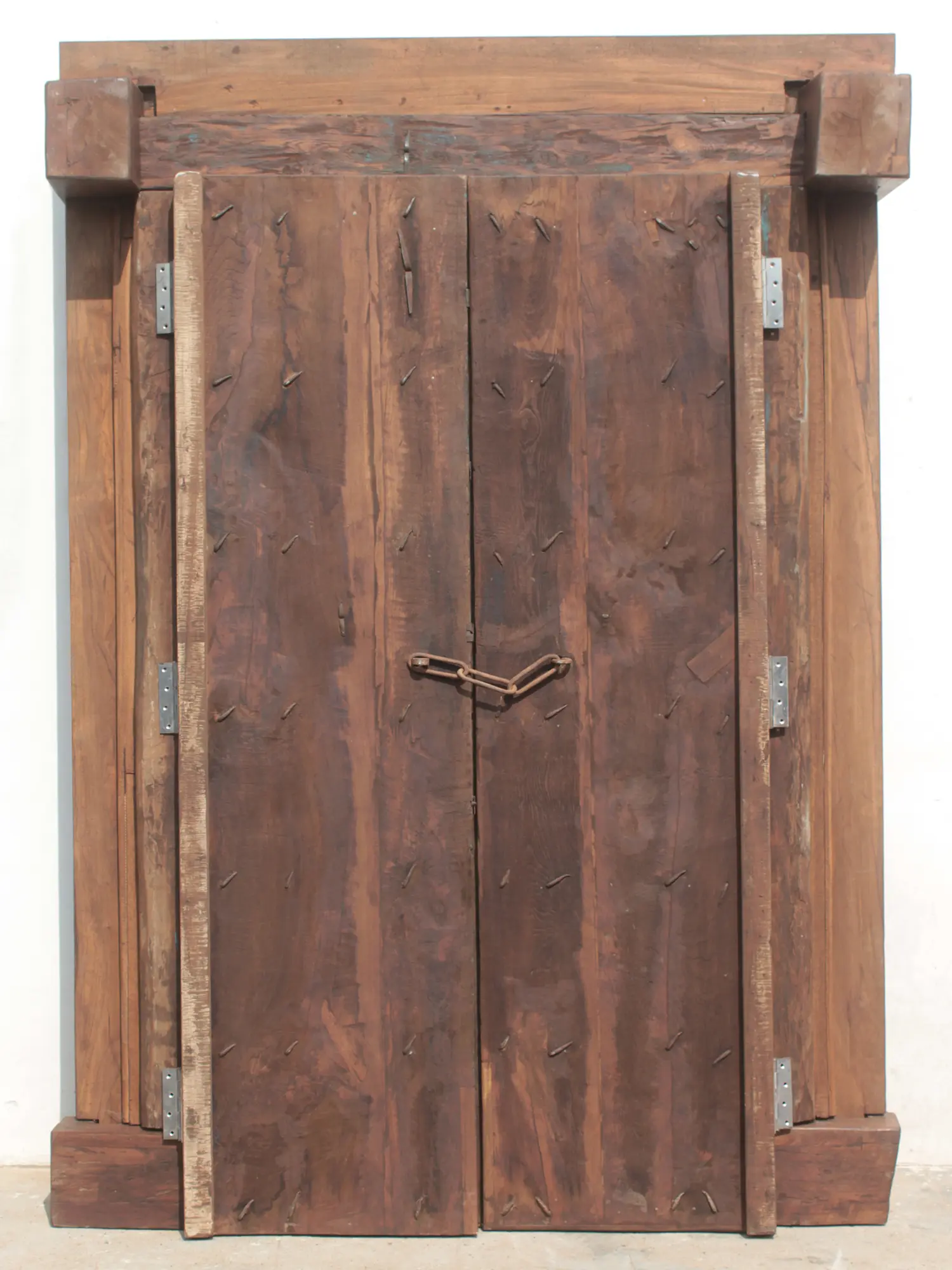 100" Large Vintage Hand Carved Solid Sal Wood Door With Frame