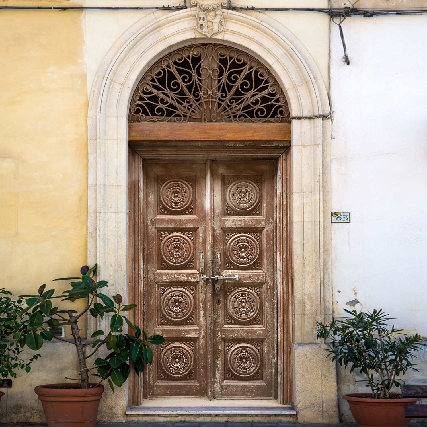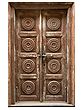 The door's surface is adorned with a series of meticulously carved circular motifs. Each circle features a detailed floral design, radiating elegance and sophistication. The design is repeated across the double door panels, creating a harmonious and visually stunning effect. The depth and detail of the carvings are exceptional, highlighting the skill and artistry of the original creators. The carvings are not just decorative; they add a layer of texture and dimension, creating a captivating interplay of light and shadow. Notice the subtle variations in the wood's tone and texture—a testament to its age and the passage of time.