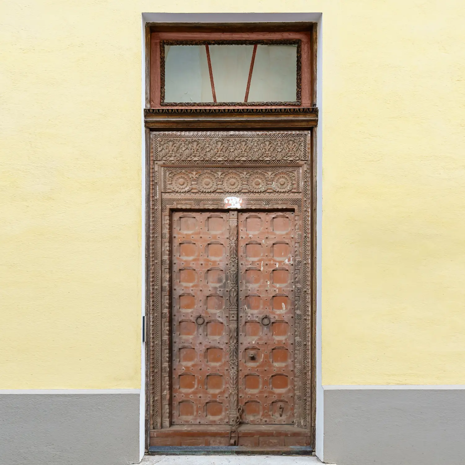 If you have a big palatial-like home, the entrance door should describe the mood of the entire house and thus should equate to the interior. Observe the finely carved wooden frame that is decorated with ethnic motifs and patterns that add an element of traditionality to this vintage entrance door. The main door has circular cut designs with metal dots attached to them. It also bears two round metallic handles to open or close the doors. The door has been given a rough polish to maintain the rustic and raw look of the antique masterpiece.