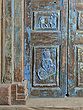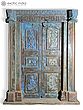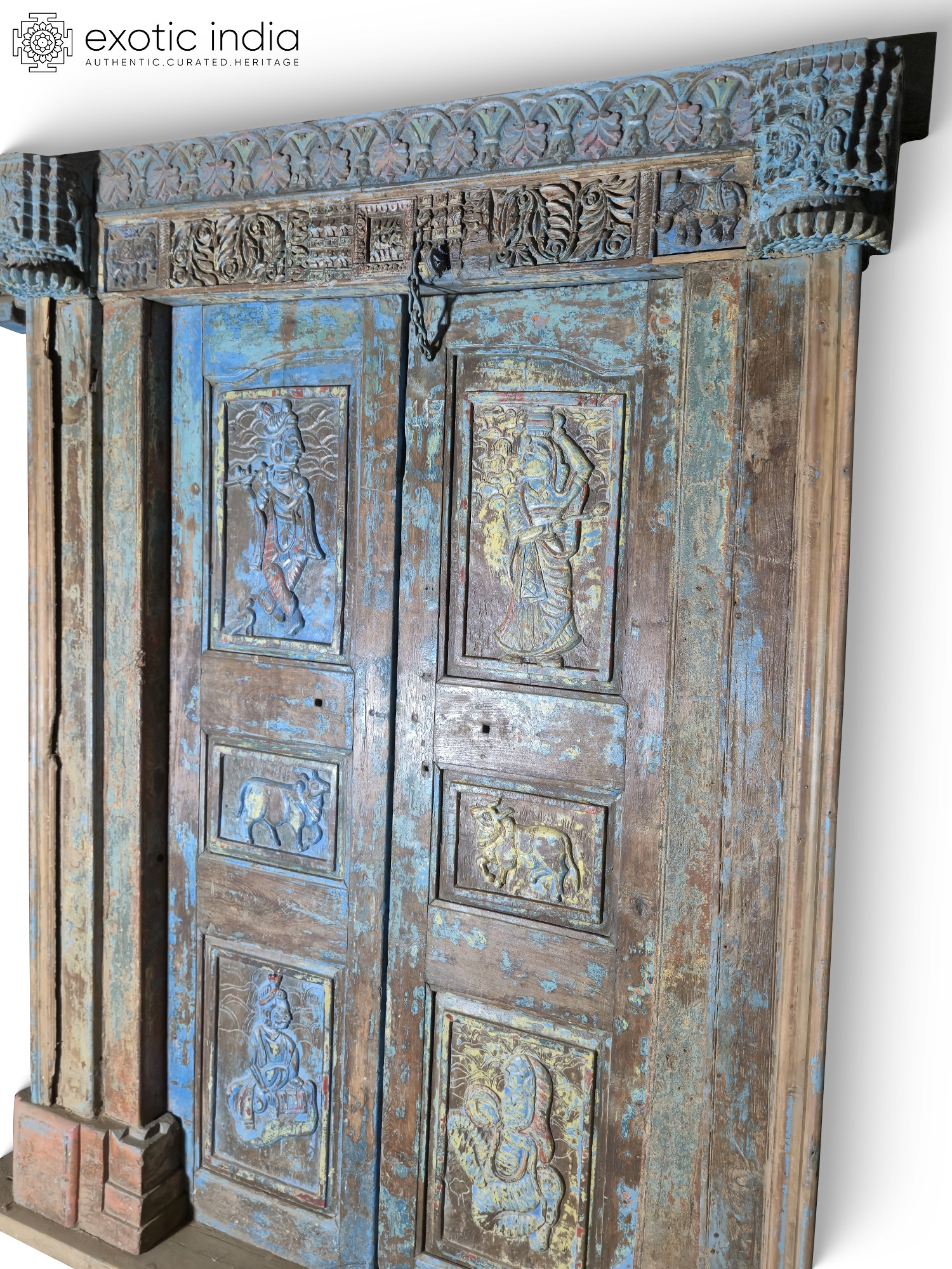 This magnificent door is a testament to the rich artistic heritage of India, offering a unique fusion of spiritual narrative and artisanal skill. Hand-carved from solid wood, it stands as an imposing and captivating centerpiece, ready to transform any space into a haven of history and devotion. The distressed, weathered finish, characterized by layers of faded blues, greens, and earthy tones, evokes a sense of timelessness and antiquity, as if it has witnessed centuries of stories unfold.