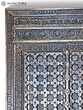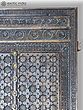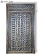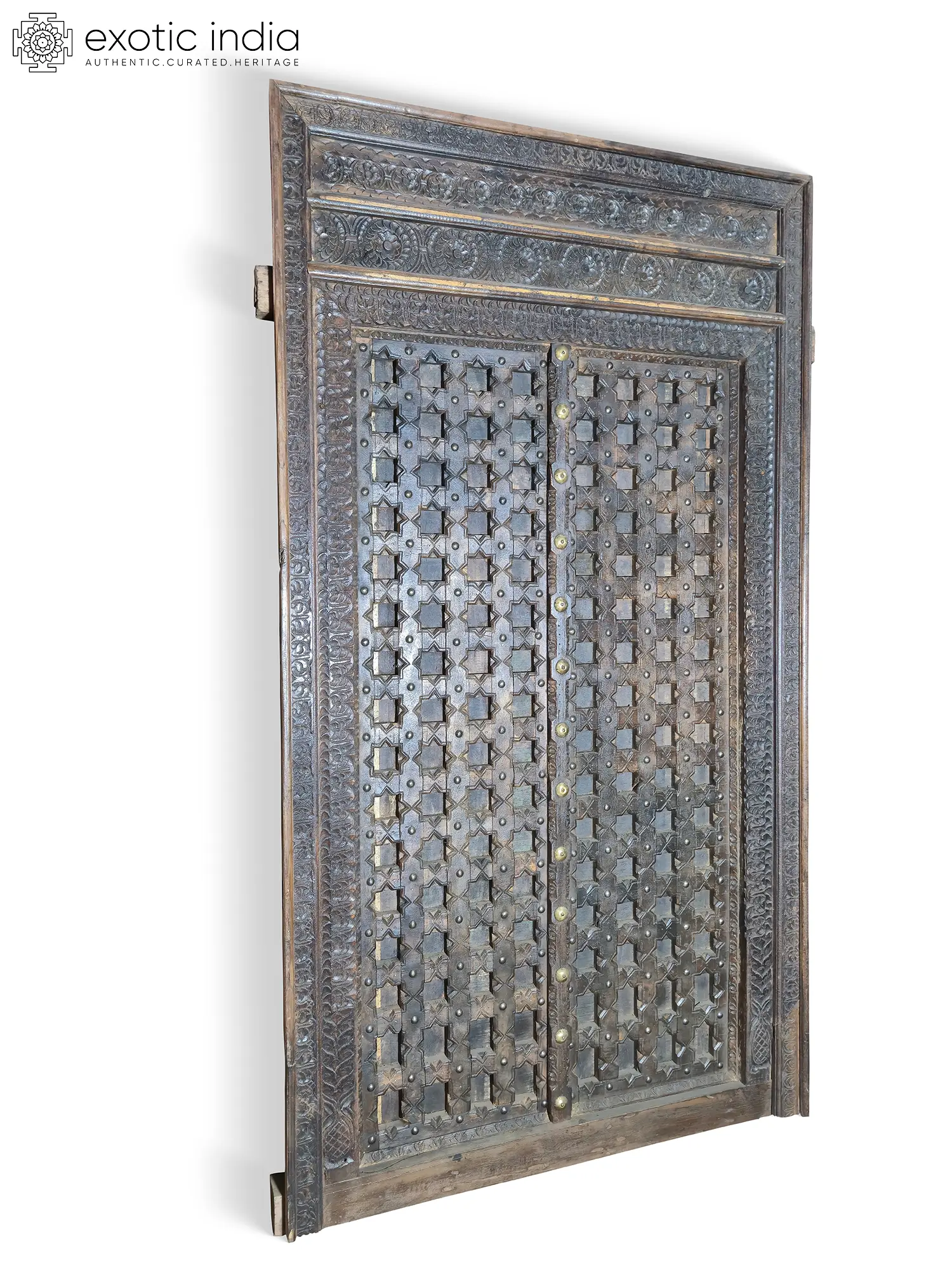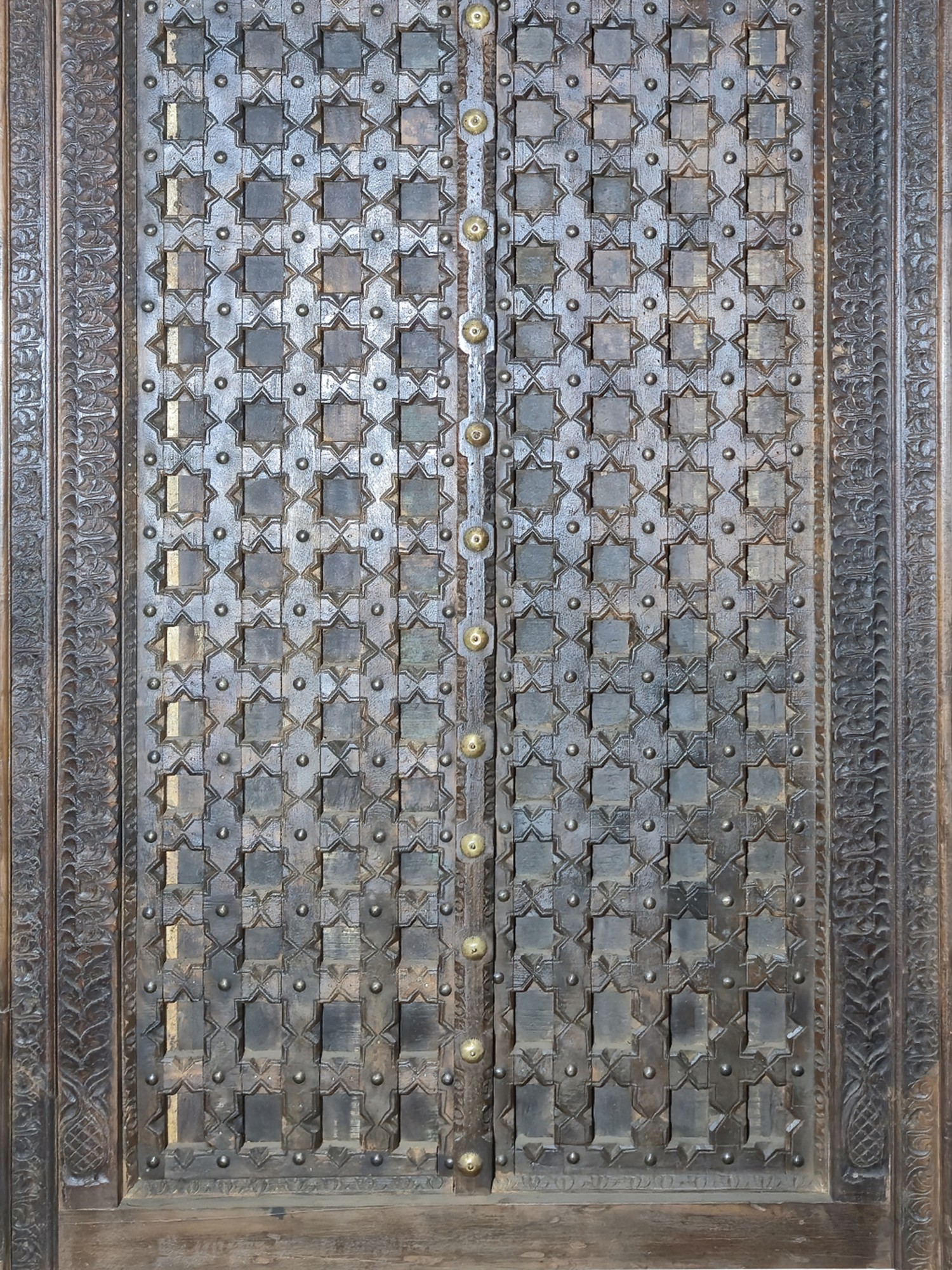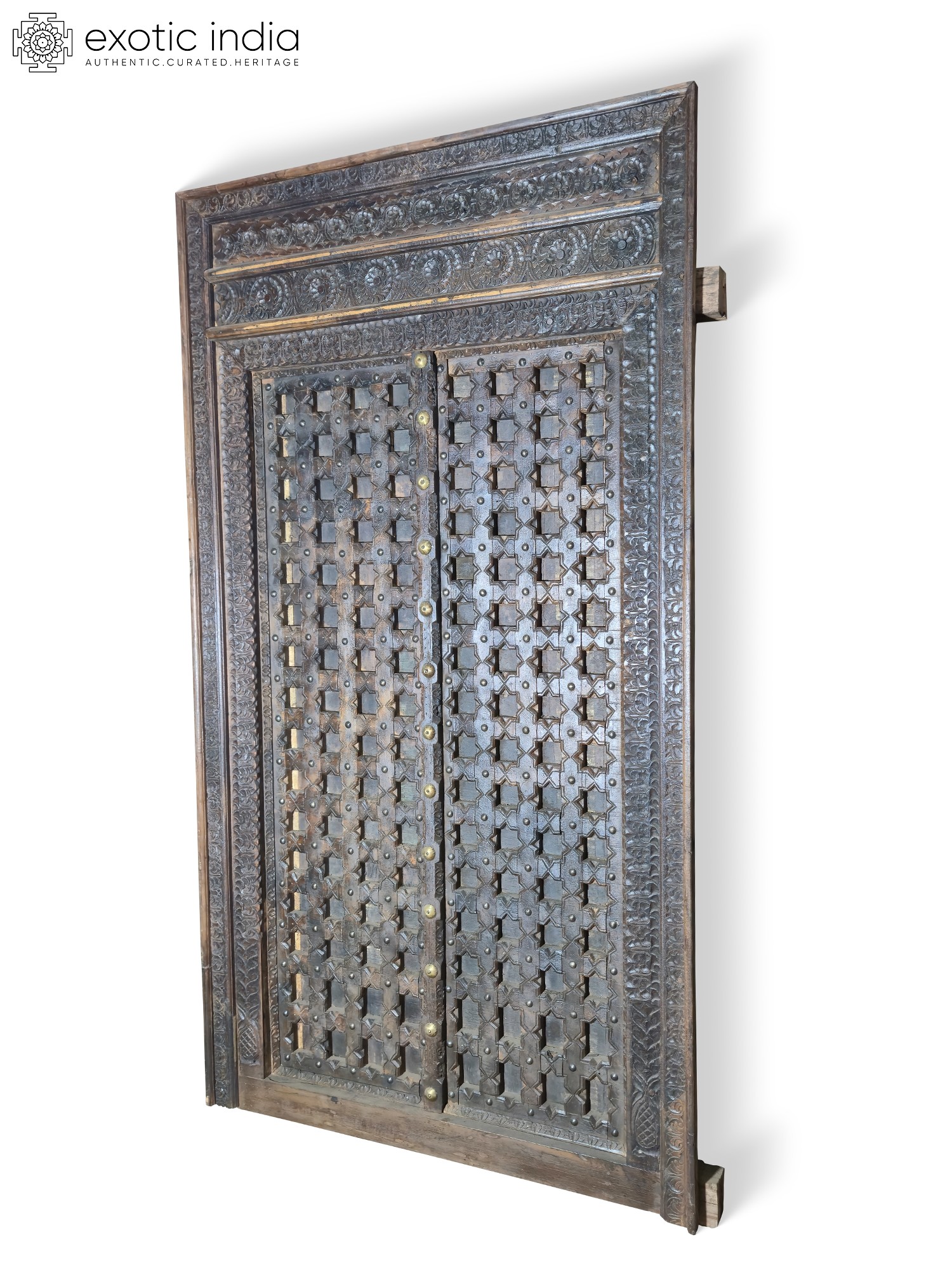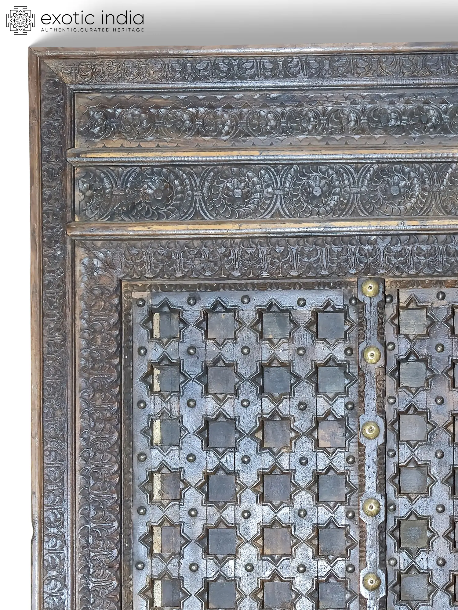 The true marvel of this door lies in its elaborate detailing. The frame itself is adorned with finely chiseled motifs, displaying a captivating blend of floral elements and geometric borders. These detailed carvings create a sense of depth and sophistication, hinting at the meticulous artistry involved. The central panels are a breathtaking display of geometric tessellations. Numerous interlocking star-shaped patterns, meticulously carved and outlined with decorative brass studs, create a mesmerizing visual rhythm. Each star, with its precise angles and symmetrical form, is a testament to the carver's skill and dedication to creating a harmonious and visually striking design. The repetition and variation within this geometric arrangement evoke the spirit of traditional Indian Islamic art, known for its abstract beauty and mathematical precision.
