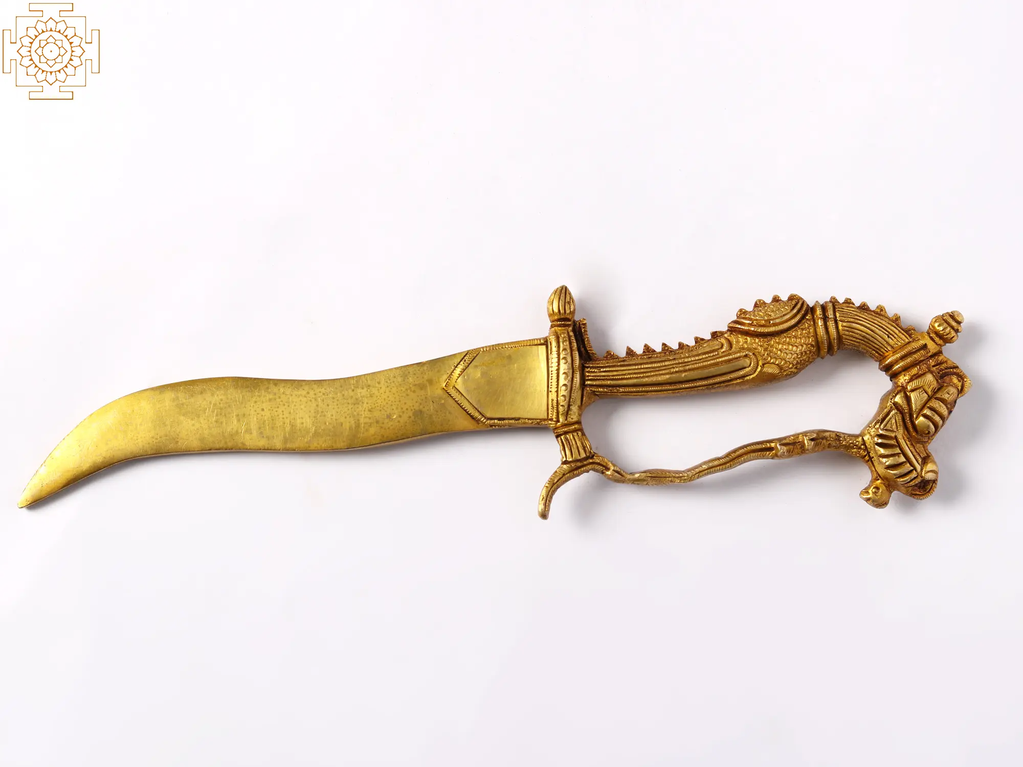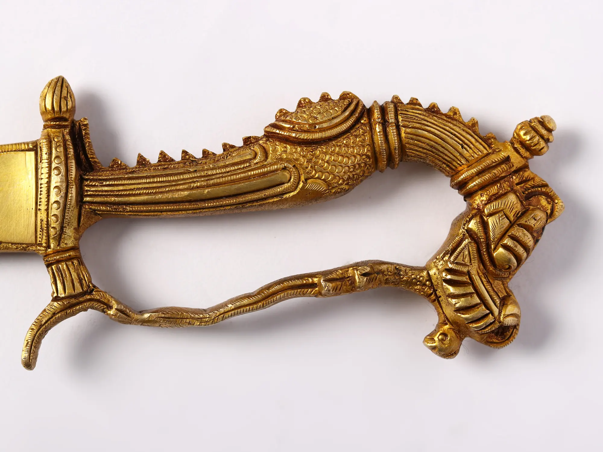 This Brass Makar Yali Design Dagger is an exceptional work of utilitarian art. This elegant dagger has elaborate designs like a Makar Yali, demonstrating superb craftsmanship. Beyond its utilitarian use, it embodies the spirit of Makar Yali, a mythical creature like a crocodile and a lion that represents power, strength, and protection.