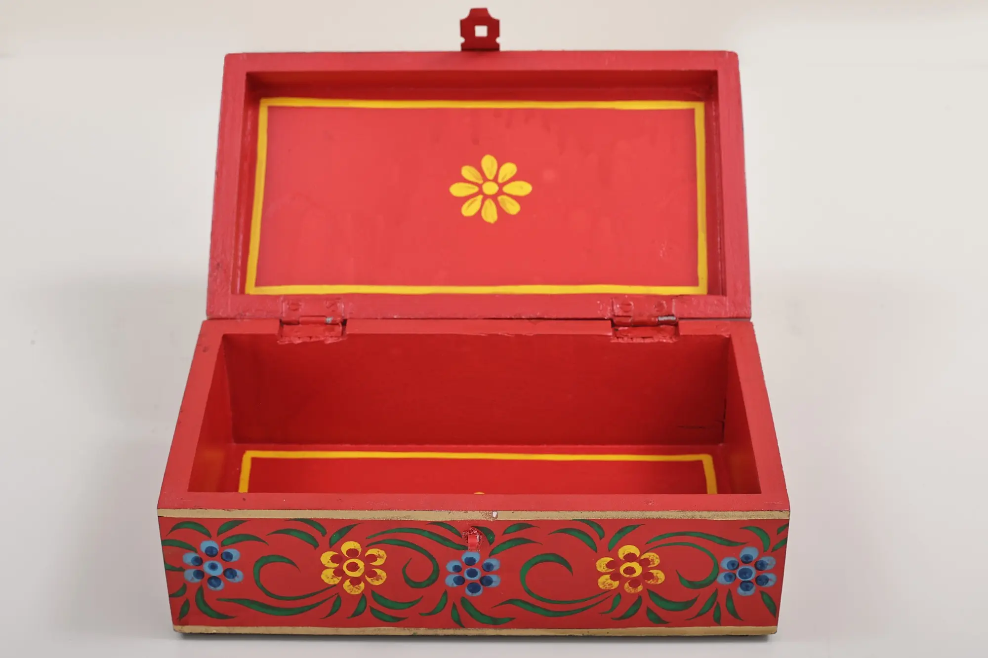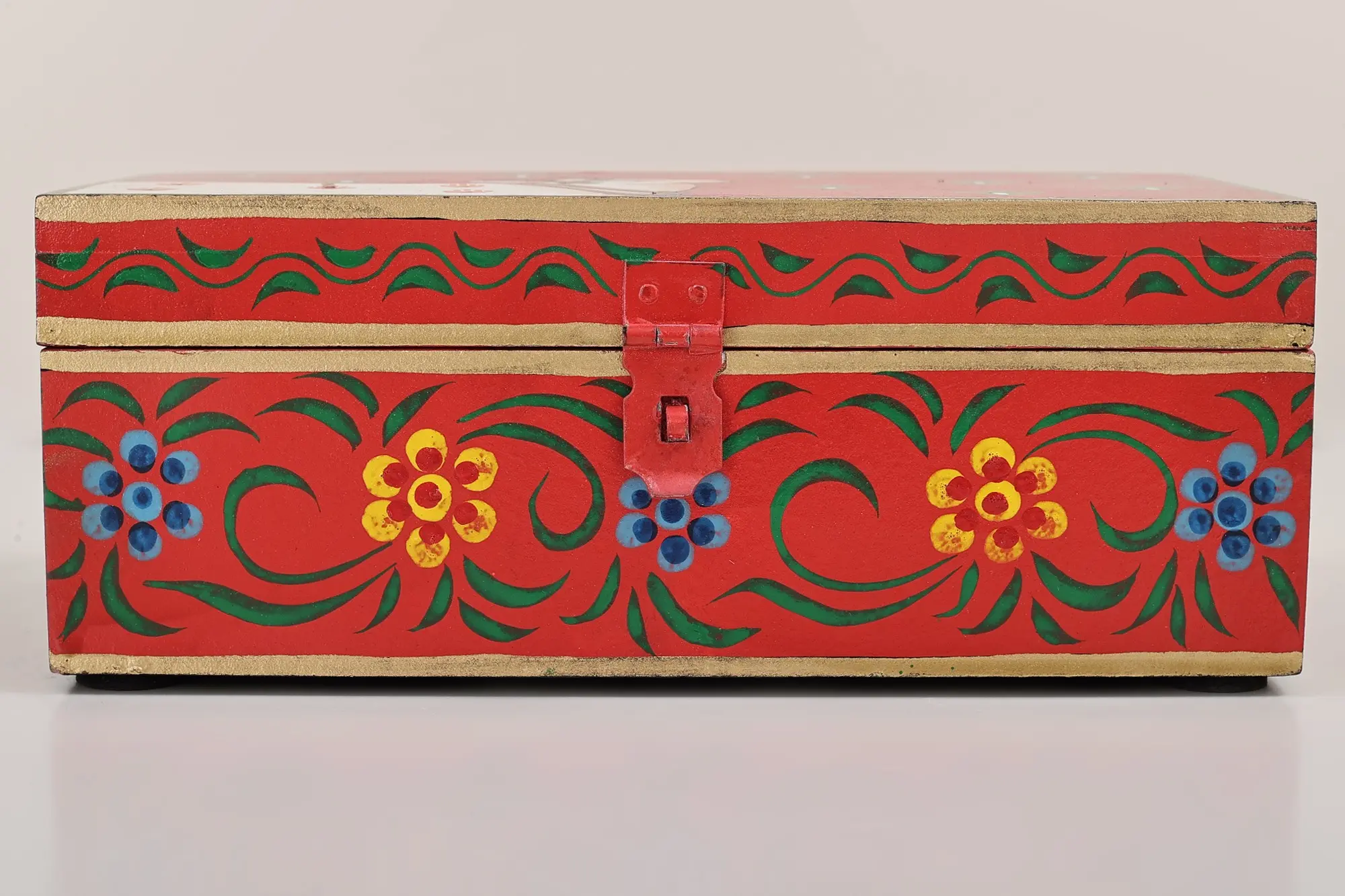 This Hand-Painted Cow on Wooden Box is a tribute to the artistry and spirituality of the age-old tradition of Pichwai art. Crafted from Mango wood, this vibrant box features a bright red base adorned with a Pichwai-style painting of a sacred cow. The intricate detailing includes symbolic handprints on the cow's body, representing Lord Krishna's protective presence over these revered animals. The marriage of traditional Pichwai art with the functional elegance of a wooden box creates a piece that not only captivates the eye but also tells a spiritual narrative. Embrace cultural richness and divine symbolism with this exquisite and meaningful creation.