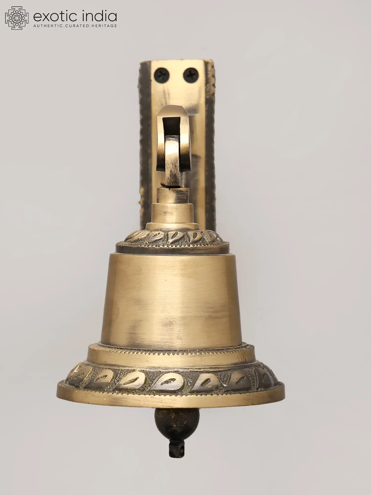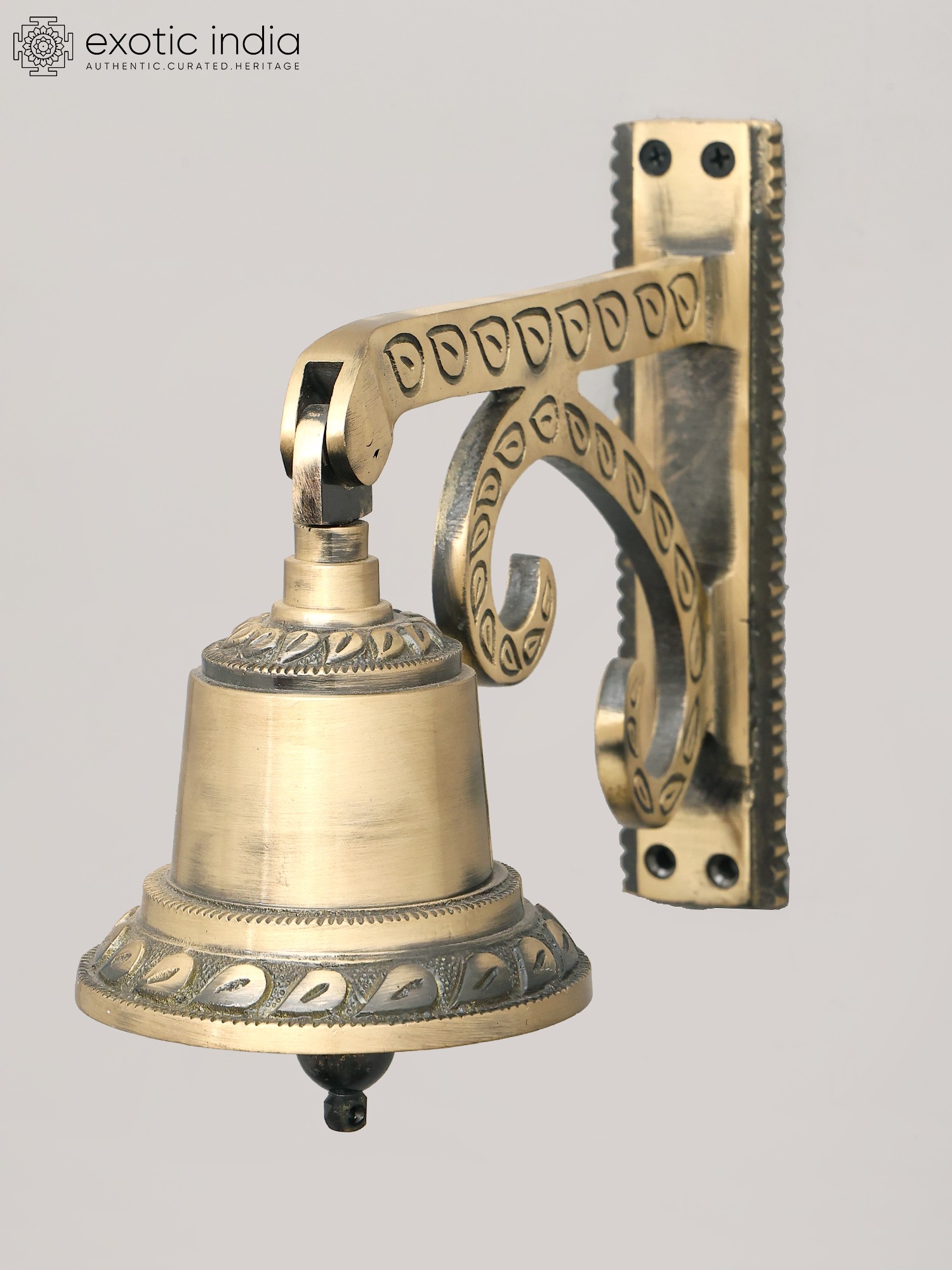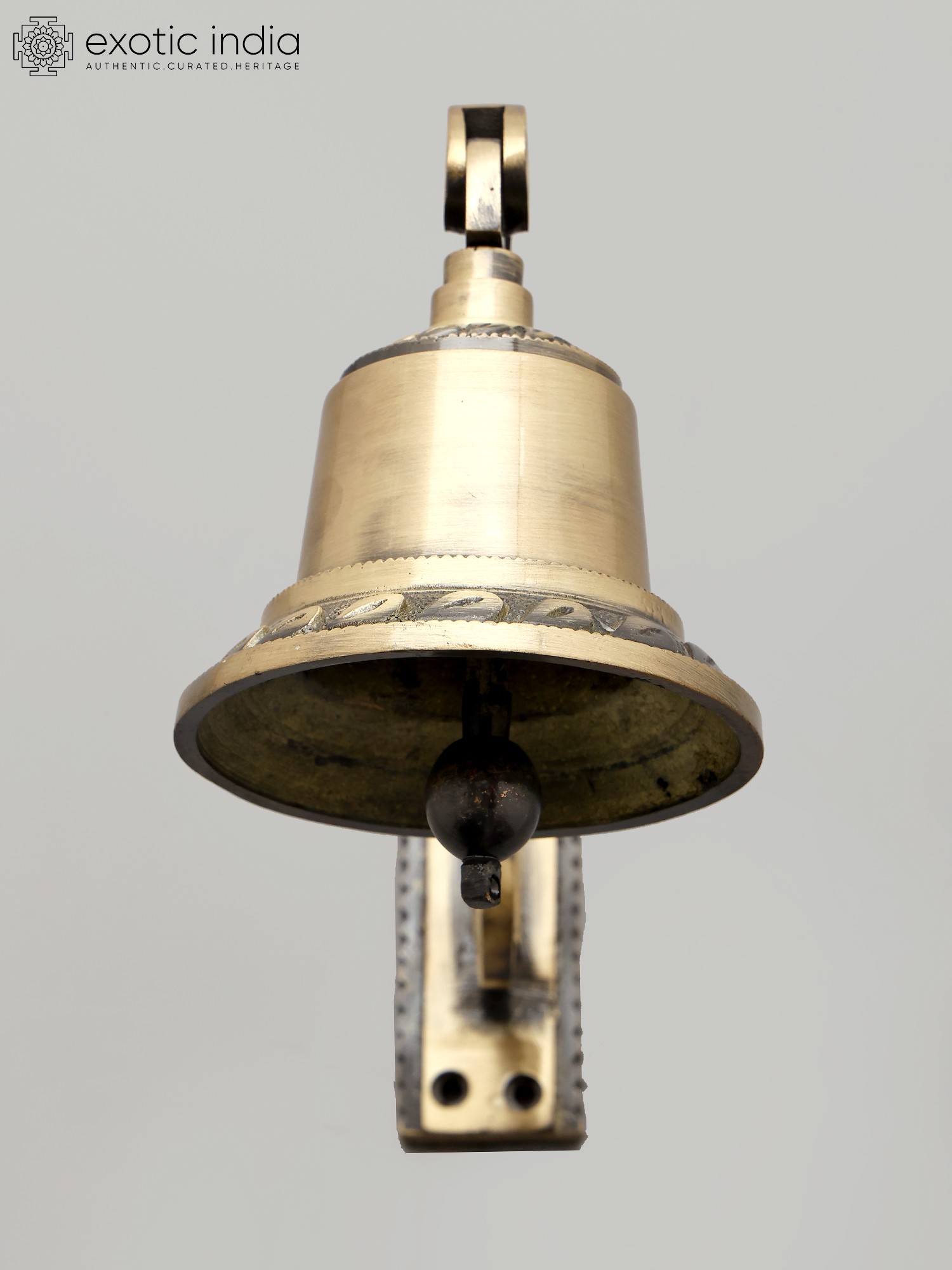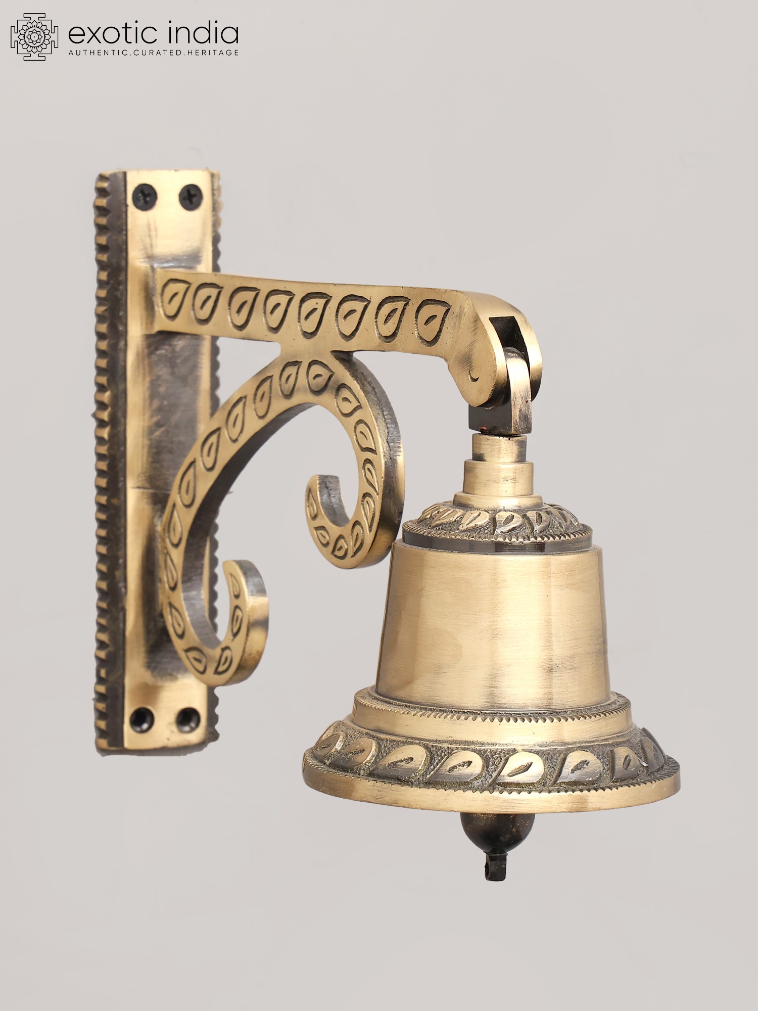 The bell itself presents a classic silhouette, its form enhanced by delicate leaf motifs that encircle its base, lending an organic grace. The supporting bracket, featuring a patterned flourish and a series of raised circles, offers a striking contrast and structural integrity. When mounted, its dimensions of approximately 6.5 inches in height, 9.5 inches in width, and 4 inches in length ensure it commands attention without overwhelming the eye.