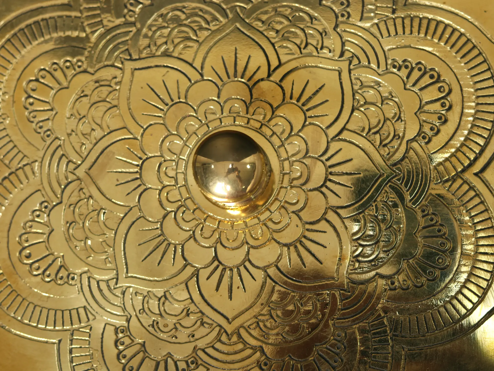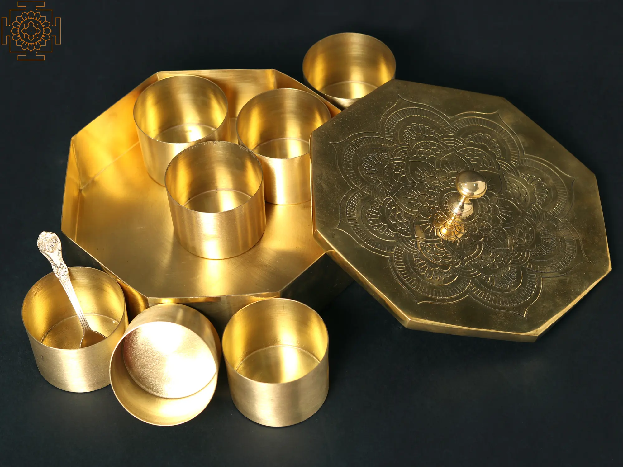 Spices have a sacred place in Indian Cuisine. They are stored and preserved for a longer period of use. There are small containers kept in kitchens to store a small number of spices for ease of use. This timeless Octagonal Brass Masala Bo is a culinary treasure that elevates spice organization to an art form. It contains seven exquisite small masala containers, each adorned with a golden shine that exudes luxury. A delicate spoon accompanies the box to make the spreading of the spice smooth. The cover of the spice box contains a dainty handle and an enchanting lotus motif gracefully etched upon it. Embellished with intricate engravings, this masala box transcends functionality, becoming an opulent heirloom for generations to cherish.
