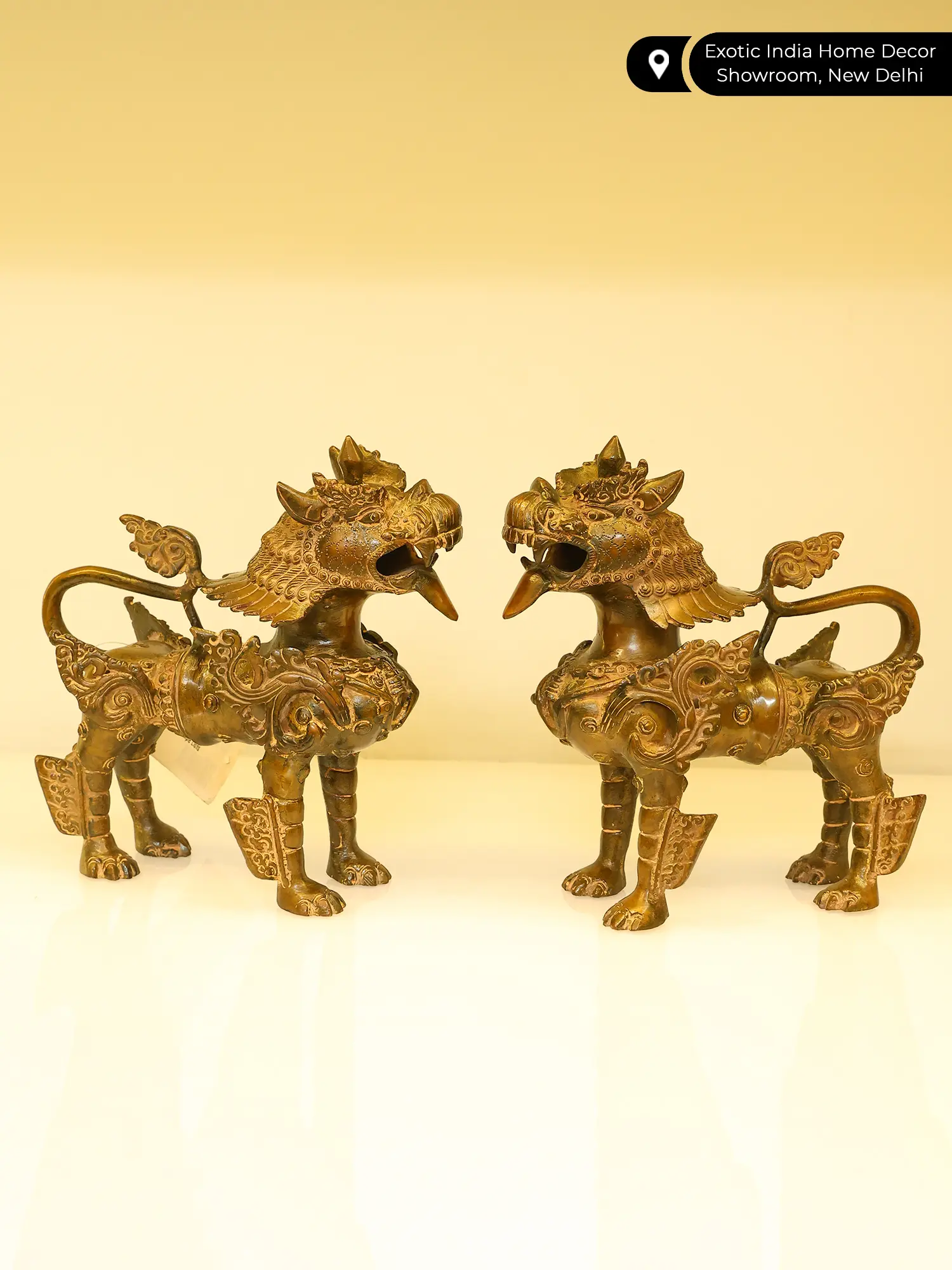 The choice of brass as the material for these temple lions is significant. Brass, with its warm, metallic sheen and durability, has long been a favored medium for religious and decorative objects in many cultures. The metal's ability to hold fine detail allows for the intricate patterns and textures that adorn these lions, from the swirling designs on their bodies to the sharp, defined edges of their claws and horns. The patina achieved through the casting and finishing process lends a sense of age and authenticity, suggesting a heritage passed down through generations. Each nuance of their form, the texture of their fur, the curve of their tails, and the sharp angles of their decorative elements, has been meticulously rendered to create a truly authentic representation.