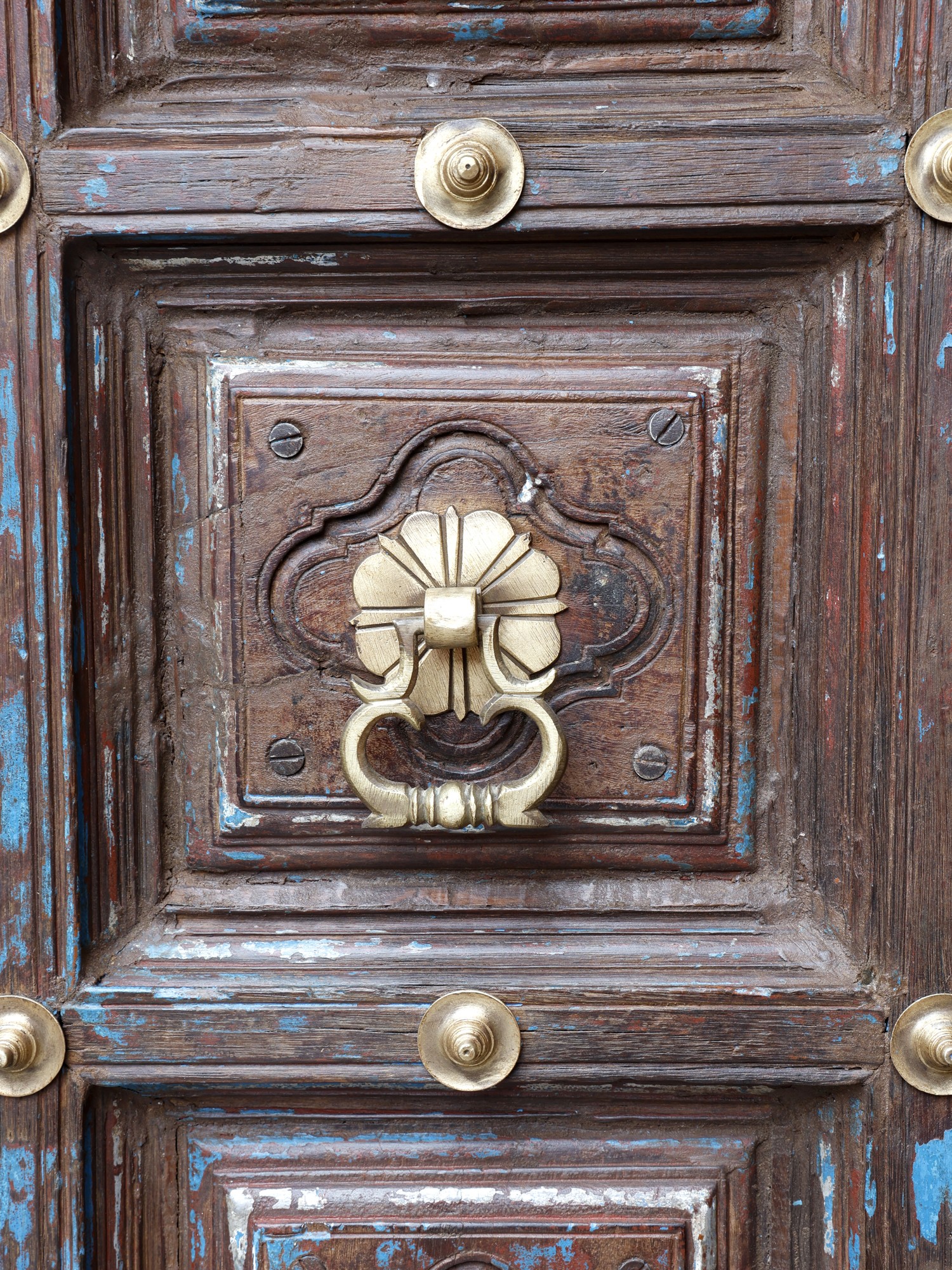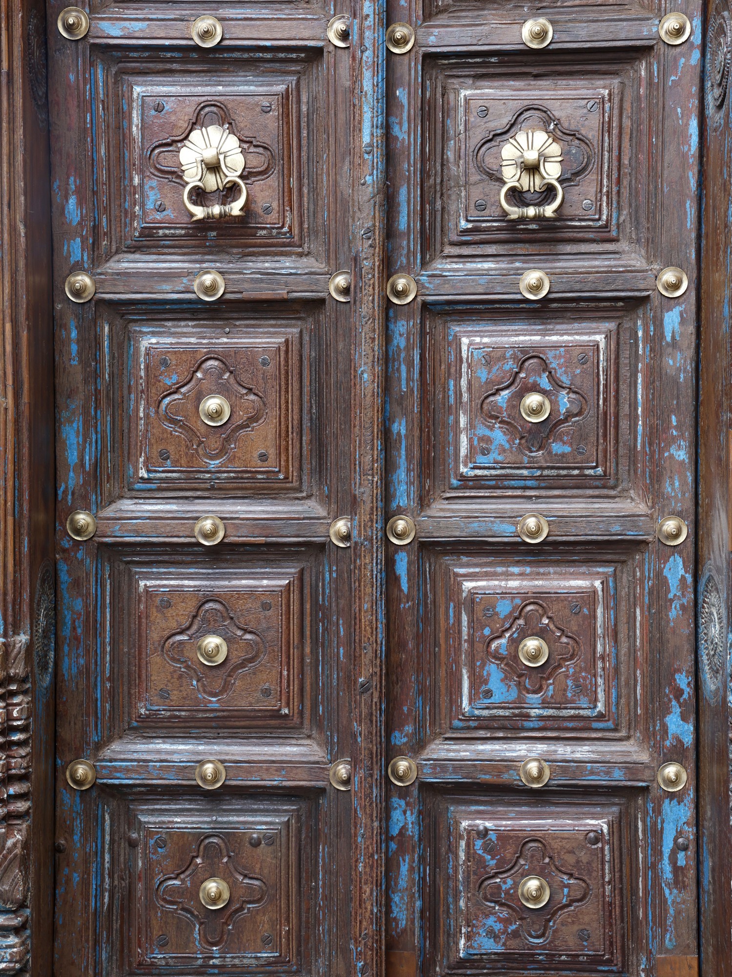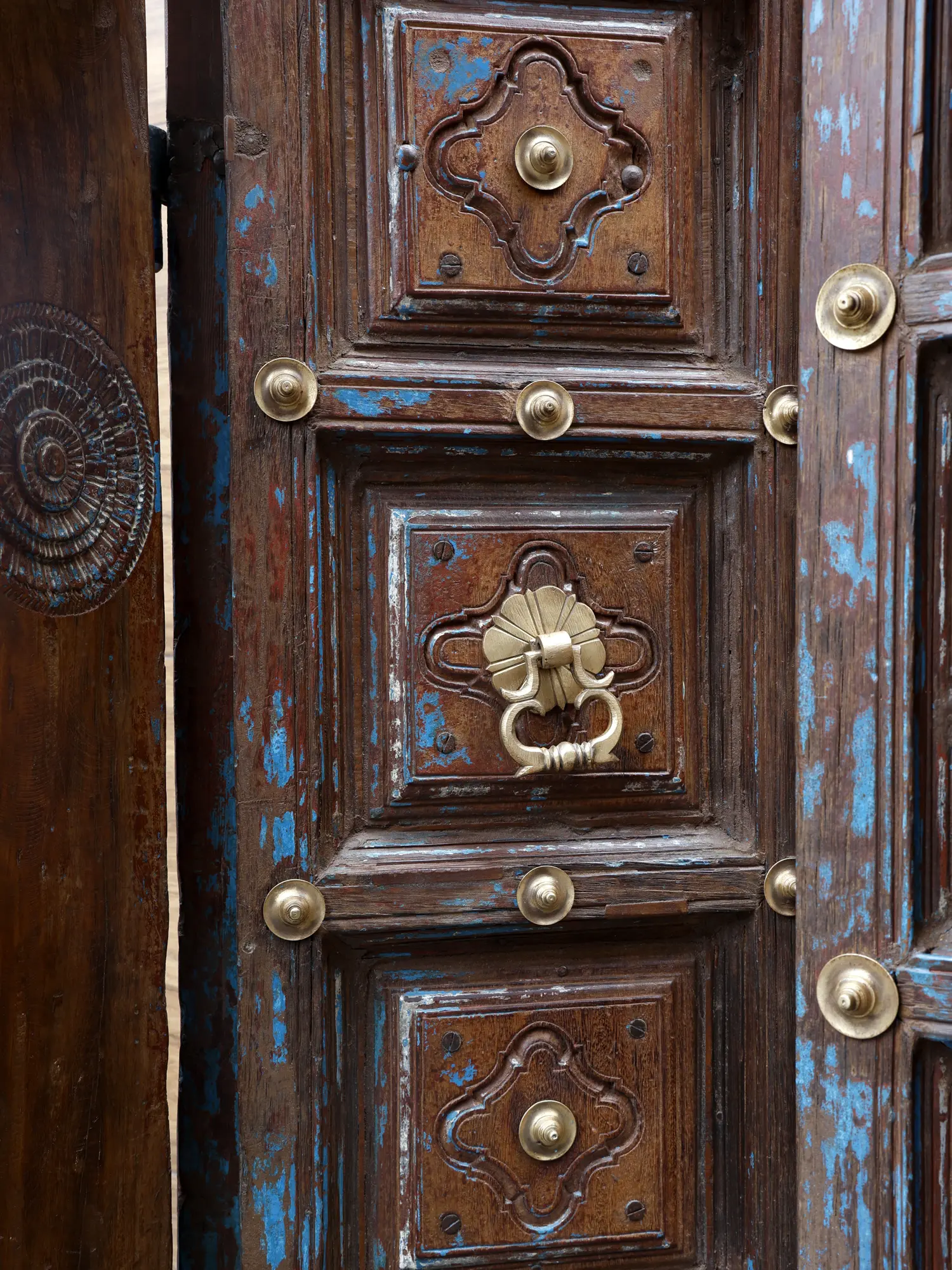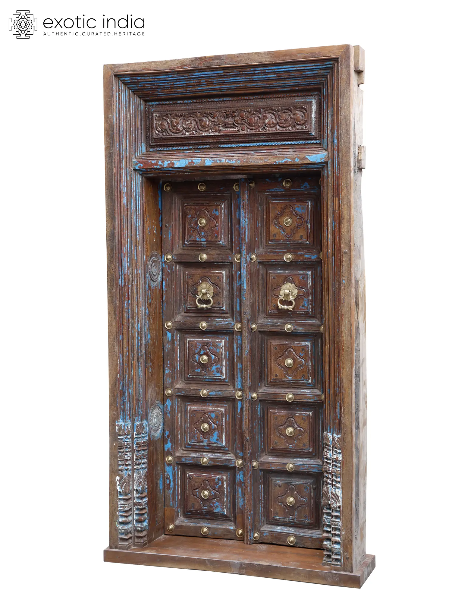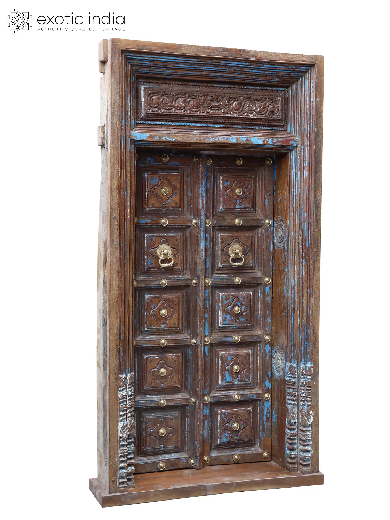 Traces of blue paint on the body suggest its origin from the famed Blue City of India, Jodhpur, known for its vibrant and distinctive architecture. This door not only reflects cultural richness but also promotes sustainability by refurbishing old doors, preventing the need to cut new trees.