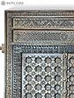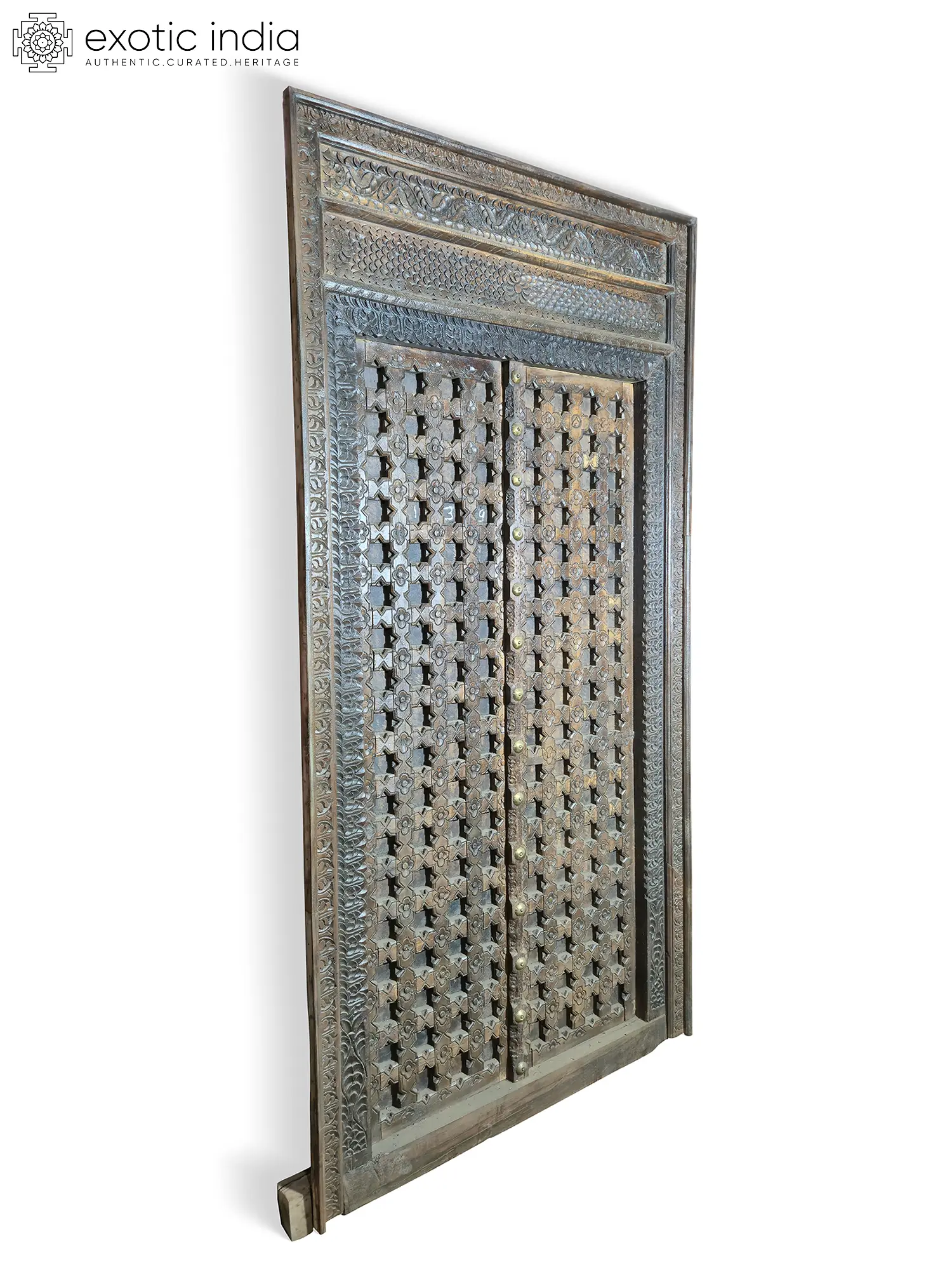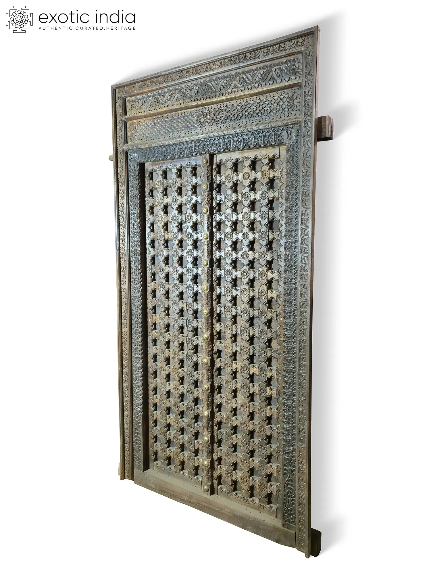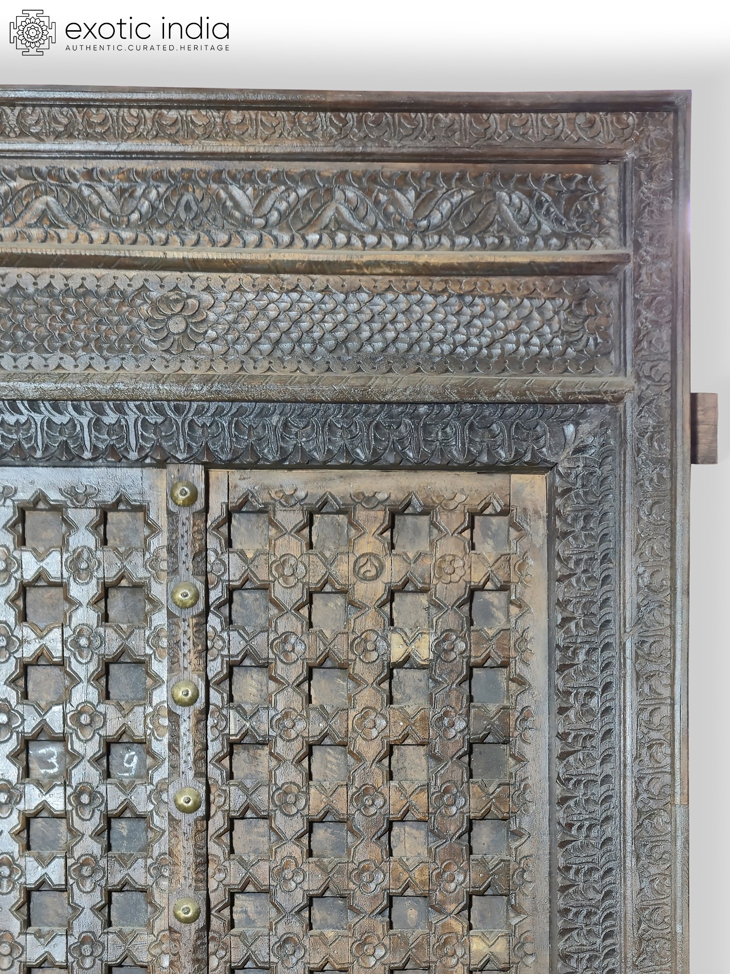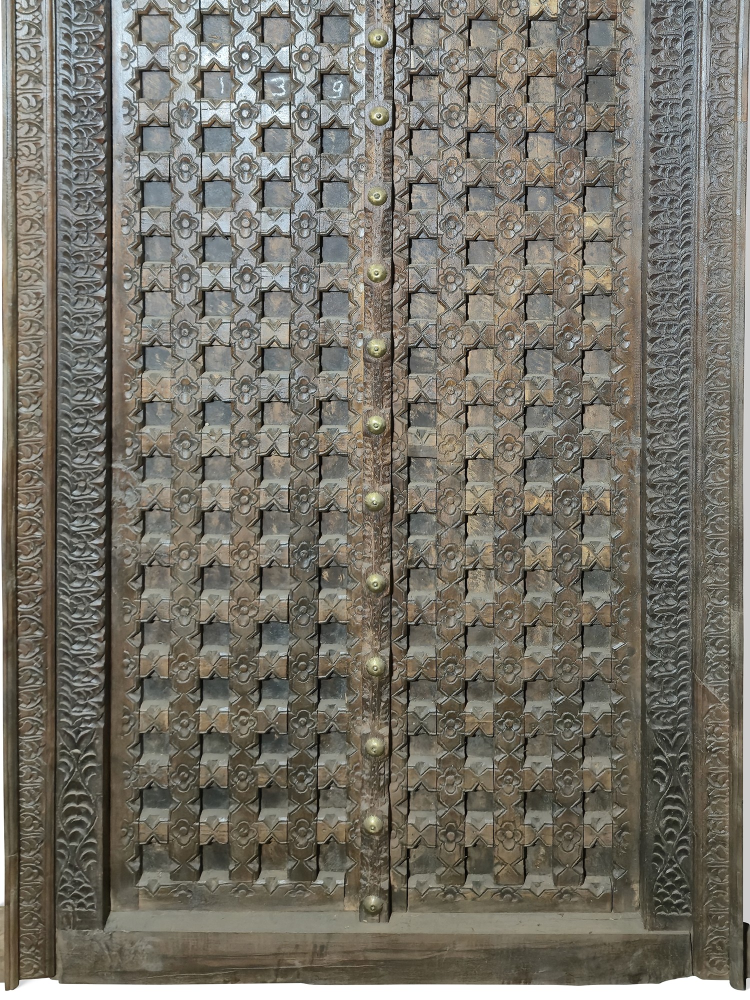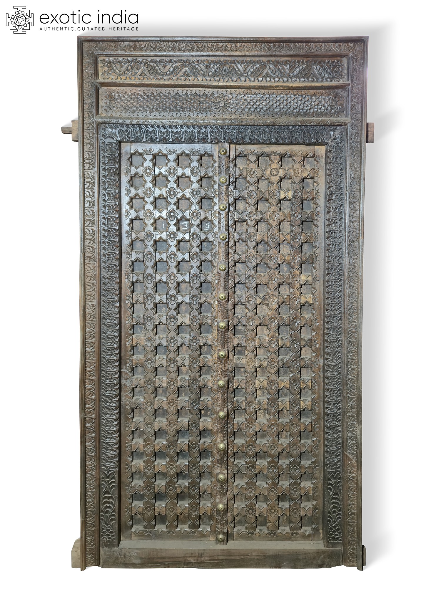 The surface of this door is a canvas of exquisite artistry. The upper section features broad bands of deeply carved floral patterns, showcasing delicate petals and swirling vines that flow seamlessly. These motifs are bordered by textured strips, adding depth and visual interest. As your gaze descends, the door reveals its most captivating feature: the double doors, each pane adorned with a mesmerizing geometric lattice. Within this intricate grid, quatrefoil floral designs bloom, meticulously carved into the solid wood, creating a rhythmic and captivating visual effect. The repetition of these floral elements within the geometric framework speaks to a profound understanding of symmetry and balance in traditional Indian design. The brass hardware, visible as subtle studs, adds a touch of rustic elegance and hints at the door's functionality.