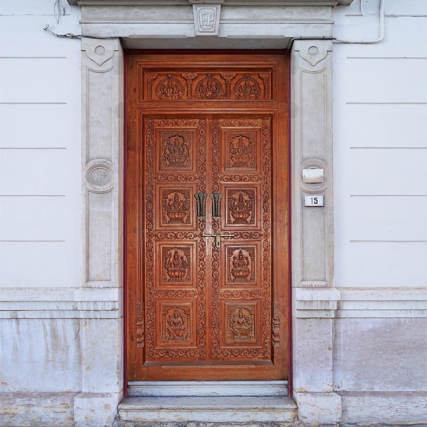 The wooden door comes with a traditional Kundi (latch) whose muted metallic sheen matches the antiquated appearance of the door. A significant degree of detailing and artistic experience that went into the making of these doors can be understood from the seamlessness of the work done on individual carvings of the Ashtalakshmi, where each one of them is presented with distinctive attributes and exquisite forms.