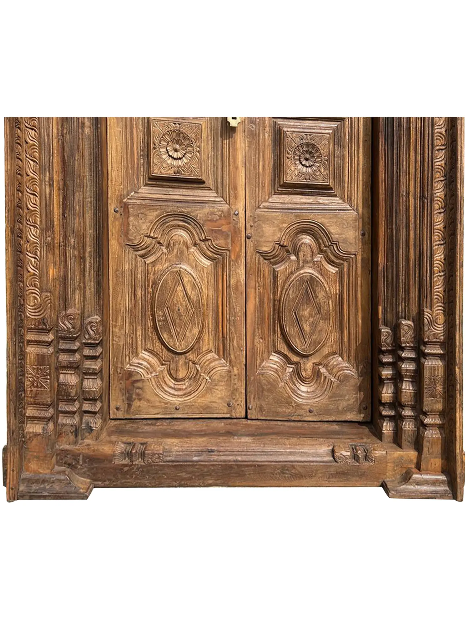 The rich, warm tones of the wood showcase the depth and character that only time can create. Delicately carved floral motifs grace the header, adding a touch of ornate elegance. The intricate border design further enhances its visual appeal, drawing the eye to the meticulous attention to detail. The door panels themselves are adorned with geometric shapes, creating a captivating interplay of lines and curves. The weathered finish only adds to its authenticity, lending a sense of history and intrigue. Note the hand-forged hardware which is both functional and visually appealing.